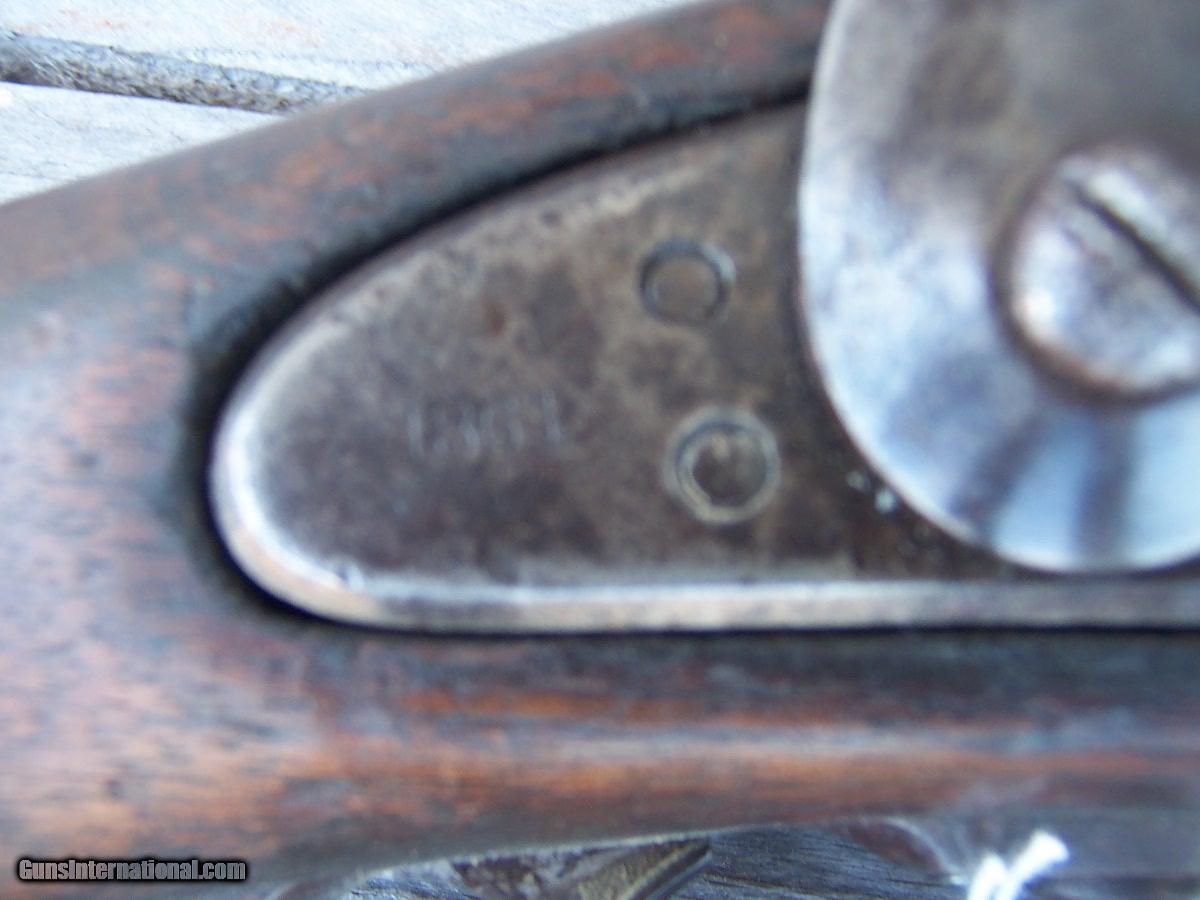Description: Here is a scarce 1861 dated Springfield musket that is most likely Confederate used. The enfield bayonet came with the gun and patina seems to match the musket. It has three initials on back side and usually Confederates do this. Brown patina with pitting at breech abscuring the date. VP and eaglehead are visible. The bore is now smooth and very good. Good early civil war musket that is very desirable with this date. SOLD |