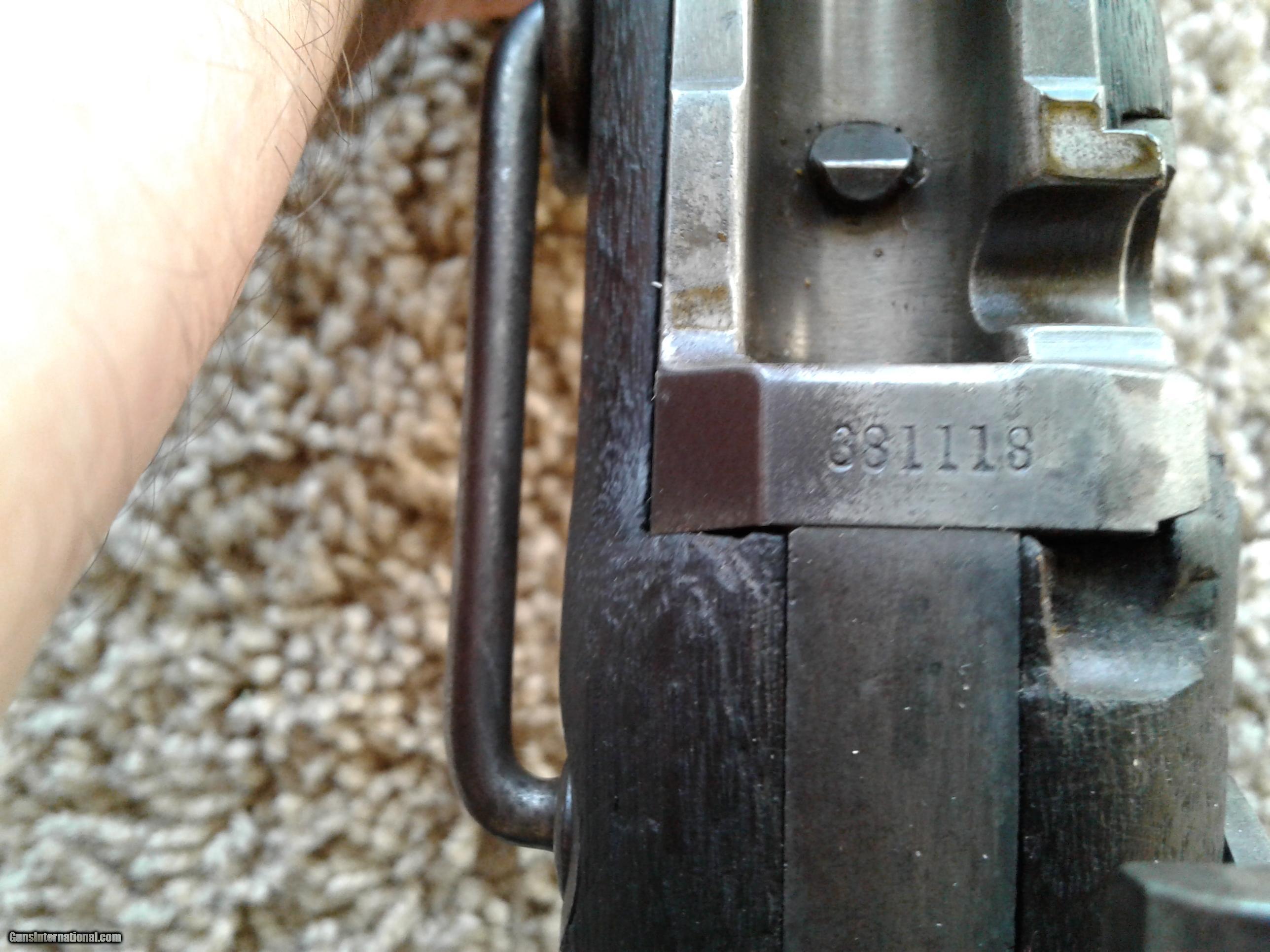 Description: Original Springfield 1884 Trapdoor calvary carbine. U.S. marked on buttplate. Manufactured in 1887; only 5,000 manufactered in that year. Eagle head proof and VP on barrel. Buffington rear sight marked with "C" to designated it as the carbine sight. Compartment in butt stock, there is a visible cartouche on the left side of the wrist and a circle "P" visible under the butt stock by the trigger guard. This rifle is in nice condition. THE BORE IS NEAR PERFECT! The metal finish is mostly a shiny dark brown patina. This carbine has been in a private collection. All metal stamping is crisp, and there is no pitting. All indications are this carbine has no replaced parts and is in pretty much a vintage state from the amory. 3 day inspection period as long as not fired, disassembled and returned in undamaged condition. Please see my reviews A+(95). SOLD Antique: Yes Manufacturer: Springfield Model: 1873 Trapdoor Saddle Ring Carbine Serial Number: 381xxx Caliber Info: .45-70 Bore: Excellent Chambers: Excellent Ejectors: Excellent Condition: Very Good Metal Condition: Very Good Wood Condition: Good to very good Bore Condition: Very Good Action: Trapdoor Sights: Buffington Carbine Manufacture Date: 1887 |