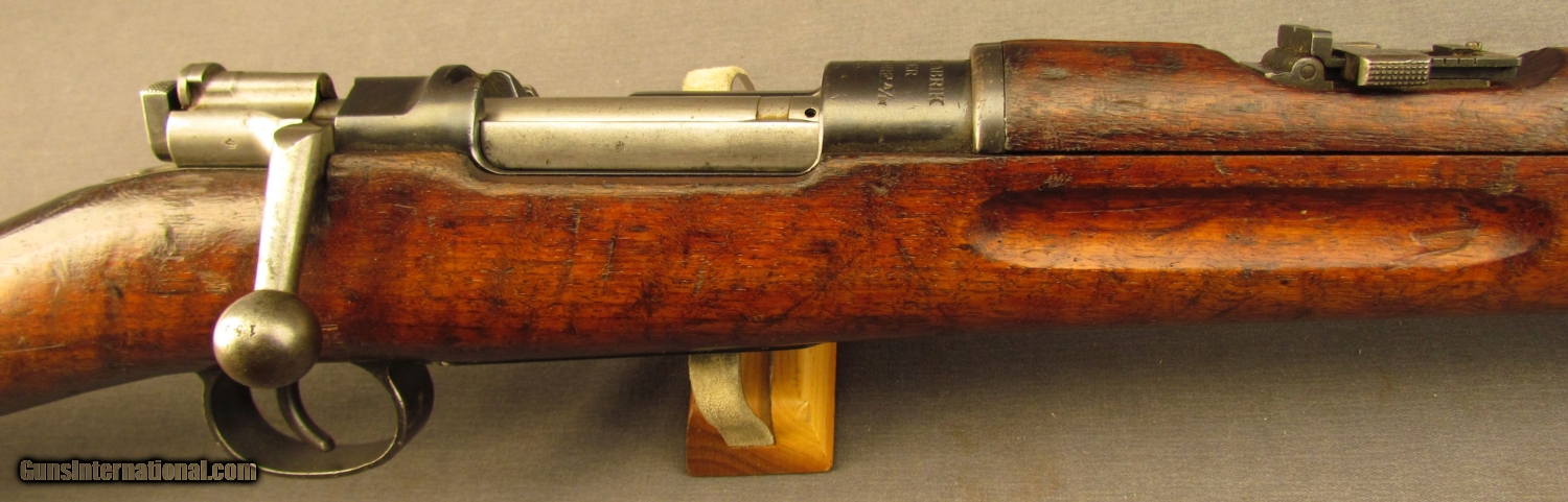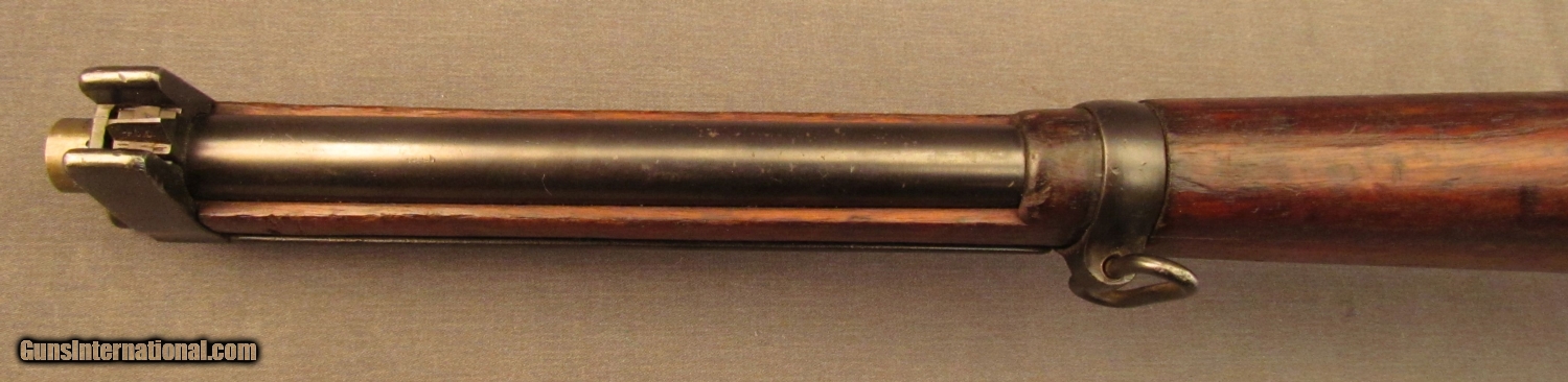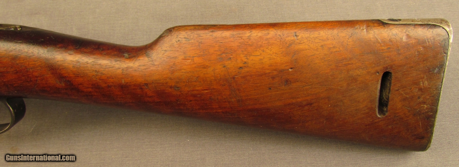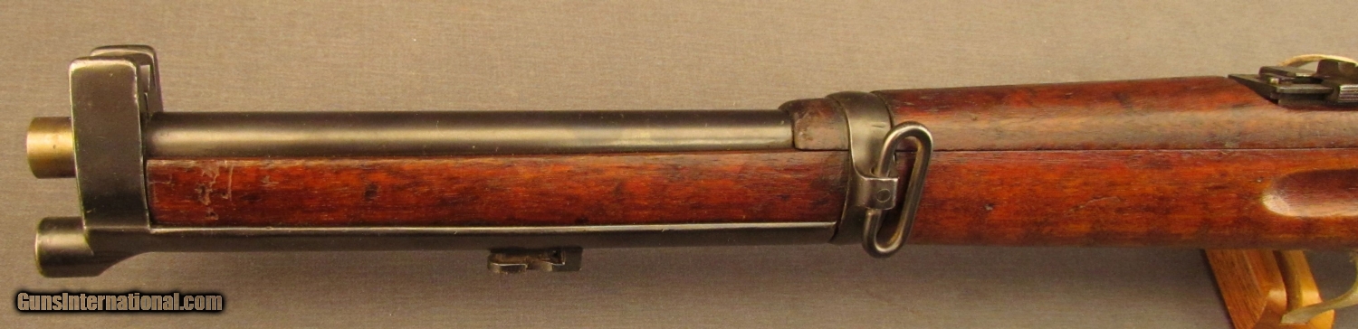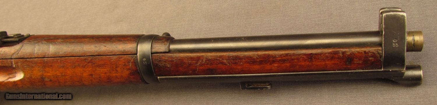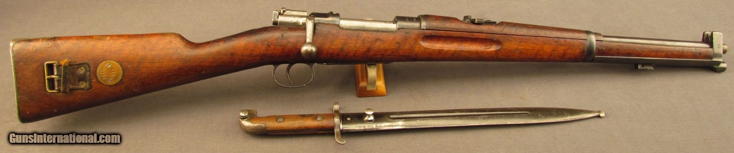 Description: Mauser built 1894 carbine built for Sweden and updated to the 94/14 when the bayonet attachment was added in 1914. This antique carbine shows a bright excellent 6.5 X 55 cal bore in the 18" extended barrel. The extension beyond the frost sight guard was added by the importers to allow these carbines to be imported. This example shows overall very good plus blue. It is all matching No 3555 the exception of the bolt which is a correct carbine bolt but shows number 159. The wood is all original showing normal usage marks. The right side shows the early M/94 marked 1 25 over No 408 (25th infantry Reg carbine #408. Included with this carbine is an excellent 94/14 bayonet and scabbard . An overall very good to excellent antique 94/14 Swedish Mauser carbine. Antique SOLD Antique: Yes Manufacturer: Mauser Model: 94/14 Serial Number: 3555 Caliber Info: 6.5mm Gauge Info: 6.5mm |