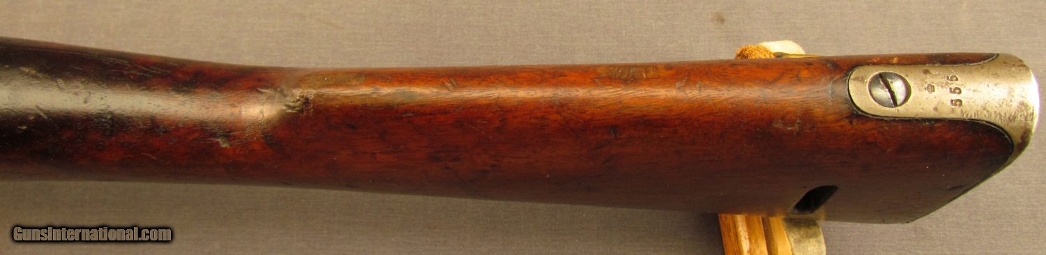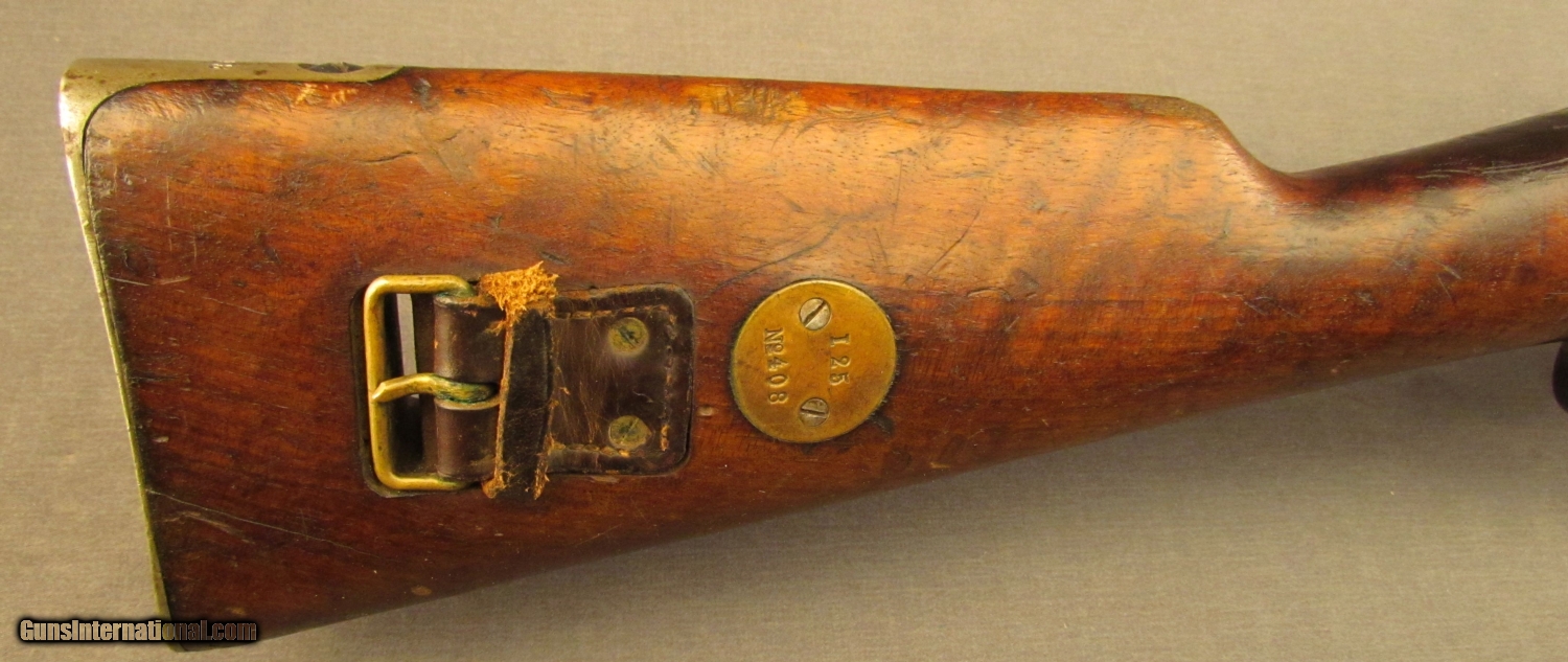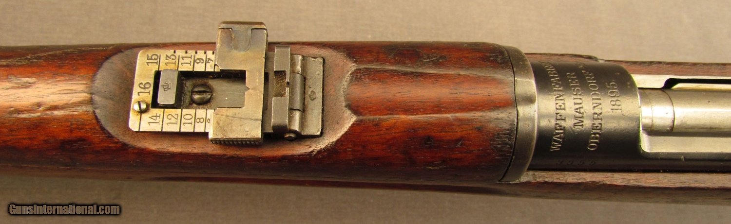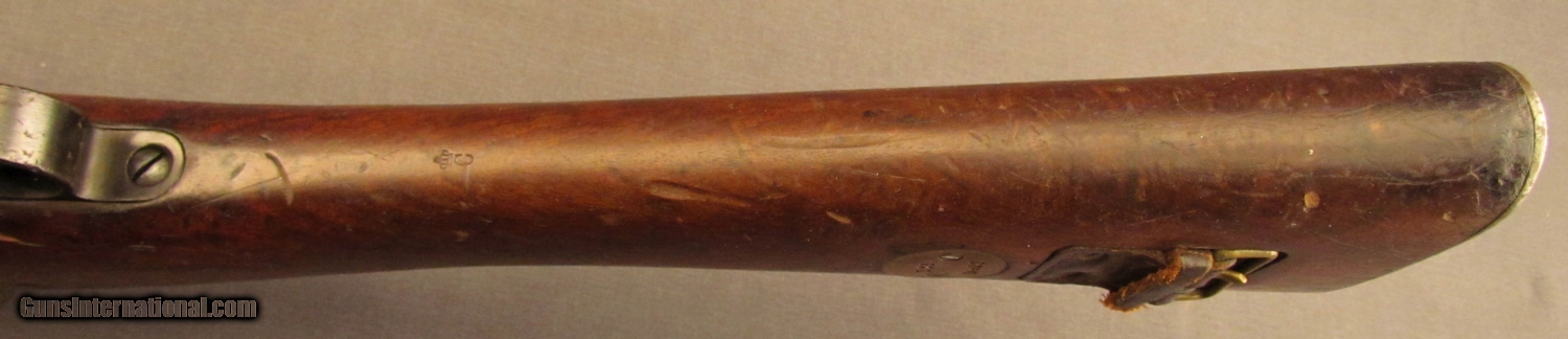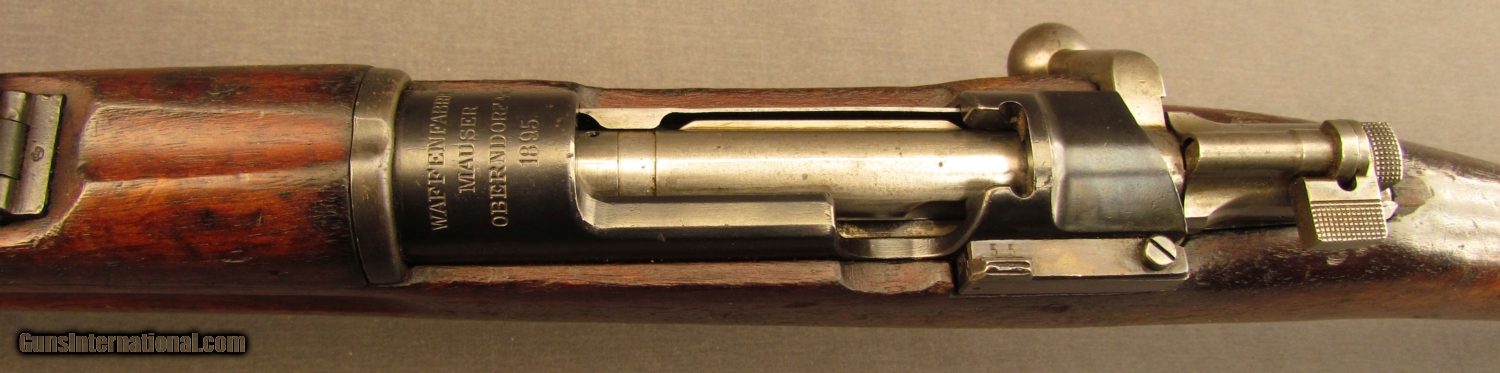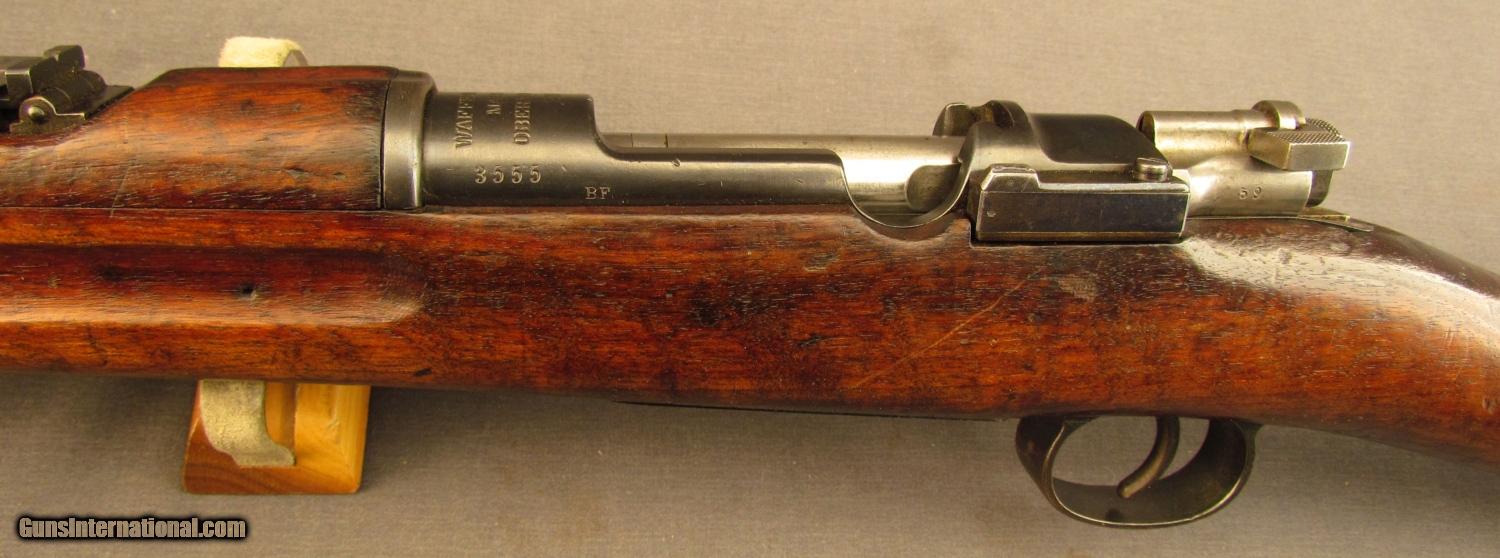 Description: Mauser built 1894 carbine built for Sweden and updated to the 94/14 when the bayonet attachment was added in 1914. This antique carbine shows a bright excellent 6.5 X 55 cal bore in the 18" extended barrel. The extension beyond the frost sight guard was added by the importers to allow these carbines to be imported. This example shows overall very good plus blue. It is all matching No 3555 the exception of the bolt which is a correct carbine bolt but shows number 159. The wood is all original showing normal usage marks. The right side shows the early M/94 marked 1 25 over No 408 (25th infantry Reg carbine #408. Included with this carbine is an excellent 94/14 bayonet and scabbard . An overall very good to excellent antique 94/14 Swedish Mauser carbine. Antique SOLD Antique: Yes Manufacturer: Mauser Model: 94/14 Serial Number: 3555 Caliber Info: 6.5mm Gauge Info: 6.5mm |