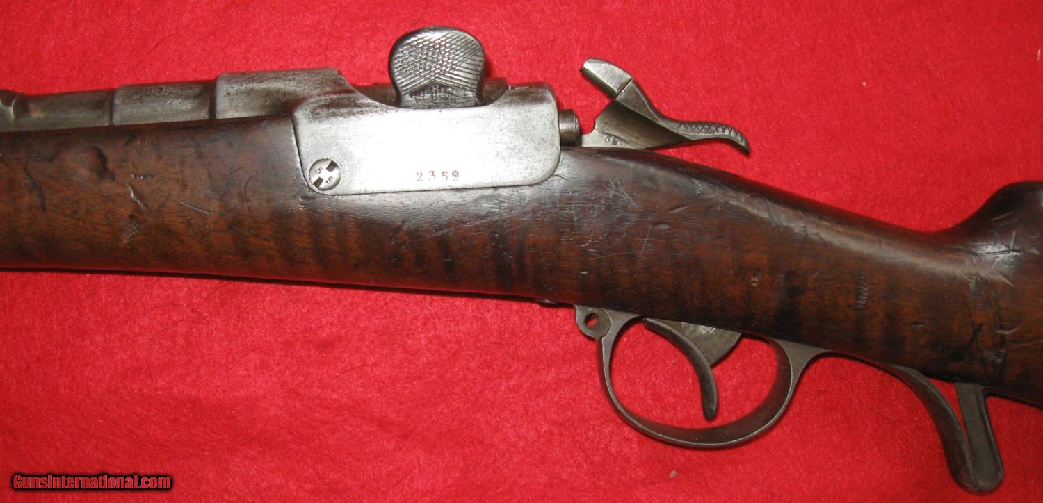 Description: THIS AUSTRIAN WERNDYL IS A SINGLE SHOT ROTARY BREECH CAVALRY CARBINE. IT IS SERIAL # 2359. IT HAS "77" AND "ST.82" STAMPED ON THE BREECH. IT HAS MATCHING NUMBERS ON THE RECEIVER AND BREECH BLOCK. IT IS CHAMBERED FOR THE AUSTRIAN 11.15 X 36 MM WERNDL CARTRIDGE. THE BORE HAS A PITTED AREA NEAR THE MUZZLE BUT IS OTHERWISE VERY GOOD WITH STRONG RIFLING. IT MEASURES .453 ACROSS THE GOOVES SO CAN US 45 CALIBER LEAD BULLETS. IT HAS A VERY INTERESTING ROTATING BREECH BLOCK WHICH WAS THE STRONGEST OF IT'S TIME. IT DISASSEMBLES VERY EASILY AND HAS EXCELLENT MECHANICS WITH A TIGHT BREECH. THE FOREND CAP AND THE SLING SWIVELS ARE MISSING AND THE WOOD HAS MULTIPLE DINGS AND SCRATCHES. IT HAS IT'S ORIGINAL CLEANING ROD. THE REAR SIGHT IS AN ADJUSTABLE LADDER TYPE THAT LOOKS SLIGHTLY BENT. I HAVE A CERROSAFE CHAMBER CAST THAT WILL SHIP WITH THE RIFLE WITH 20 FIREFORMED 7.62 X 54 R CASES THAT I HAVEN'T CUT TO LENGTH TO LOAD YET. THEY DID FIRE AS BLANKS AND FORMED WELL. SHIPPING IS $35 TO US SOLD Antique: Yes Manufacturer: WERNDYL Model: CAVALRY CARBINE Serial Number: 2359 Caliber Info: 11 X 42 R Condition: GOOD Metal Condition: VERY GOOD Wood Condition: GOOD-DINGS Bore Condition: FAIR -PITTED AREA Barrel Type: 22" ROUND Action: ROATRY BREECH SINGLE SHOT Butt Pad: ORIGINAL STEEL Finish: BLUEING IS GONE! Sights: ADJUSTABLE LADDER Manufacture Date: 1877?? Item Location: RI |