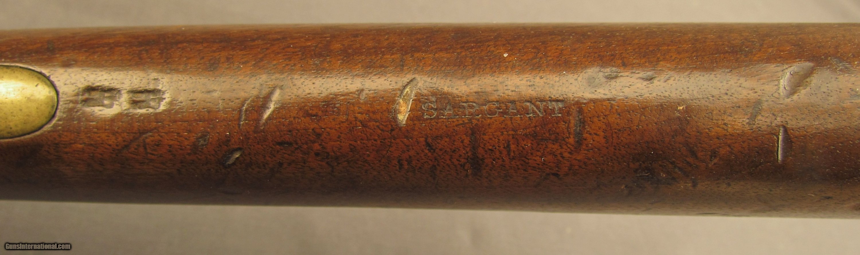 Description: NSN, .67 Caliber, 20" barrel with a very good bore that has dark freckling along its length, heaviest towards the muzzle. This is an 1844 dated, “VR" cyphered, Tower-made carbine that has an overall smooth gray-brown patina throughout with a few hints of mild pinprick pitting at the bolster, and some heavier pitting on the tip of the captive ramrod. The markings are still crisp and clear, as are the engraved borders and the knurling on the hammer spur. The wedge-fastened, English walnut stock has a “SARGANT" maker's name stamped into the wood along the belly of the buttstock; “(Broad Arrow)/BO" Board of Ordnance and double arrow deaccession stamp on the right side of the buttstock; large “J9" issue stamp over “QORY" (Queen's Own Royal Staffordshire Yeomanry) unit marking on the left side. The wood has numerous small handling marks and minor blemishes scattered throughout under an old, added oil finish. The brass furniture has developed a pleasant, yellow-ochre color with spots of darker patina scattered throughout. The sling bar and ring have a matching, darkly mottled patina while the nipple protector and chain are no longer present (the swivel is still in place, however). The mechanism is still tight and fully functional and the carbine rates fine condition overall. The Queen's Own Royal Staffordshire Yeomanry was first raised in 1794 and spent its tenure in England until the Boer War. This is a fantastic Victorian cavalry carbine and would make a great addition to any collection of British military arms. Antique SOLD Antique: Yes Manufacturer: British Model: Carbine Caliber Info: .67 Cal Gauge Info: .67 Cal |