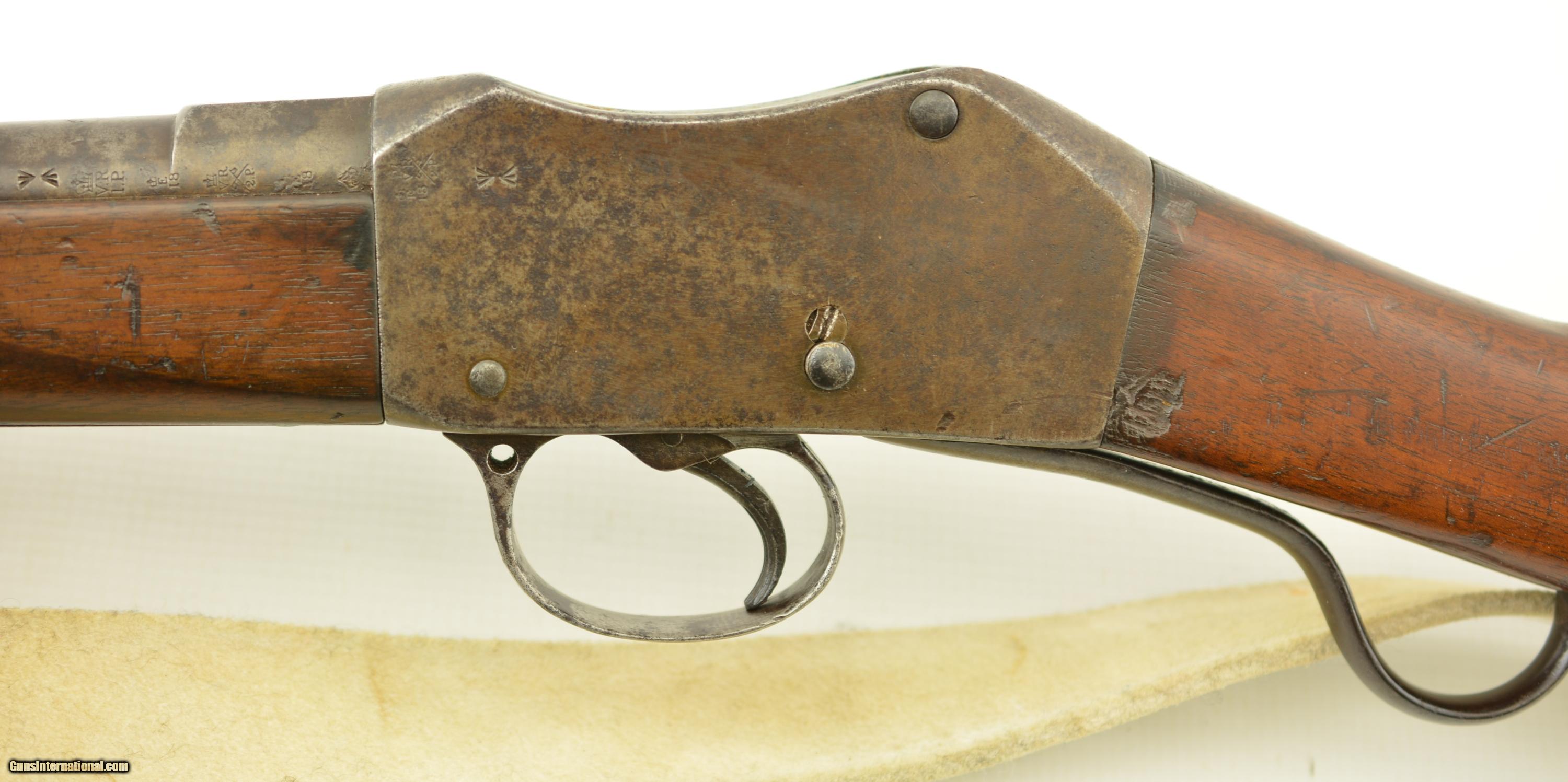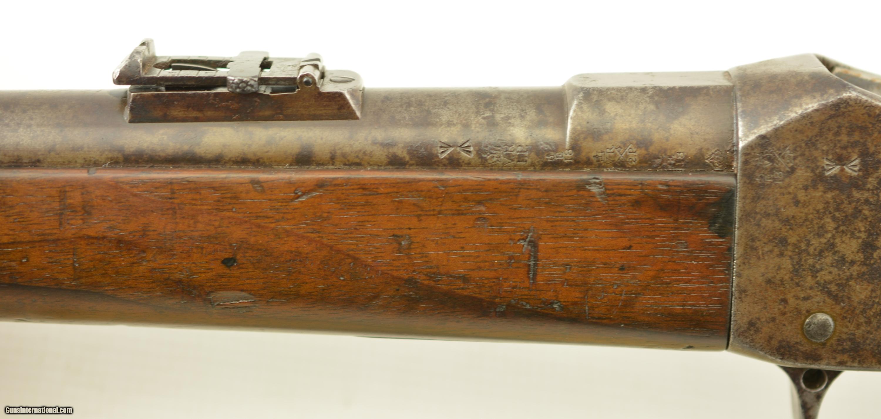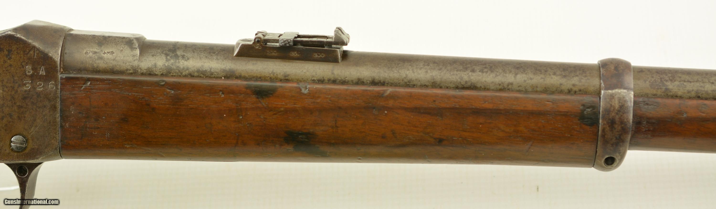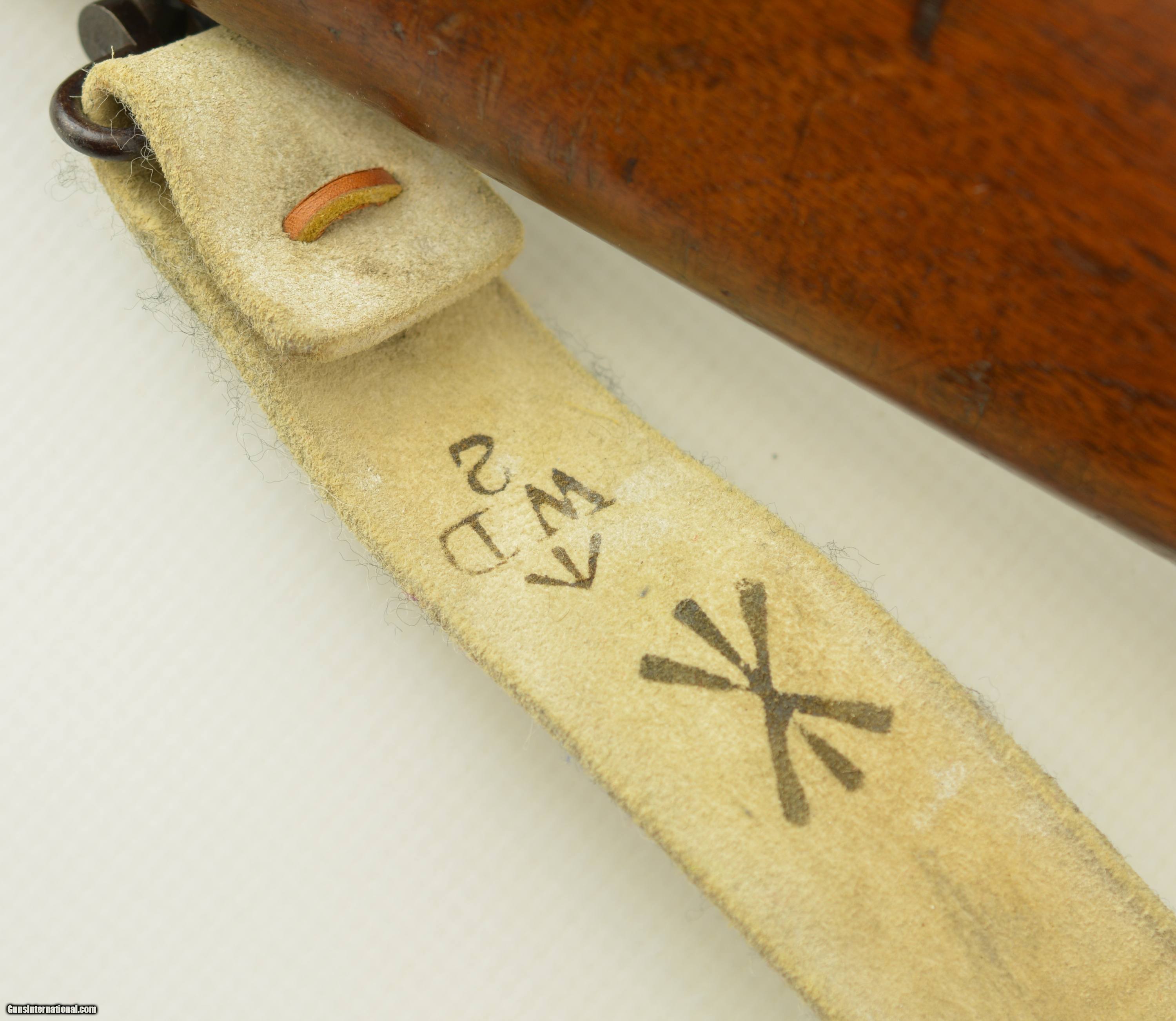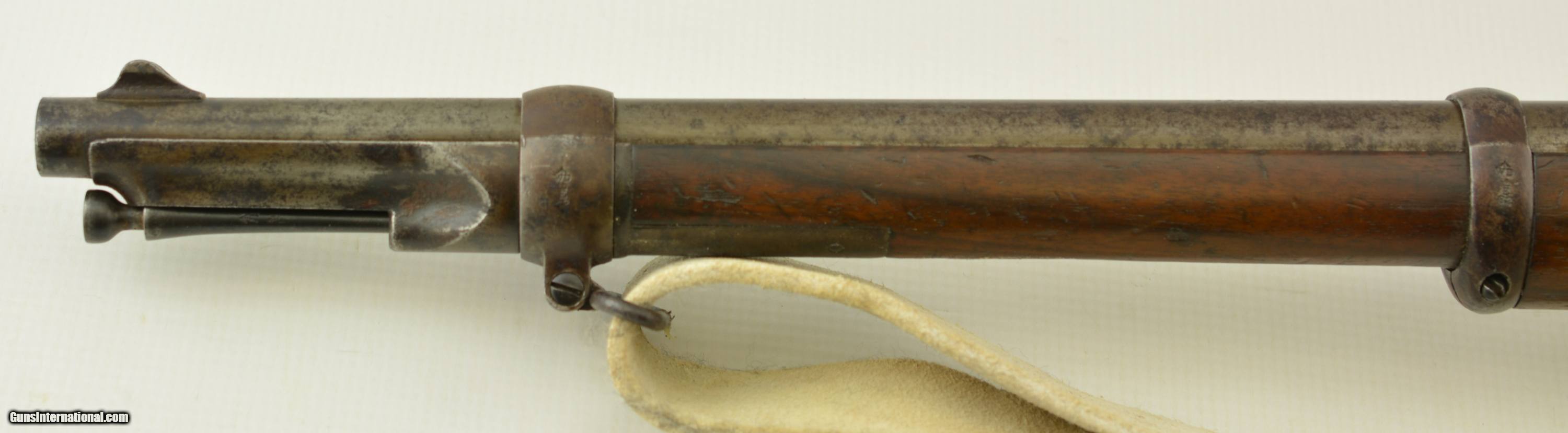 Description: Serial #8503, .577/.450 Martini-Henry, 21 1/4" barrel with a very good, bright bore that has a small amount of darker freckling within the grooves. This is an Enfield-made, 1879 dated carbine that has double arrow deaccession stamps and an overall lightly freckled plum-brown patina that has areas of mild pinprick pitting scattered about the surface. There is a large “(Broad Arrow) / SA / 326" South African service stamp on the right side of the frame. The walnut forend and buttstock have numerous small handling marks and surface blemishes scattered throughout the original varnish. The stock has clear and well-defined double arrow stamps, and “I" roundel on the right side. The swivels have an original white buff sling with double arrow and “WD" ink stamps, and the correct iron ramrod is still present. This is one of 5,001 Mk. I Artillery Carbines produced, and one of 850 handed over to South Africa following the 1879 Zulu War. It is probable that the carbine saw at least some service during the war, and is a fine example of a desirable South African Martini-Henry. Antique SOLD Antique: Yes Manufacturer: British Model: Martini Caliber Info: .577/450 Gauge Info: .577/450 |