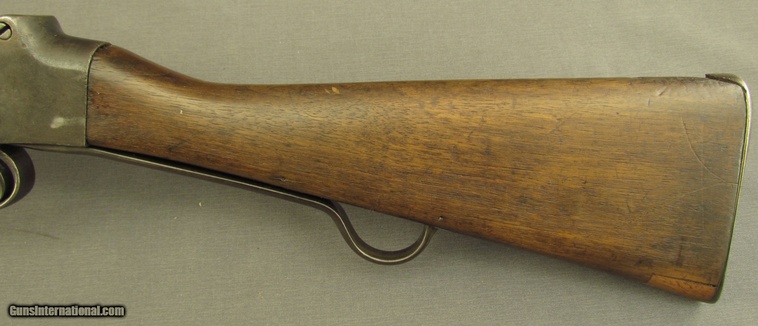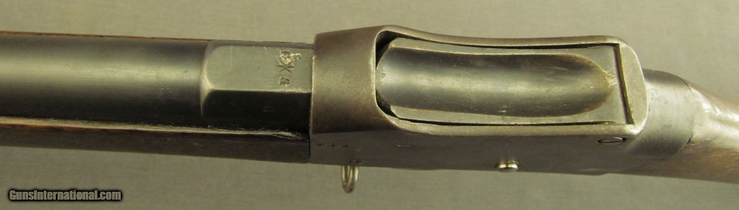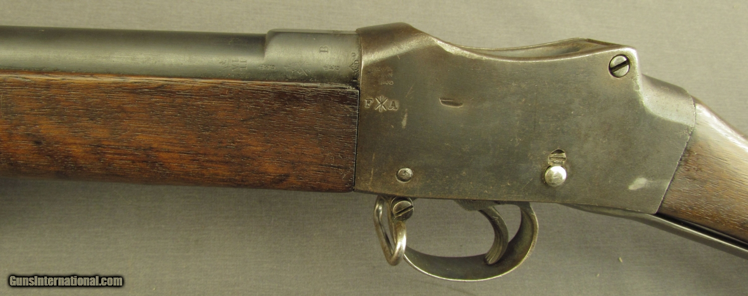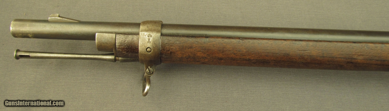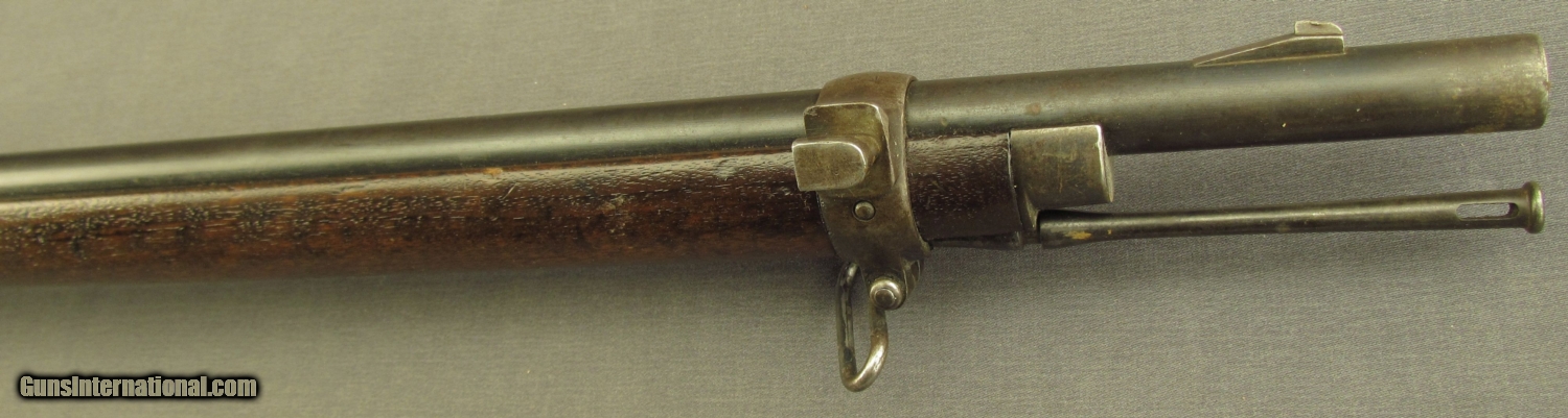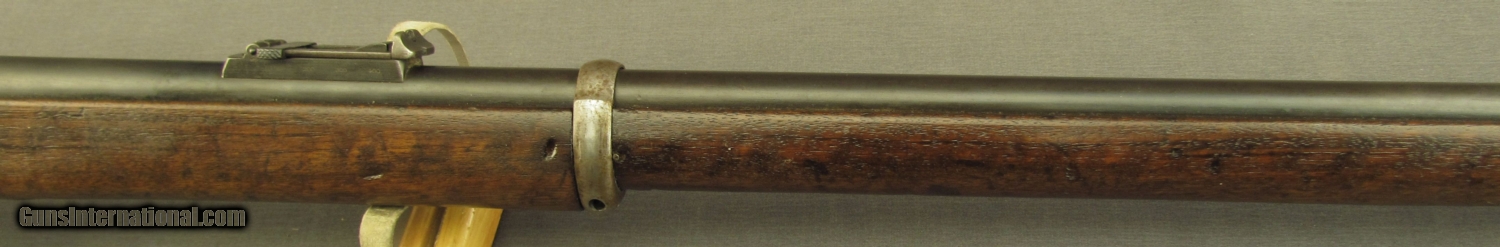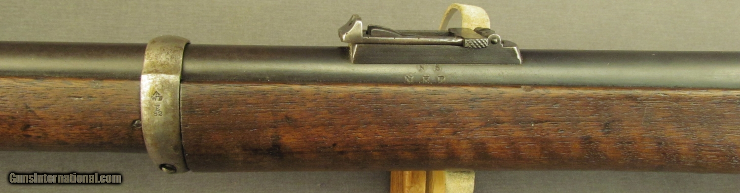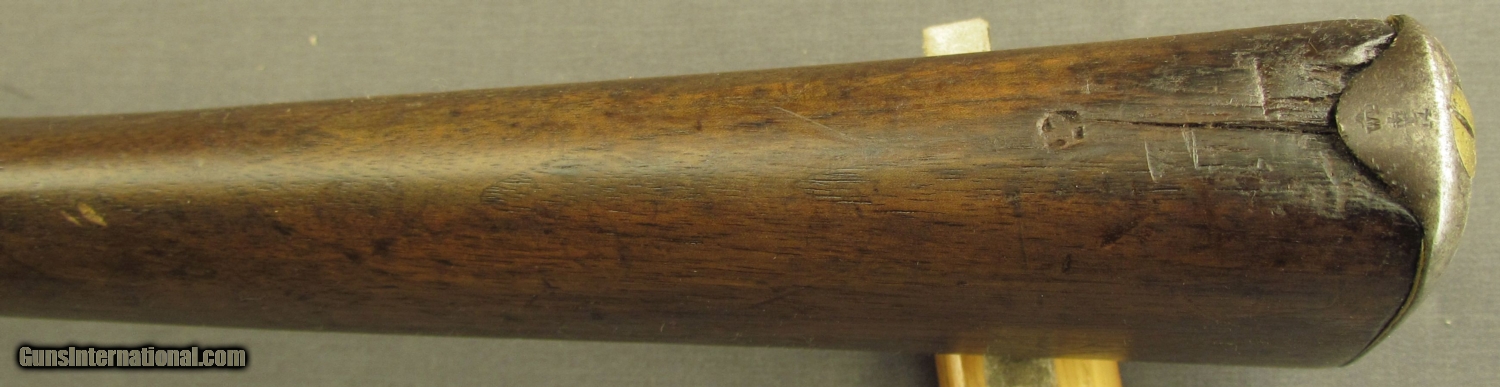Description: NSN, .577/.450 Martini, 33” barrel with a very good bore that has some dark freckling within the grooves. This is an 1887 dated, “VR” cyphered, Enfield-made rifle that has an overall dark patina blending with the arsenal re-applied blue finish on the metal. There is some silvering at the muzzle with some further mild gray fading along the exposed edges and surfaces. There are extensive British military proofs on the breech with further Nepali markings on the trigger guard. Deeply struck “FA” sale from service markings are present on both the knox form and on the left side of the receiver (Firozpur Arsenal, Punjab). The walnut forend and buttstock are also in very good condition with an armory re-applied military oil finish over numerous small handling marks and blemishes, a repair at the toe of the butt, and a few small chips missing from around the buttplate tang. The right side of the butt has extensive British and Nepali markings along with fairly crisp cartouches. The rifle is very good mechanically, and still has the original ramrod. Additionally, the rifle comes with a correct bayonet measuring 23 5/8” overall with an 18 1/8” straight, single-edged, unfullered blade having shallow false edges at the tip. The steel on the hilt has an overall mottled gray patina with spots of gray along the edges and dark brown freckling along the sides of the blade. The crossguard has inscribed Nepali markings and the original scabbard is also included. This is a pre-IMA purchase, British made, Nepalese “Long Tang” Martini that is complete and in very good plus condition overall. {Ref. “Guns of the Gurkhas” by John Walter; 2005} Antique SOLD Antique: Yes Manufacturer: British Model: Martini Caliber Info: .450 Gauge Info: .450 |