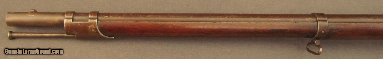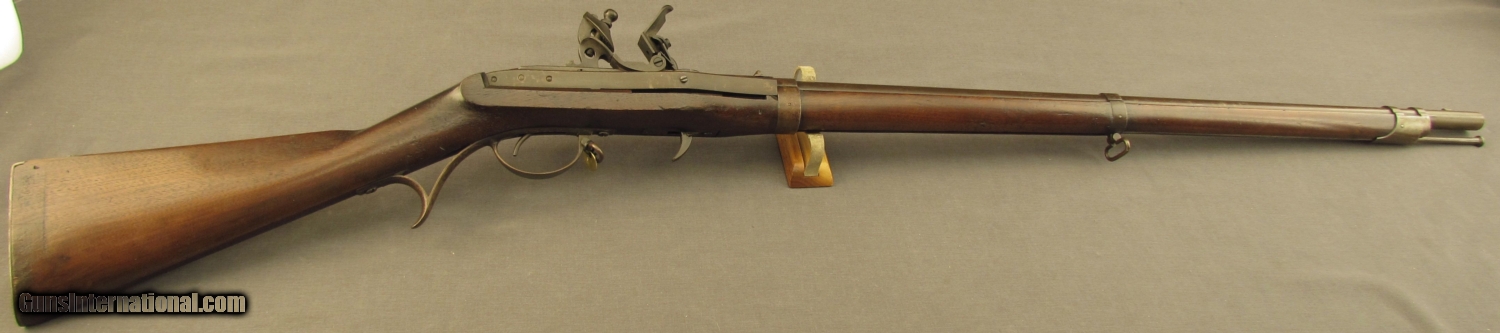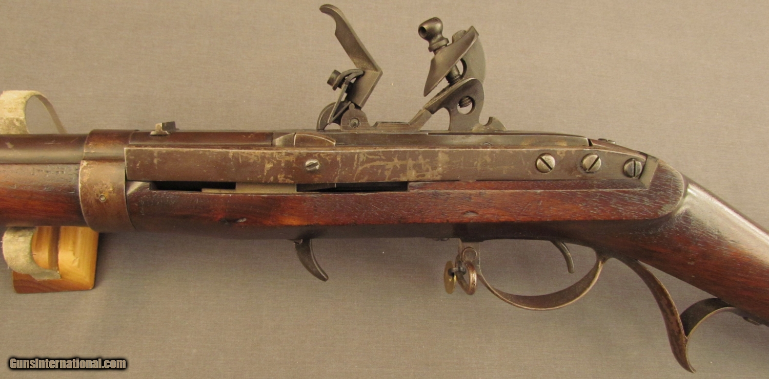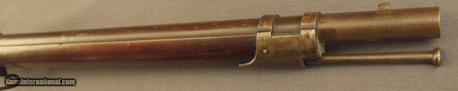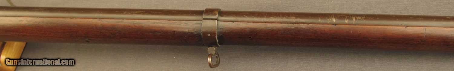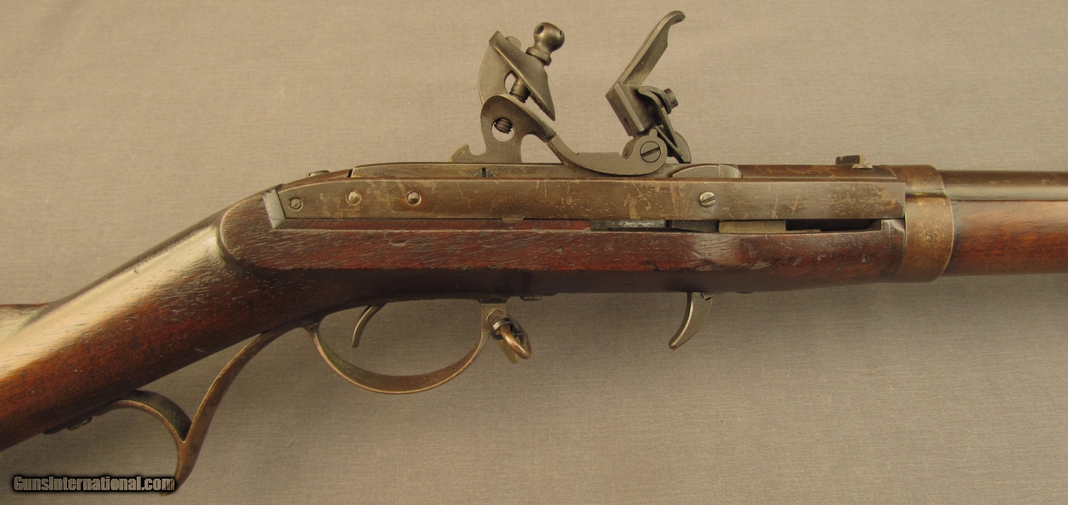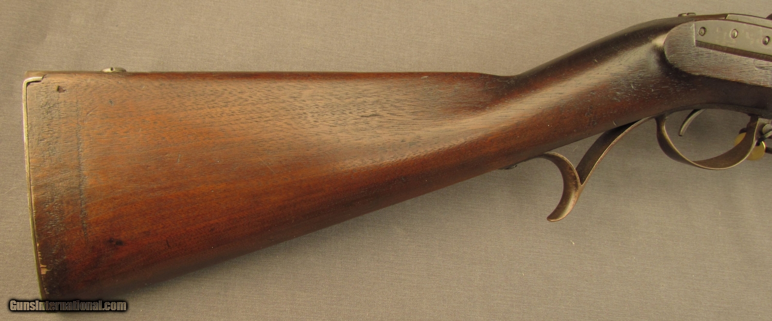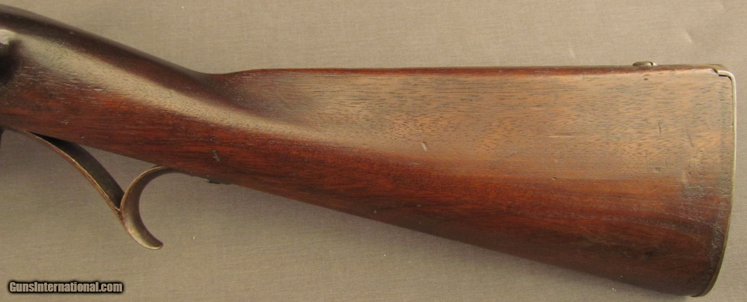 Description: NSN, .52 Caliber, 32 5/8” barrel with an excellent, bright bore. This is a splendid 2nd Type, 1838 dated rifle that retains 75-80% of the original brown lacquered finish that has flaked to the underlying plum-brown metal on the balance. There are some further specks of mild freckling scattered here and there around the metal, but these are negligible. The tilting breech-block does not appear to have been fired very much, if at all, and has no pitting around the touch-hole while the block face and chamber are likewise in excellent condition, and the crisp rifling is correctly back-bored at the muzzle. The walnut stock is in excellent original condition with only minor handling marks and blemishes marring the original military oil finish. The edges are still crisp and sharp, and there are no cracks or major blemishes in the wood. The ramrod is original and matches the condition of the rifle. This is a splendid original example of a one of the most innovative infantry arms made during the flintlock era. While never the great success it's proponents hoped it would be, the Hall design spurred on developments that ultimately led to the uniform manufacture of weapons with interchangeable parts. Antique SOLD Antique: Yes Manufacturer: Harpers Ferry Model: Hall Caliber Info: .52 Cal Gauge Info: .52 Cal |