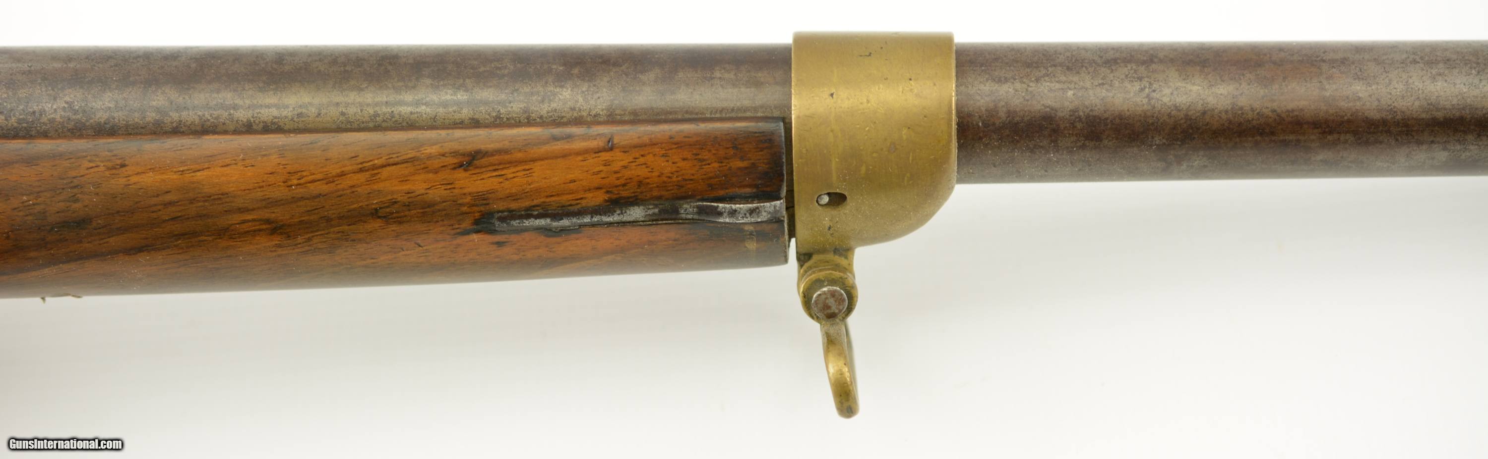 Description: NSN, .70 caliber, 23 1/2" barrel with a fair, freckled and pitted bore with faint but discernible rifling. This percussion musketoon is Tulle marked and has the 1829 date on the barrel tang and 1862 date at the right side of the breech. The metal has an overall darkly mottled gray patina with streaks of dark plum - brown and mild surface freckling throughout. The rear sight has been removed and the screw holes filled while the brass furniture has a dull ochre patina throughout with small impact marks and freckling along the surface. The French walnut stock has been refinished to fine shape with a few minor handling marks and blemishes on the otherwise smooth surface. The wooden stock disk has been removed and replaced with a domed wooden rivet and the outline of a French military cartouche can still be seen on the right side of the butt. The ramrod is no longer present and the action is fully functional although the notches are a bit worn. This is an attractive French musketoon and would make a nice addition to any collection. Antique SOLD Antique: Yes Manufacturer: French Model: 1829 Caliber Info: .70 cal Gauge Info: .70 cal |