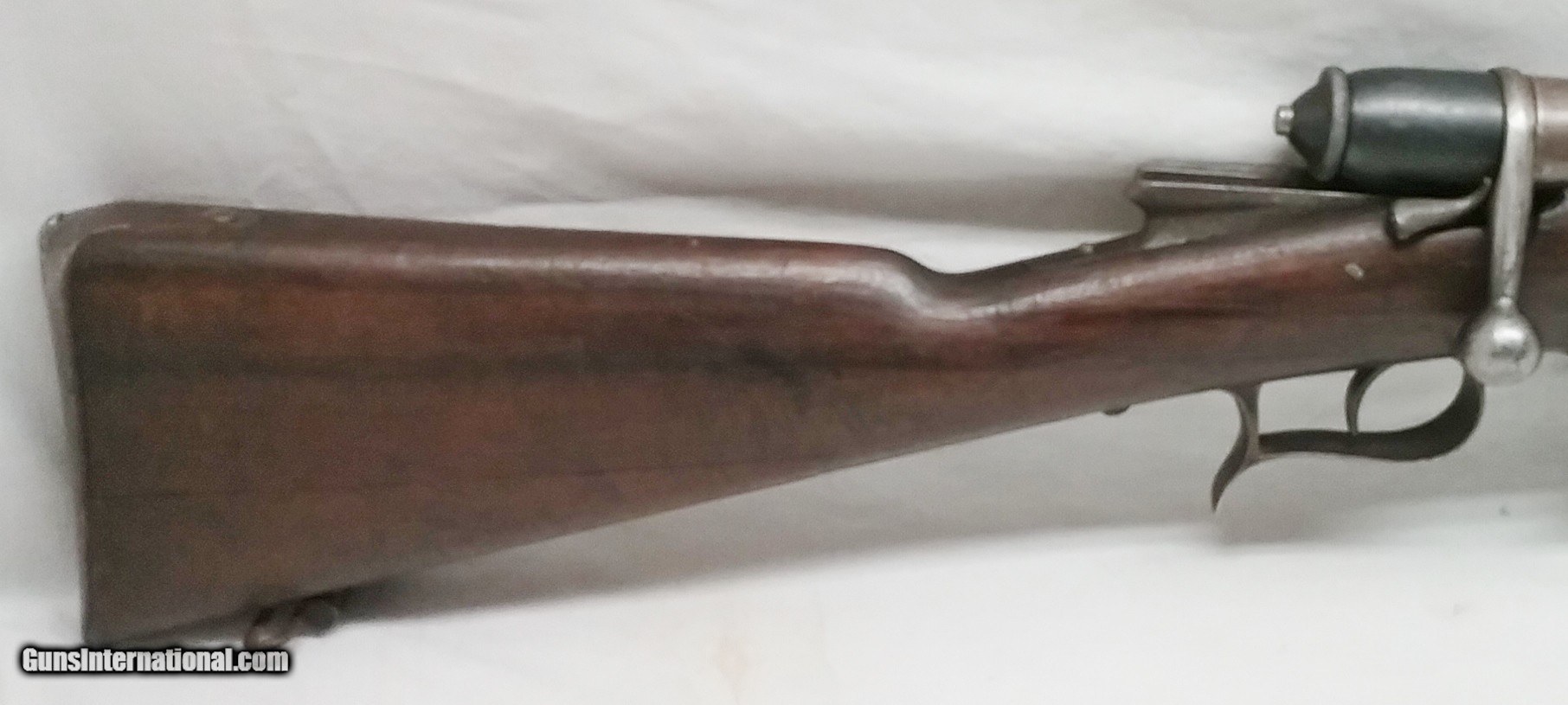 Description: This 6.5 Carcano Italian made Terni Vetterli Model 1870/87/15 rifle has a 33-1/2” blued tapered round barrel that is in good condition and fitted with an adjustable rear sight. The bore is good with the exception of some light scattered pits. The stock has some scratches and usage dents and chip on the right side of the stock rear of the barrel band. There has also been splice repair at the toe of the stock and both sides surrounding the magazine body. The gun features a bayonet lug, two sling swivels and a metal buttplate. The length of pull is 13”, the overall length is 52-1/2”, and the weight is 9.2 lbs. Our stock number is #C210. This rifle is an Antique and does not require an FFL. Buyer pays freight and insurance. SOLD Rifle Caliber: 6.5x52mm Mannlicher-Carcano Manufacturer: Vetterli Model: 1870/87/15 Bore: Rifled Bore Condition: Good Barrels: One Barrel Type: Tapered Round Action: Bolt Action Triggers: One Stock: Walnut Butt Pad: Metal LOP: 13 in Weight: 9.2 lbs Sights: Adjustable Item Location: OR |