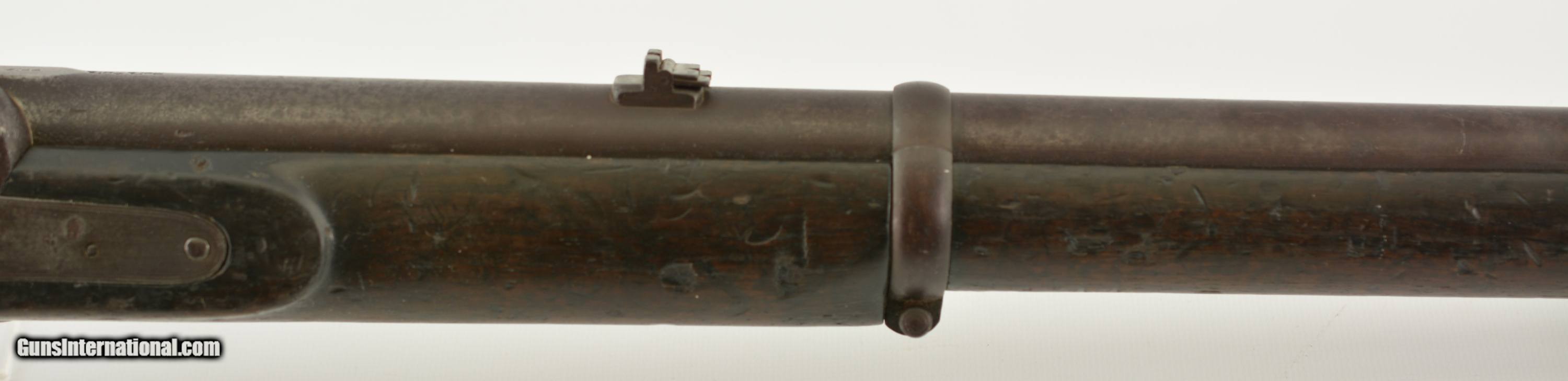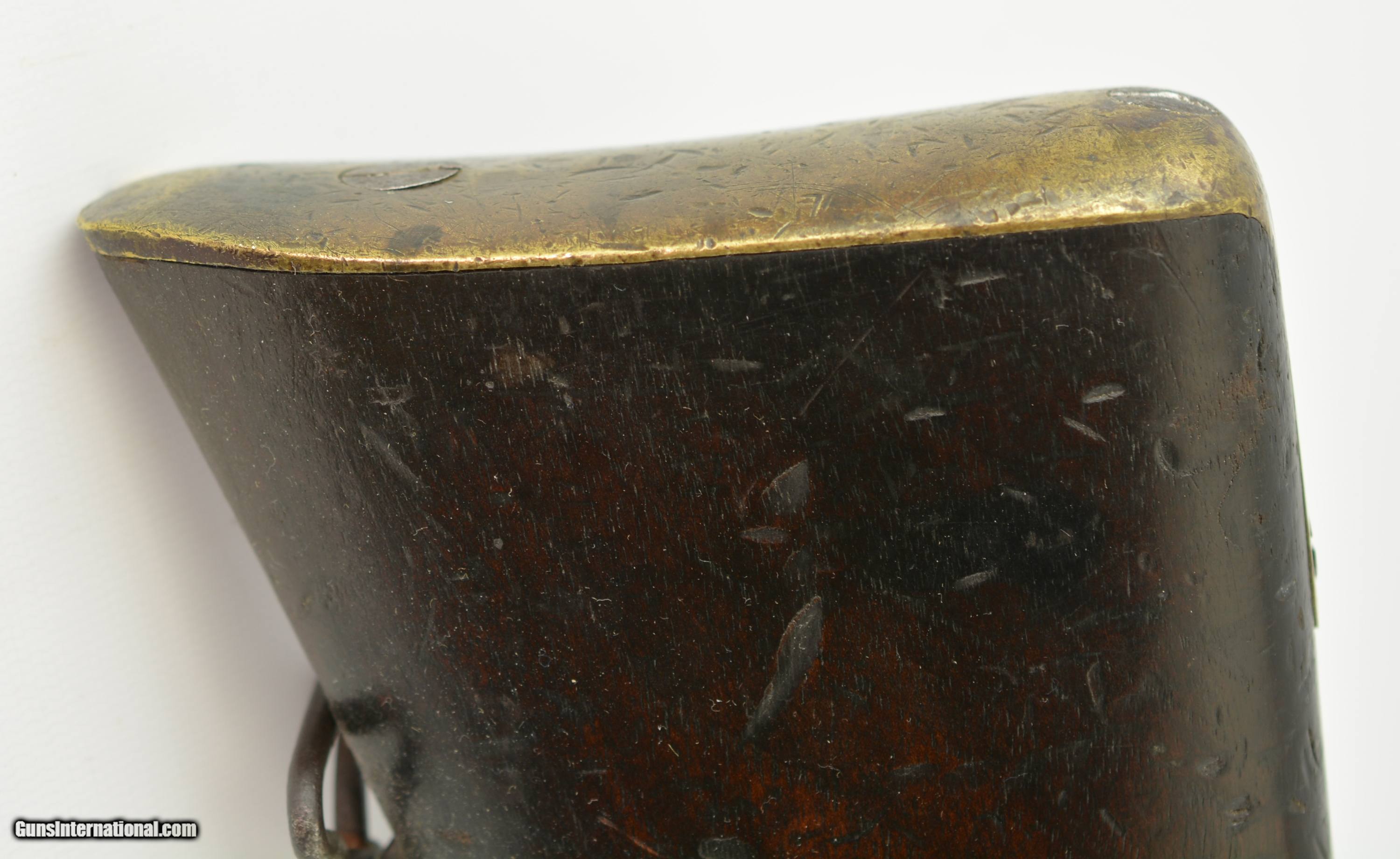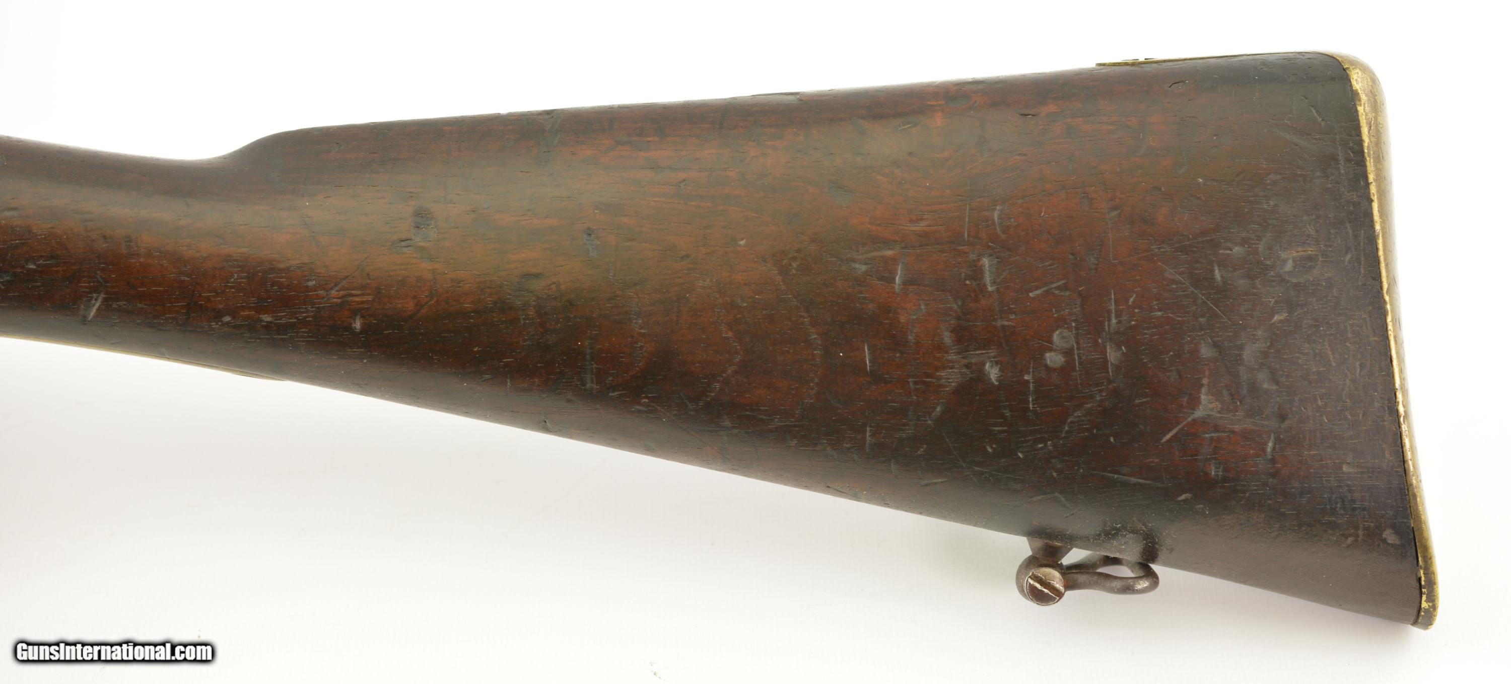 Description: NSN, .577 Caliber, 24" barrel with a fine, bright bore that has some freckling and mild pitting at the muzzle. This is a very rare, Lower Canada marked carbine that uses one of the Liege contracted, “E / LG" proofed barrels; one of about 100 such carbines, and one of only 76 Foot Artillery marked carbines. The metal has an overall plum-brown patina, flecked with gray along the high points and edges, and there are further streaks of gray along the 1856 dated, “TOWER" marked lockplate. The stock is English walnut with “P. WOODWARD & SON" stamp along the belly of the butt, “W. BLYTH" opposite the lock, and large “(Double Broad Arrow) WD" War Department stamp on the right side. The brass furniture has an overall dark ochre patina with small hole drilled through the edge of the trigger guard, and unit issue markings on the buttplate tang: “LC / D / 2" (Quebec 2nd Foot Artillery). The wood has numerous handling marks and blemishes throughout, along with some tiny chips missing from the ramrod channel (an original ramrod is included), and the barrel bands match the rest of the metal. The carbine is accompanied by an unmarked saber bayonet with 22 1/2" yataghan blade and scattered light freckling throughout, heaviest on the hilt fittings, which also have a dark plum-brown patina. The crossguard, and the checkered grip scales are in very good-fine condition. The bayonet comes with a correct, heavily flaked steel and leather scabbard, and black leather frog; all are good-about very good overall condition. This is a fine example of a very hard to find, Canadian unit marked Enfield Artillery Carbine, and would make a fantastic addition to any collection. Ref: "Defending the Dominion - Canadian Military Rifles 1855-1955" by David W. Edgecombe, (2003) Antique SOLD Antique: Yes Manufacturer: Enfield Model: Carbine Caliber Info: .577 Gauge Info: .577 |