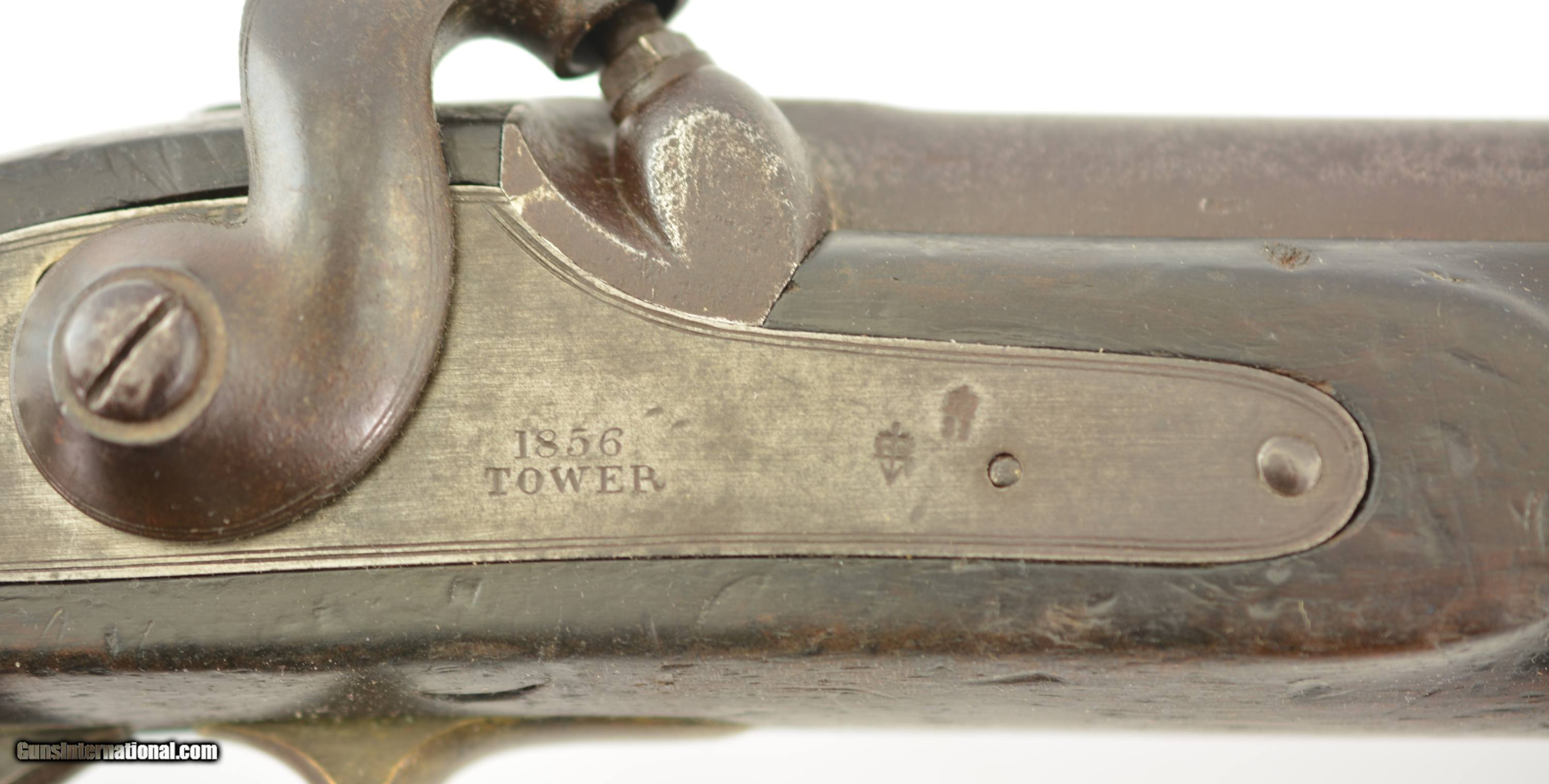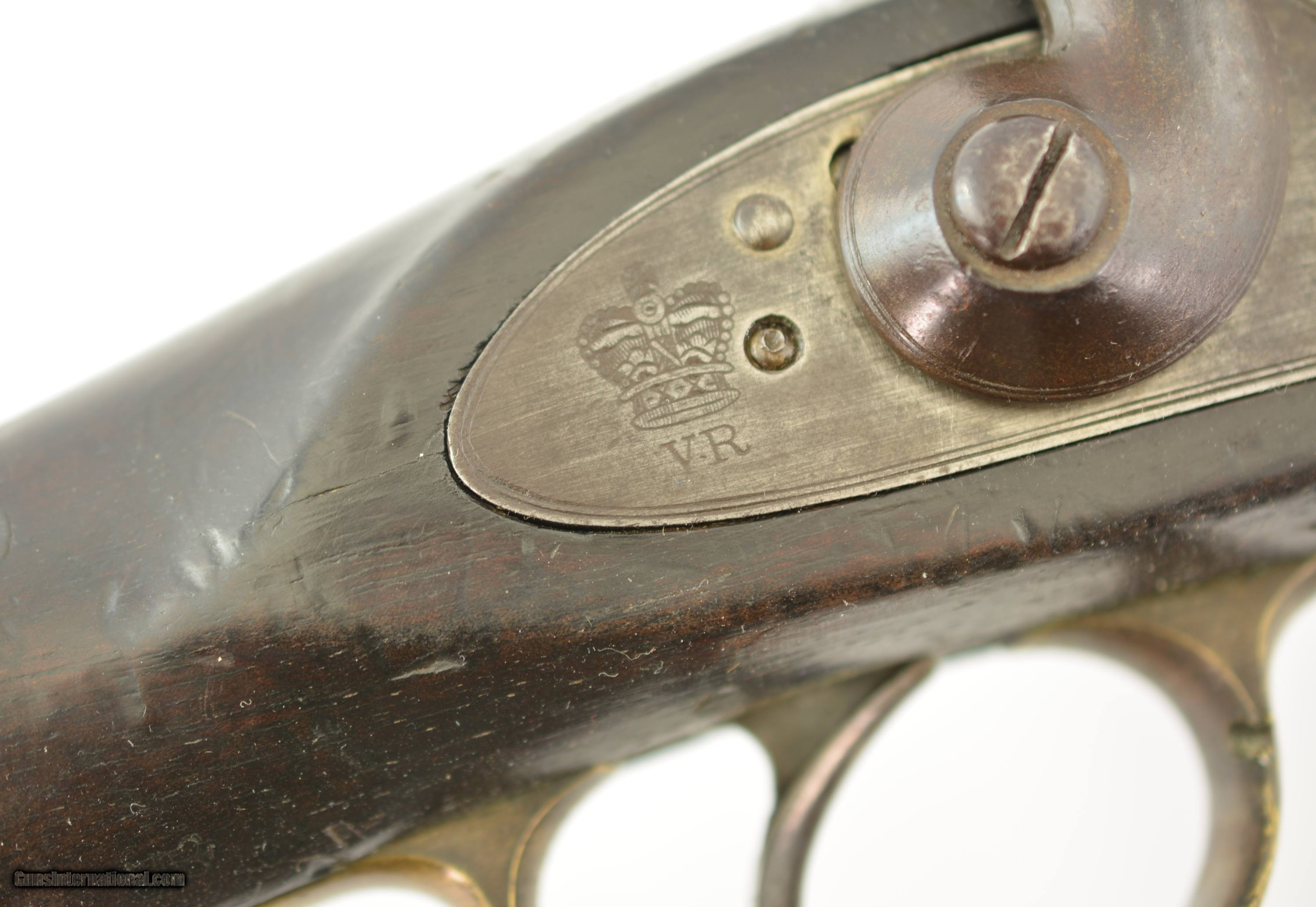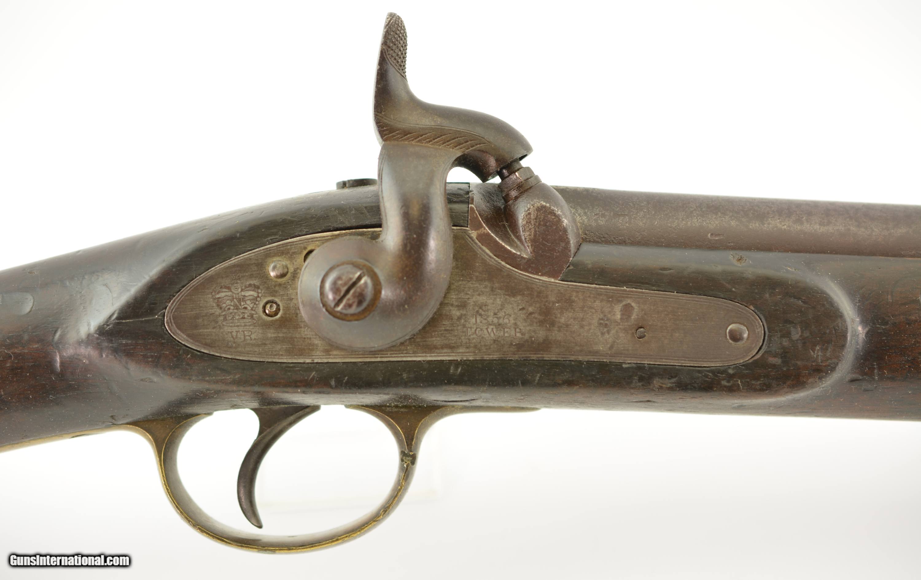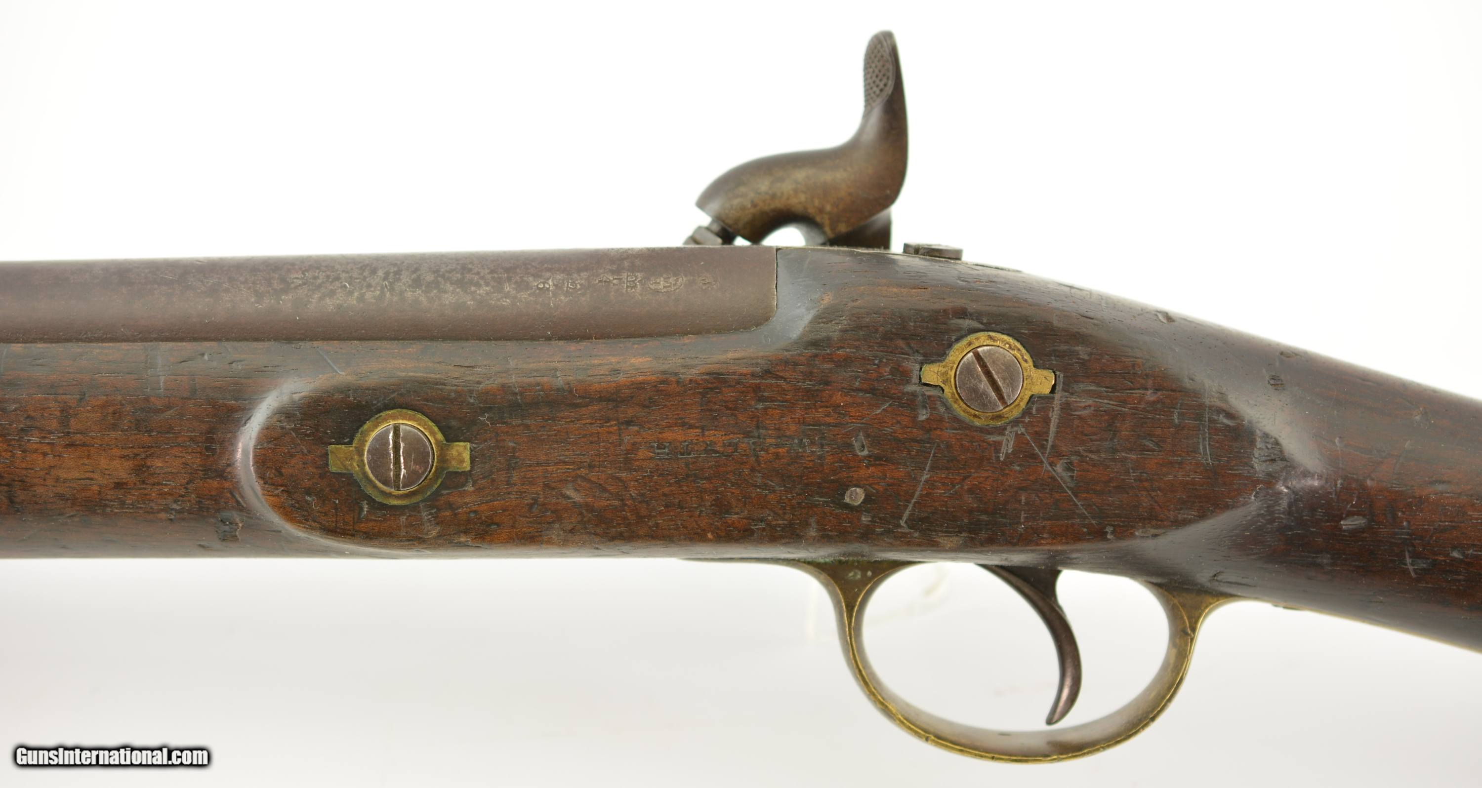 Description: NSN, .577 Caliber, 24" barrel with a fine, bright bore that has some freckling and mild pitting at the muzzle. This is a very rare, Lower Canada marked carbine that uses one of the Liege contracted, “E / LG" proofed barrels; one of about 100 such carbines, and one of only 76 Foot Artillery marked carbines. The metal has an overall plum-brown patina, flecked with gray along the high points and edges, and there are further streaks of gray along the 1856 dated, “TOWER" marked lockplate. The stock is English walnut with “P. WOODWARD & SON" stamp along the belly of the butt, “W. BLYTH" opposite the lock, and large “(Double Broad Arrow) WD" War Department stamp on the right side. The brass furniture has an overall dark ochre patina with small hole drilled through the edge of the trigger guard, and unit issue markings on the buttplate tang: “LC / D / 2" (Quebec 2nd Foot Artillery). The wood has numerous handling marks and blemishes throughout, along with some tiny chips missing from the ramrod channel (an original ramrod is included), and the barrel bands match the rest of the metal. The carbine is accompanied by an unmarked saber bayonet with 22 1/2" yataghan blade and scattered light freckling throughout, heaviest on the hilt fittings, which also have a dark plum-brown patina. The crossguard, and the checkered grip scales are in very good-fine condition. The bayonet comes with a correct, heavily flaked steel and leather scabbard, and black leather frog; all are good-about very good overall condition. This is a fine example of a very hard to find, Canadian unit marked Enfield Artillery Carbine, and would make a fantastic addition to any collection. Ref: "Defending the Dominion - Canadian Military Rifles 1855-1955" by David W. Edgecombe, (2003) Antique SOLD Antique: Yes Manufacturer: Enfield Model: Carbine Caliber Info: .577 Gauge Info: .577 |