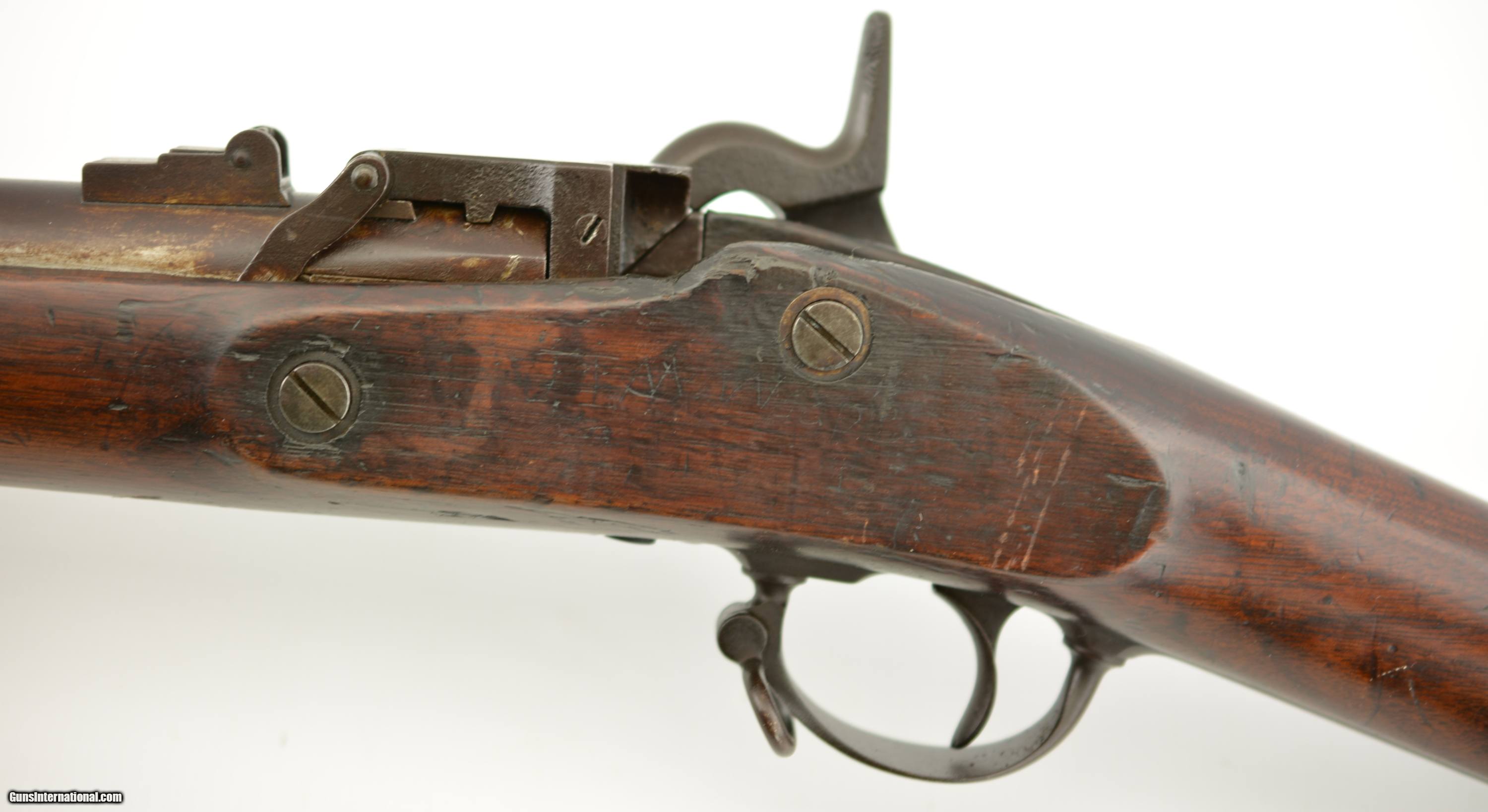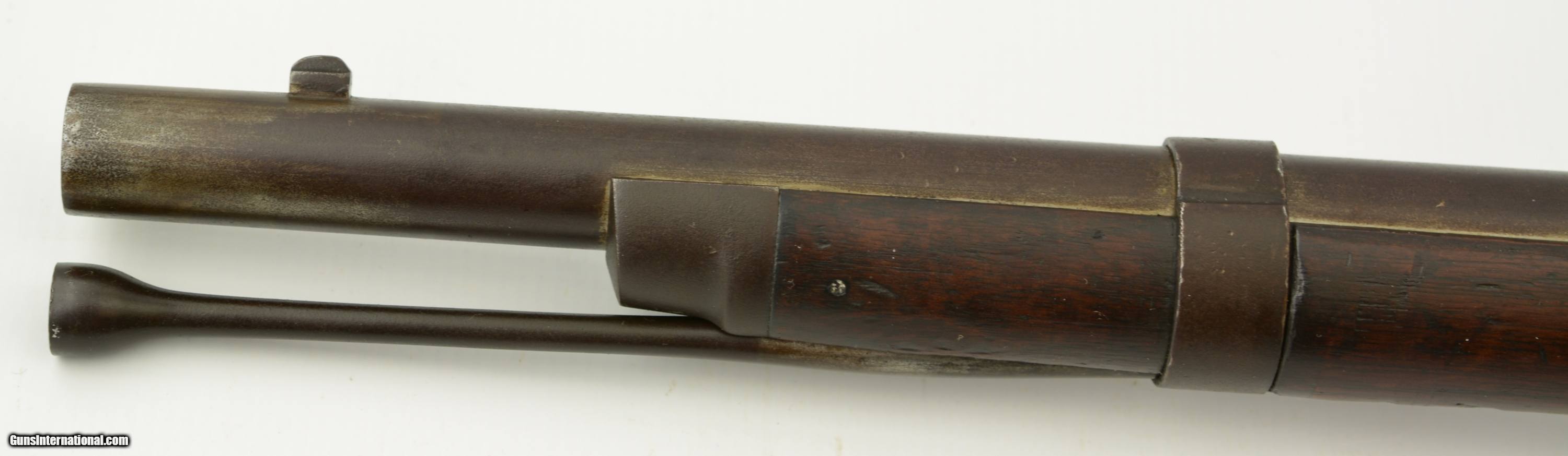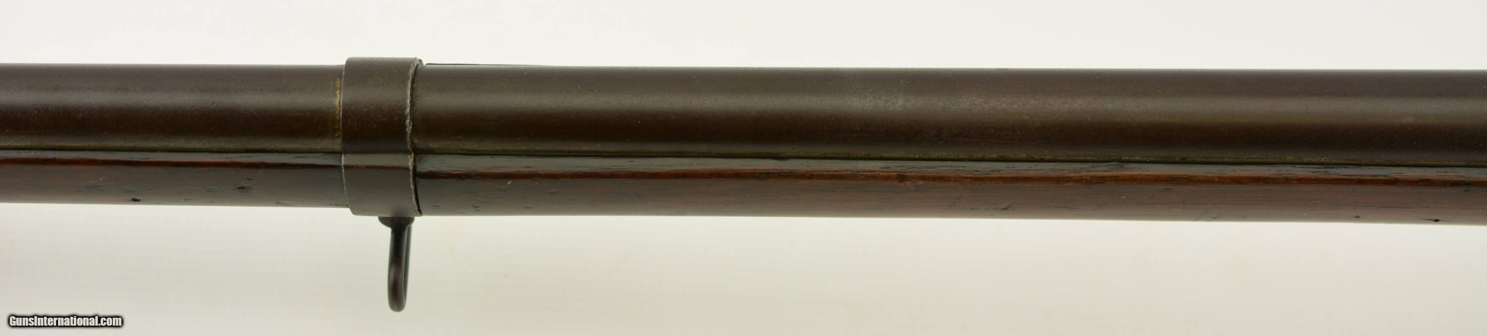 Description: NSN, .58 RF, 38" barrel with a fine, bright bore that has light-moderate freckling near the muzzle. This is a Parker, Snow & Co.-made musket that has an overall dark brown patina with some light, pinprick pitting at the breech, and on the conversion breechblock. The breech mechanism is fully functional, including the rather fragile extractor system. The walnut stock has some chipping and surface damage where it was relieved for the conversion, and numerous small handling marks and blemishes on the balance. The cartouche is no longer visible on the left side, but a scratched owner’s name is still legible: “H.M. Wood". This is a hard-to-find cartridge conversion of a Civil War musket, and rates very good overall. Antique SOLD Antique: Yes Manufacturer: US Military Model: Miller Conversion Caliber Info: .58 Gauge Info: .58 |