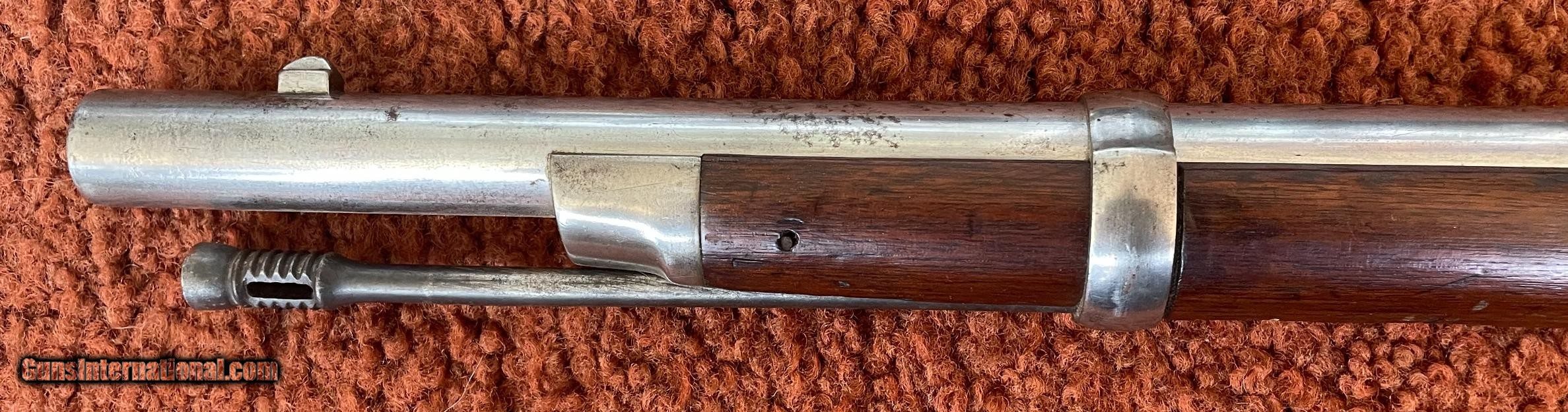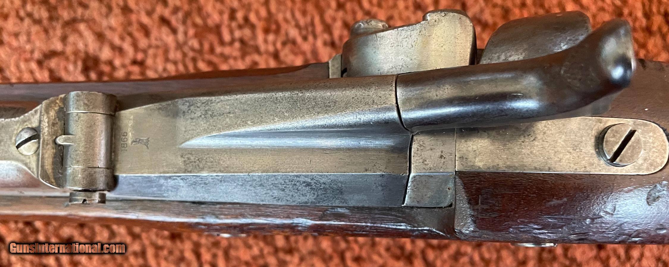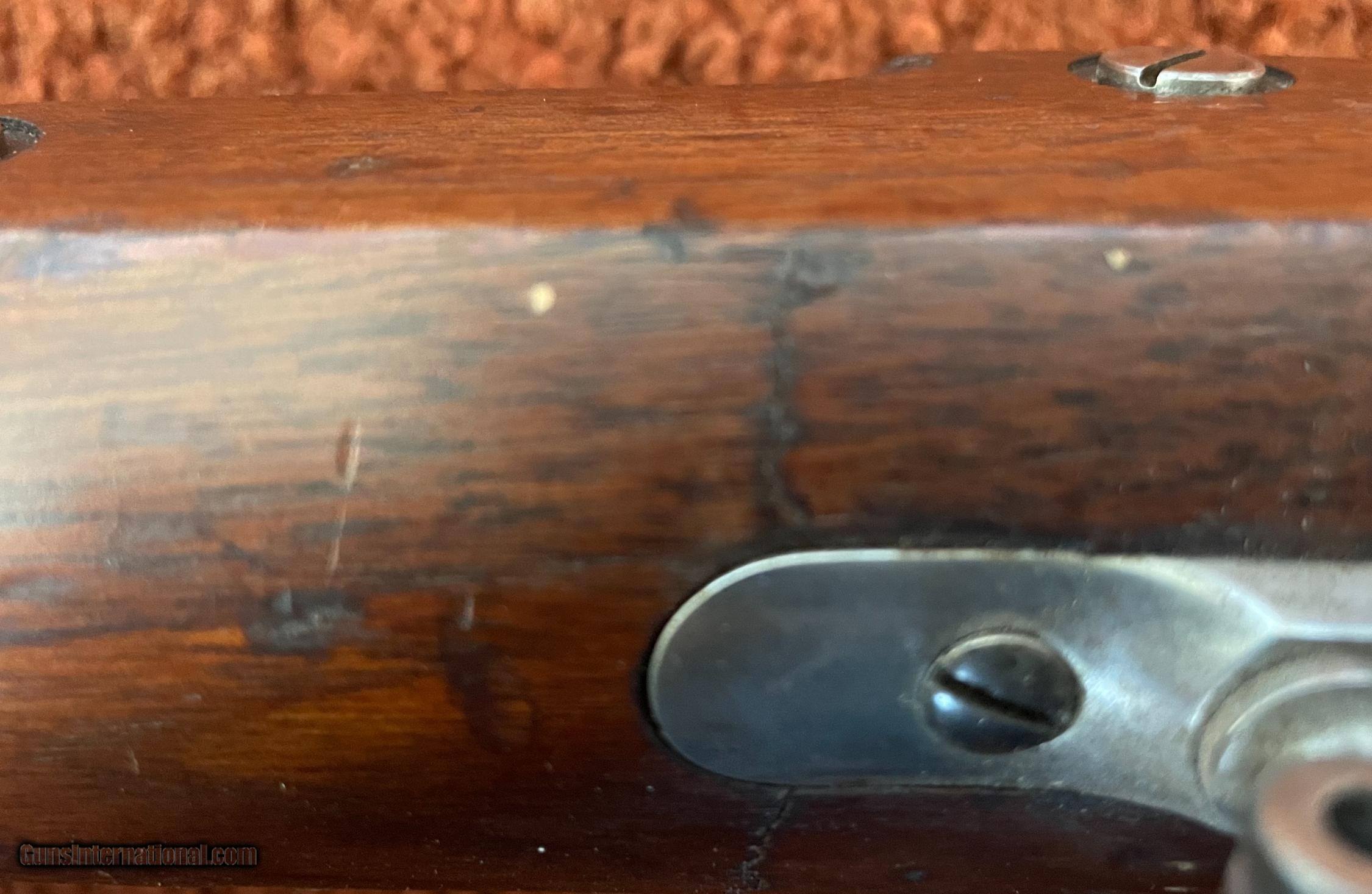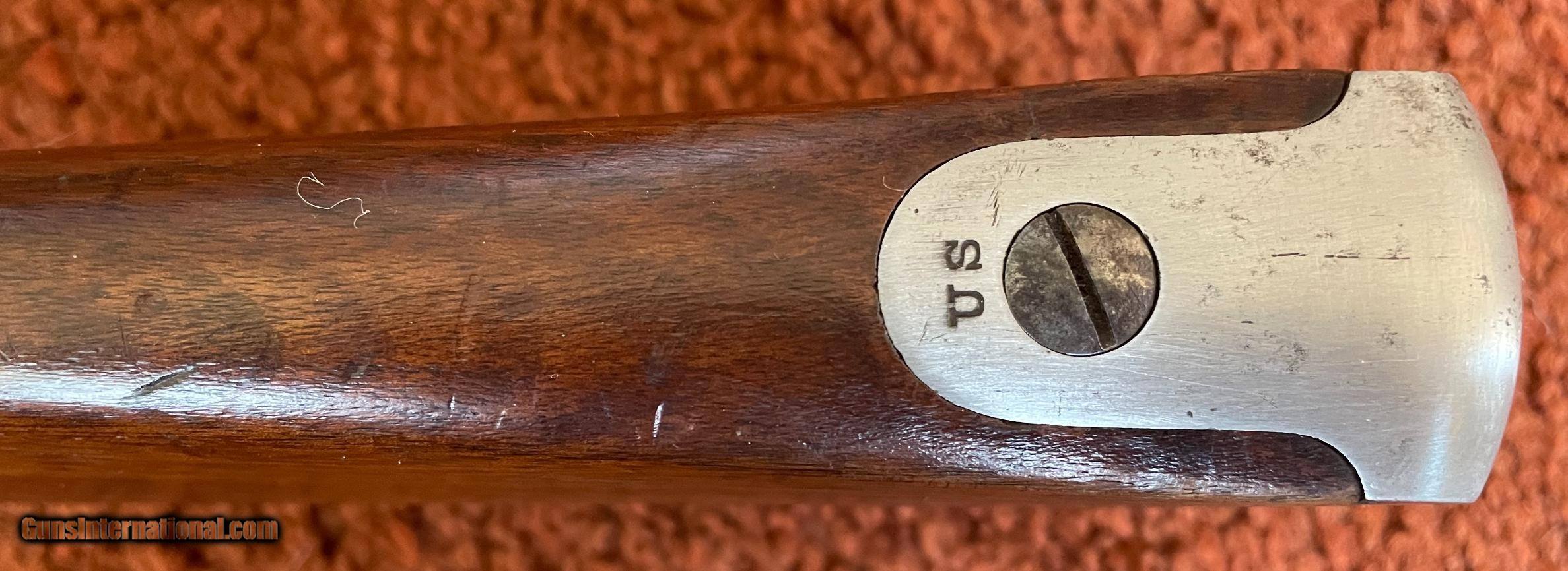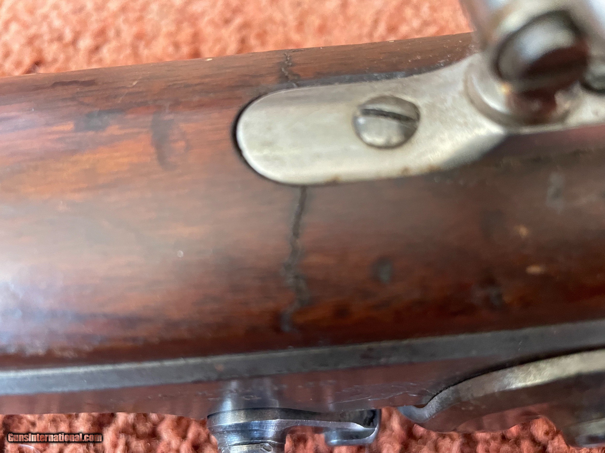 Description: The action is crisp. The bore is very good but the rifled sleeve lacks about 1" from reaching the muzzle There is a crack in the stock beow the lock and on left side See photos for condition. SOLD Antique: Yes Manufacturer: Springfield Armory Model: 2nd Allin Conversion Barrel Length: 36.5 |