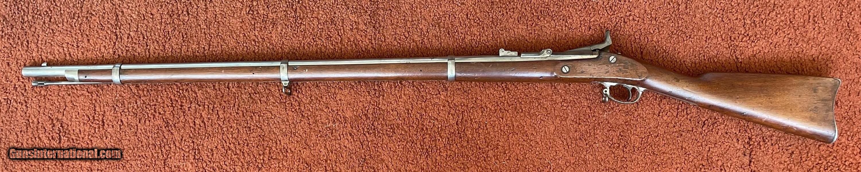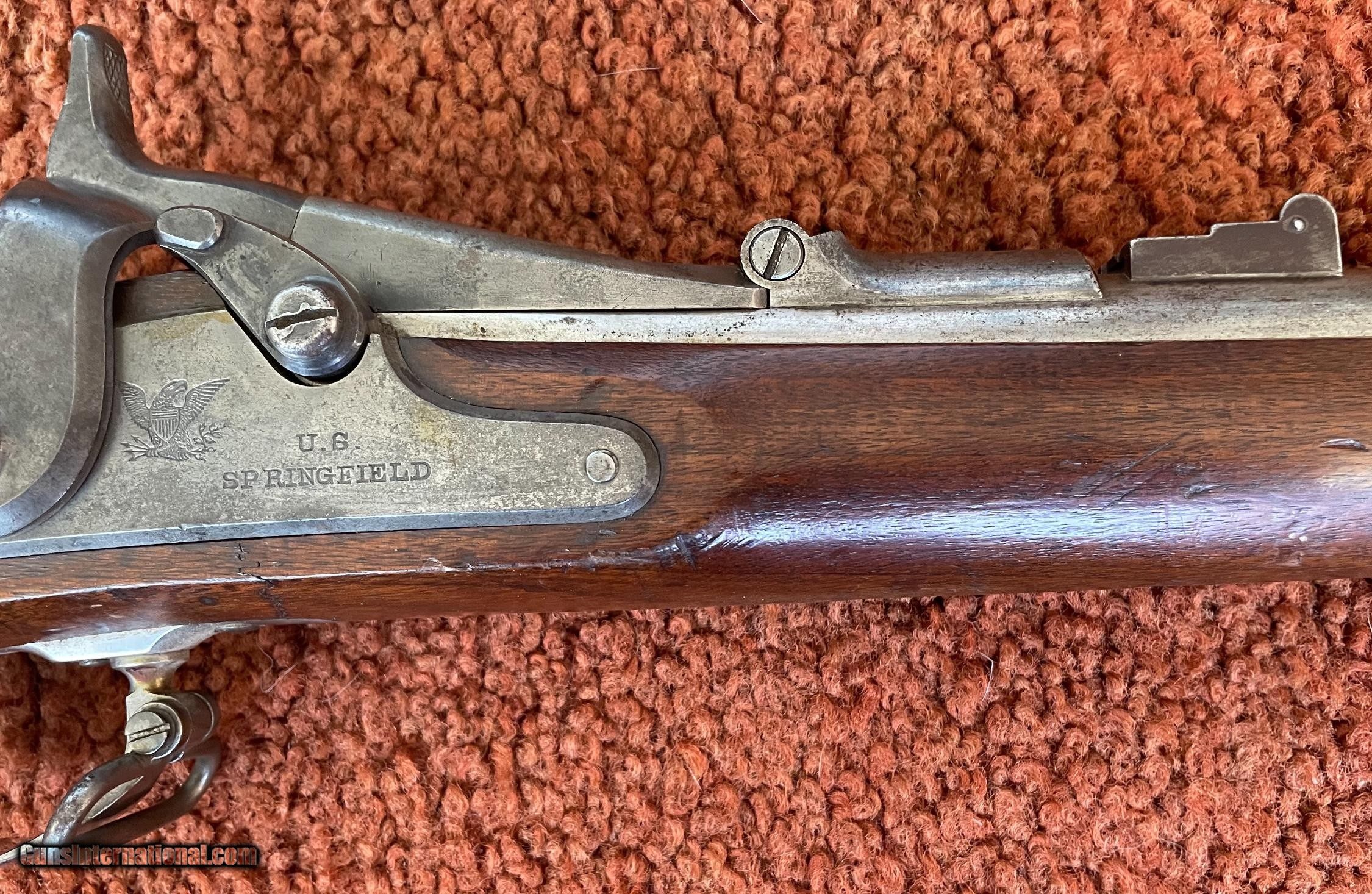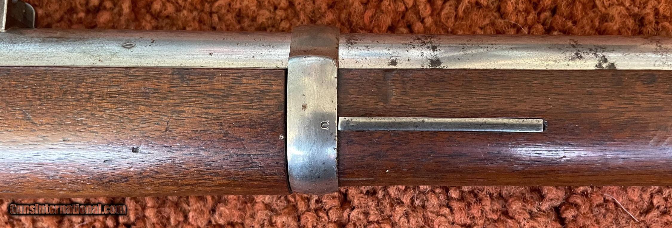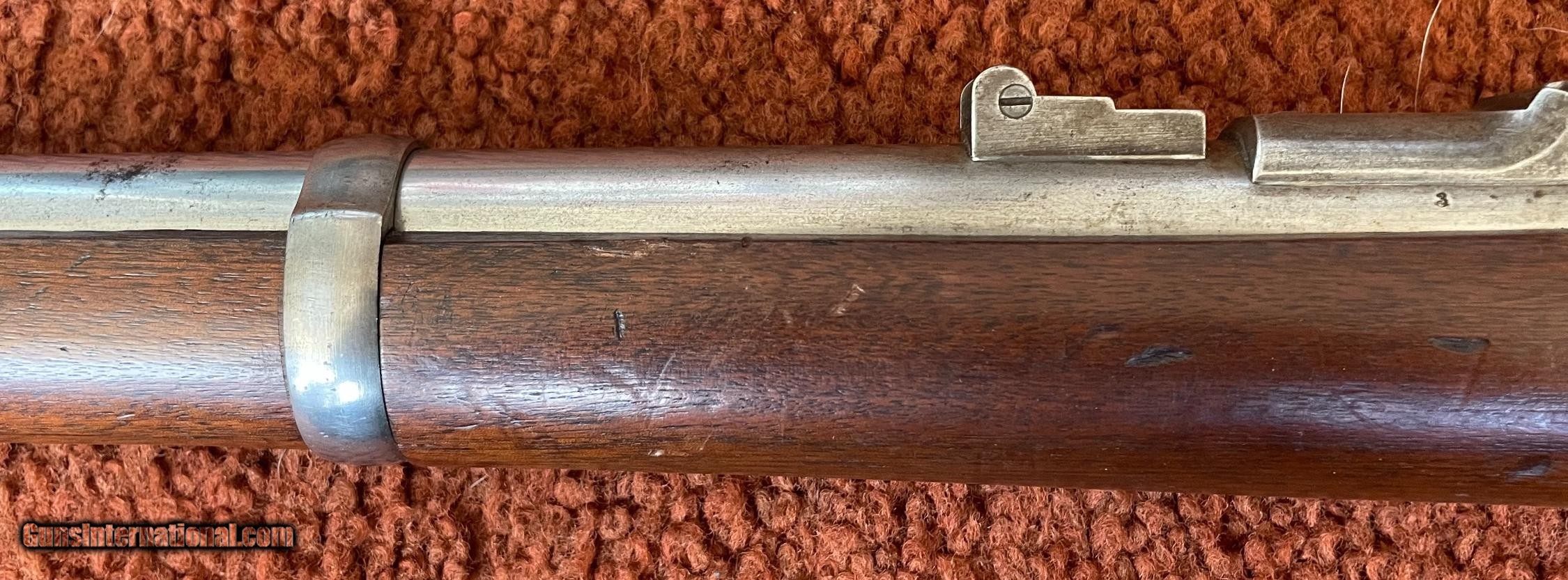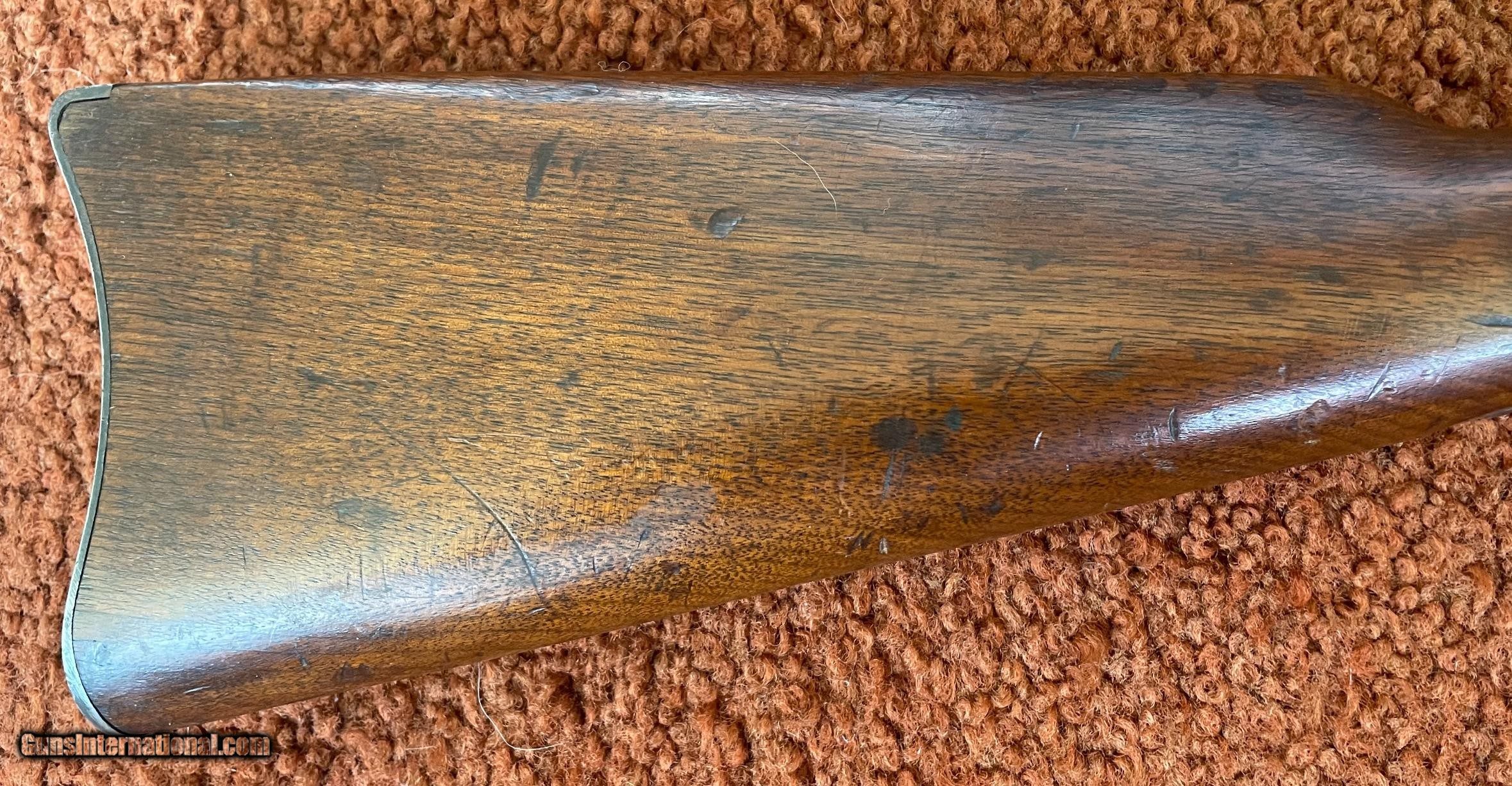 Description: The action is crisp. The bore is very good but the rifled sleeve lacks about 1" from reaching the muzzle There is a crack in the stock beow the lock and on left side See photos for condition. SOLD Antique: Yes Manufacturer: Springfield Armory Model: 2nd Allin Conversion Barrel Length: 36.5 |