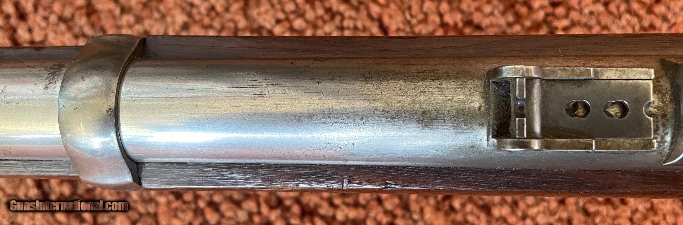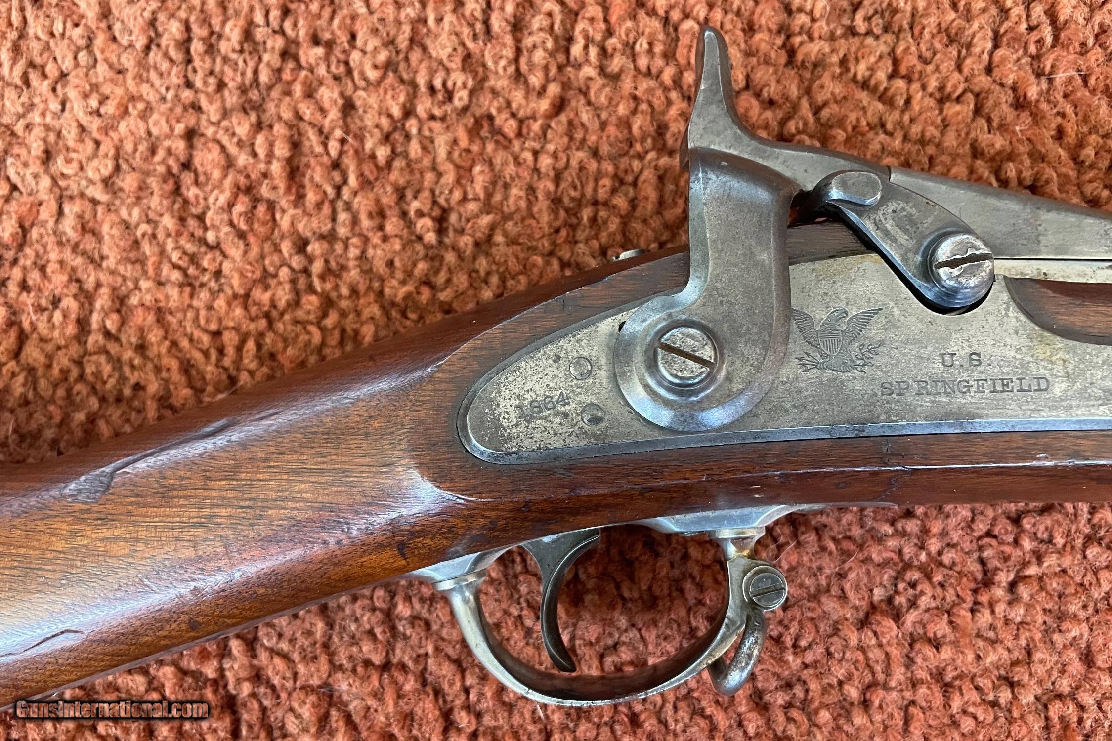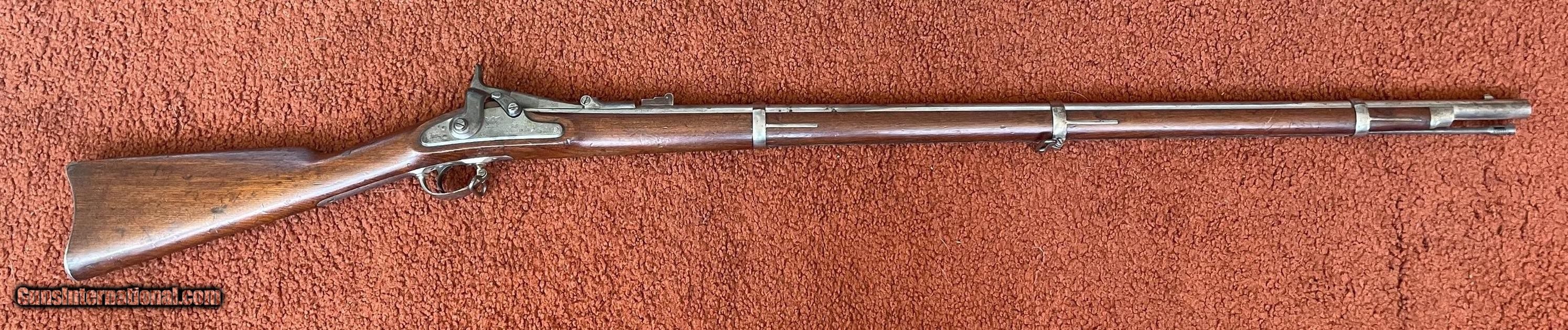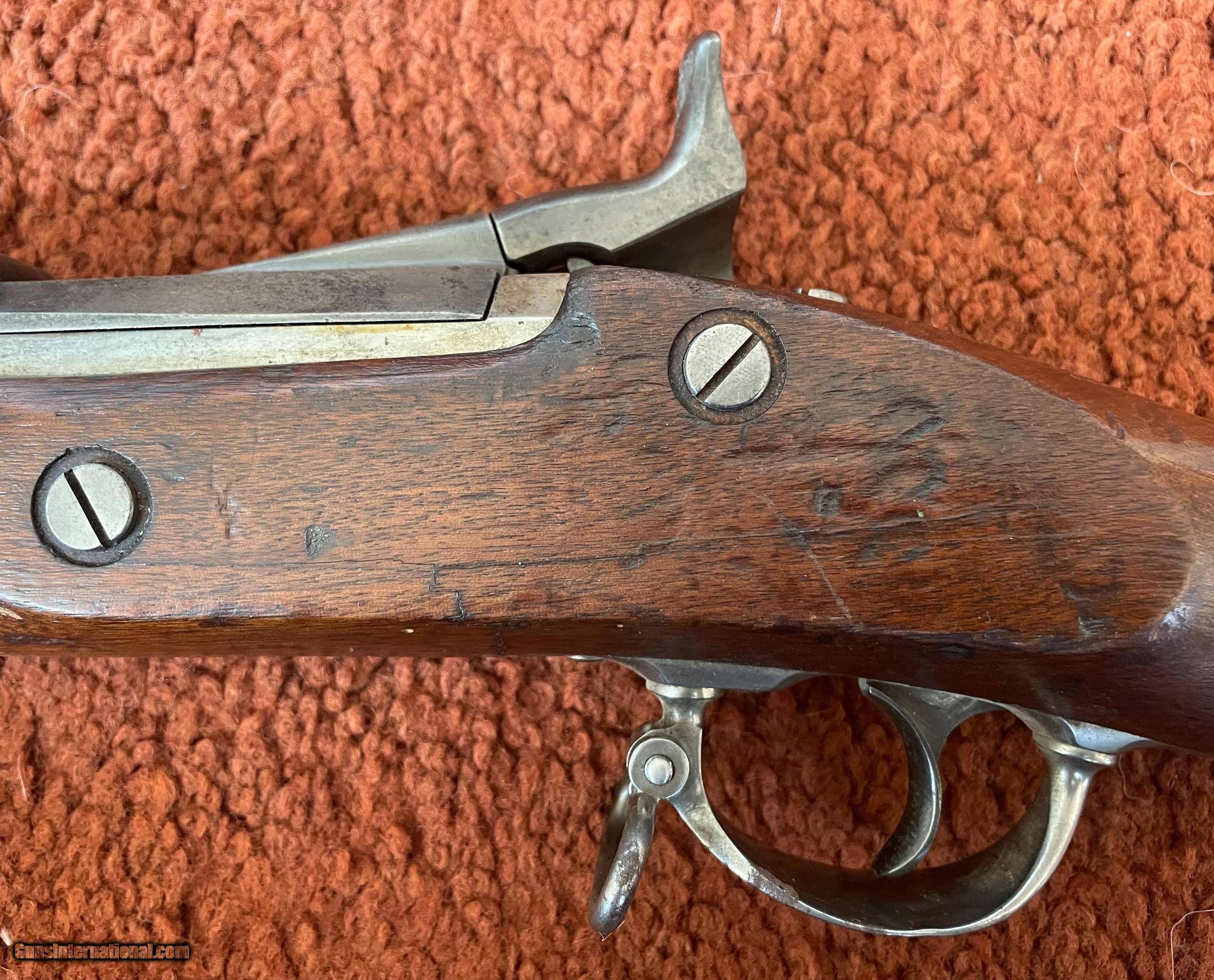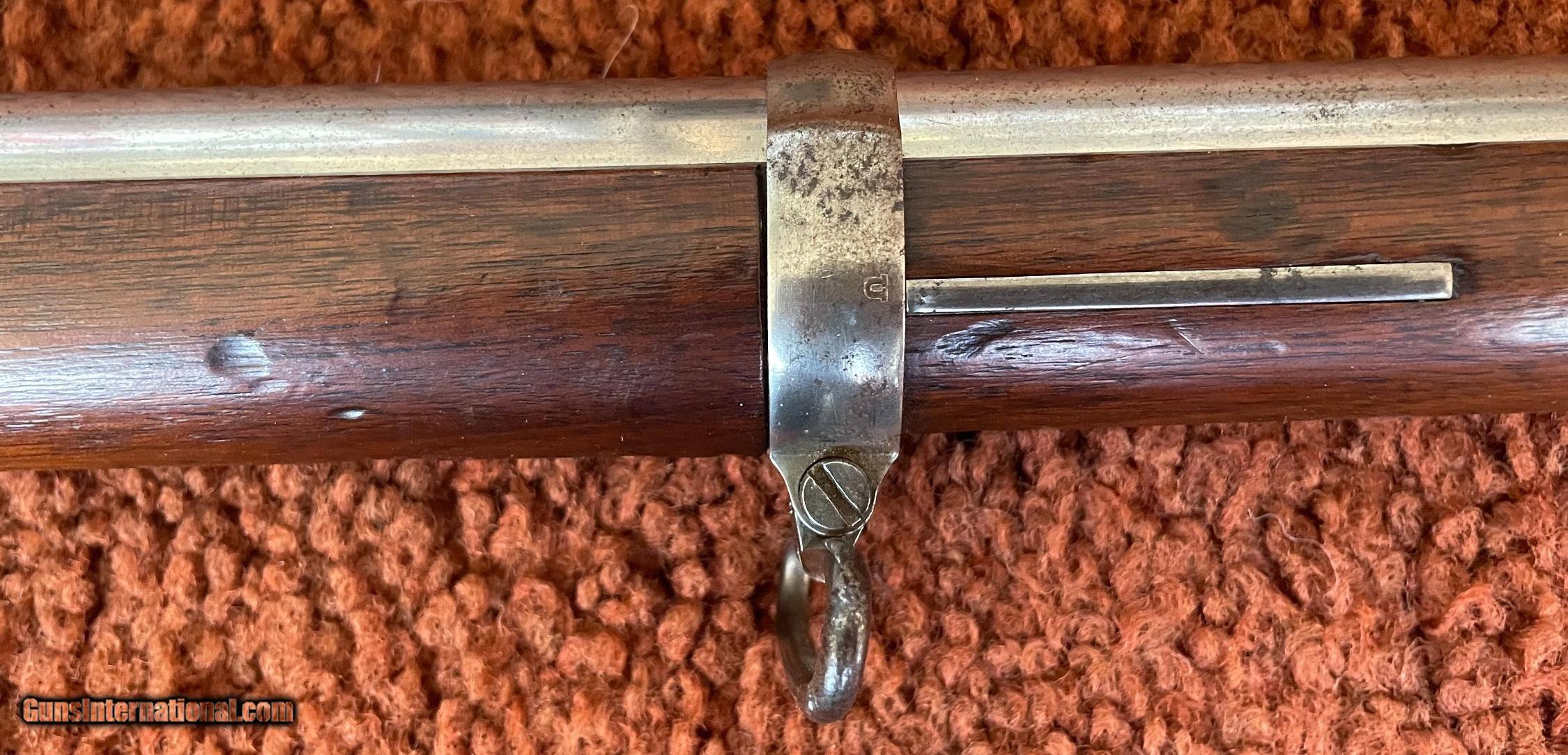 Description: The action is crisp. The bore is very good but the rifled sleeve lacks about 1" from reaching the muzzle There is a crack in the stock beow the lock and on left side See photos for condition. SOLD Antique: Yes Manufacturer: Springfield Armory Model: 2nd Allin Conversion Barrel Length: 36.5 |