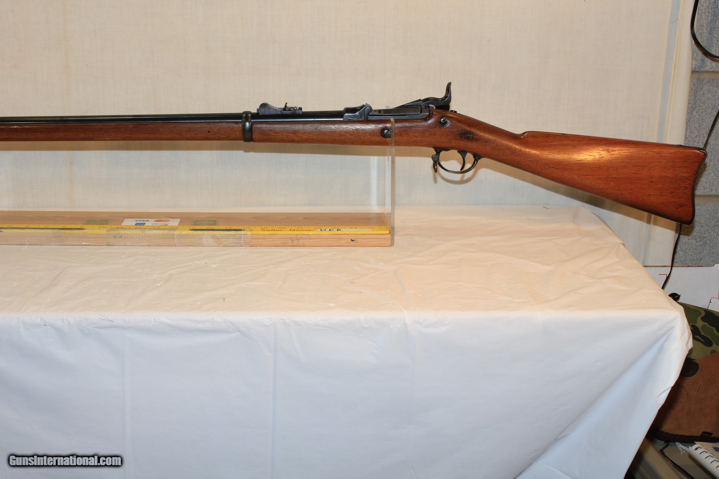 Description: 45-70 rifle with a 32 5/8 inch barrel with a bright bore. The metal retains about 90% thinning reapplied blue which is toning to a plum patina on the 1873 dated case-hardened breechblock. Minor silvering on the heel of the US marked buttplate and a few handling marks overall.The lockplate is properly marked. The barrel displays a very crisp "V/P (eagle head) P" firing proof. The stock rate very good and has been lightly cleaned and has has a light finish applied. The stock has a 1882 cartouche and the circle P firing proof. It is equiped with the proper 1879 rear sight. No paperwork required. $50.00 shipping via Priority Mail SOLD Antique: Yes |