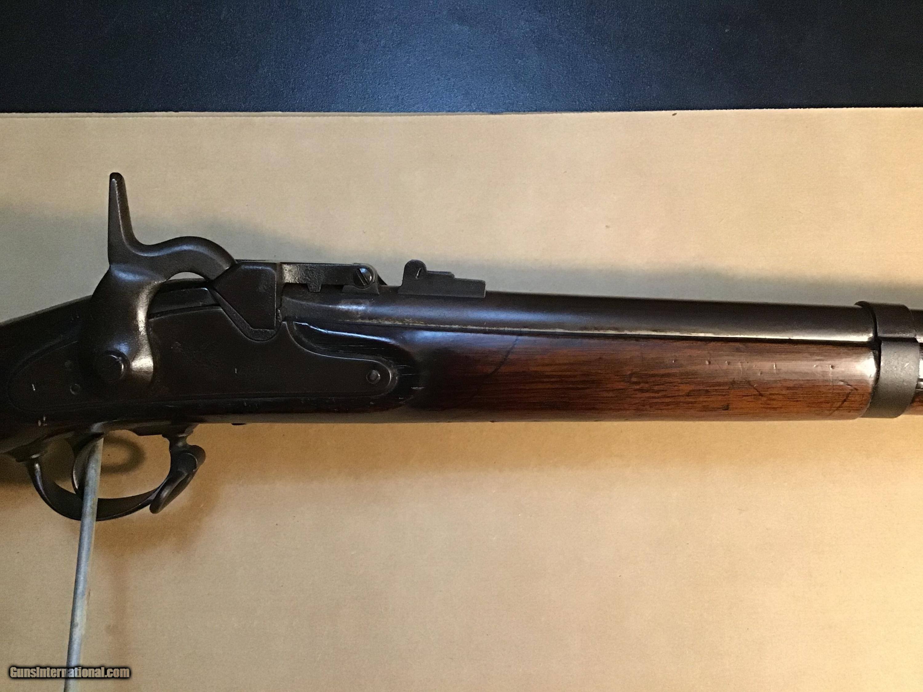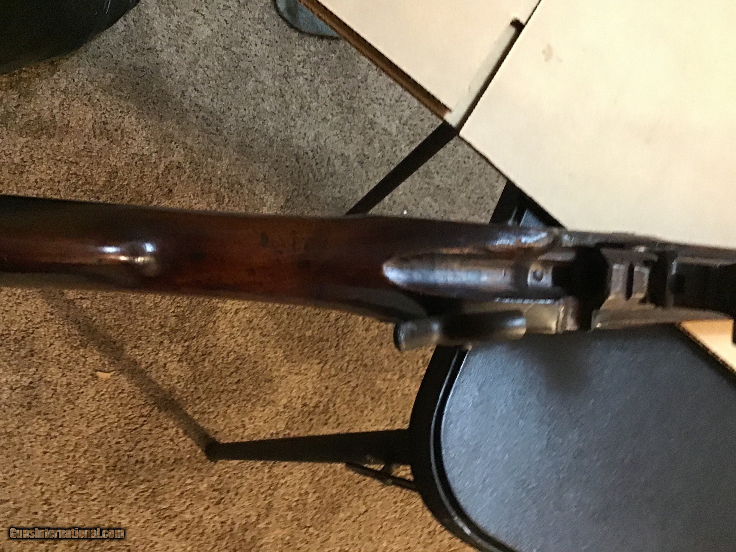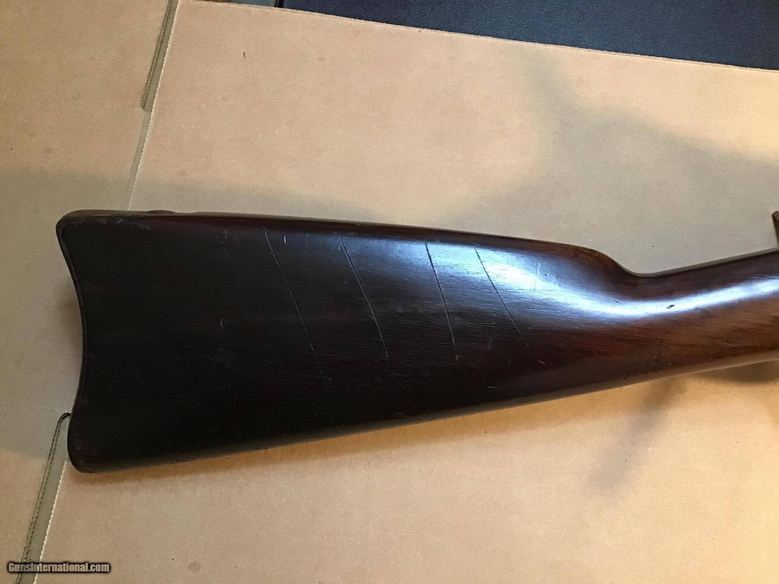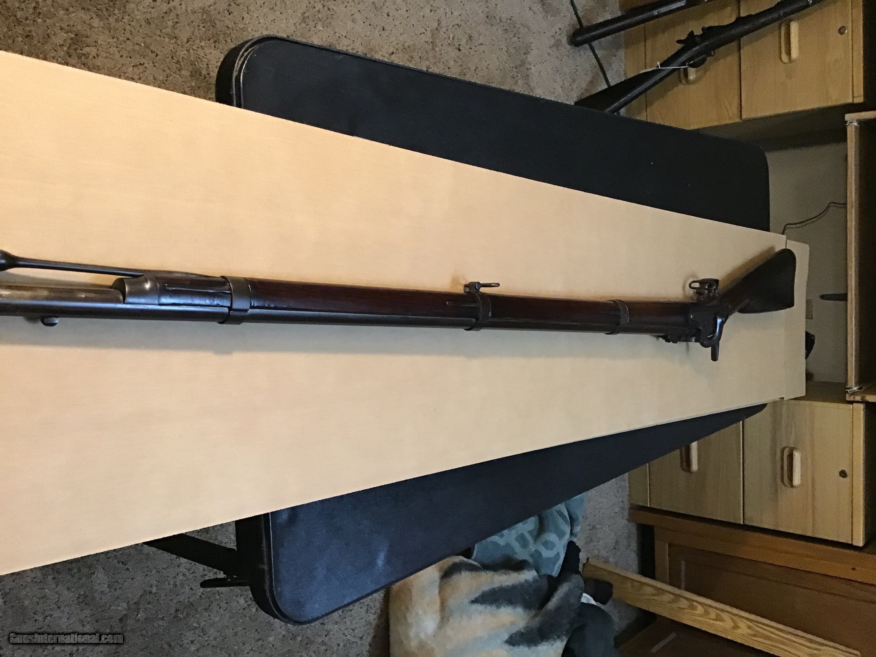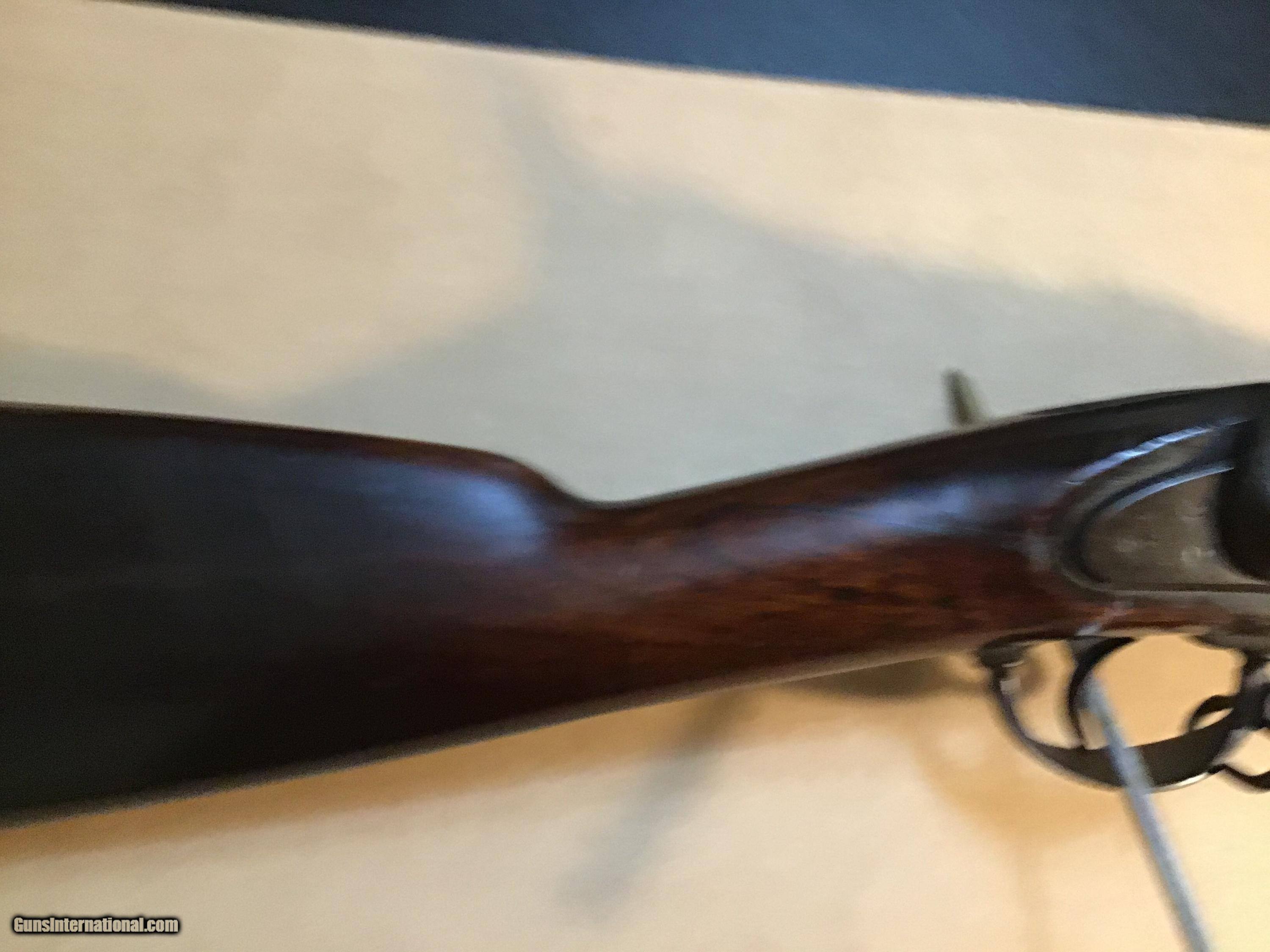 Description: On Hold Originally manufactured in 1864, this Parker Snow & company 58 caliber rifle was one of 2000 upgtaded with the Miller breach system by Meridian manufacturing circa 1865-1867. Blade front and leaf rear sights with the lock plate dated 1864 behind the hammer and eagle and US Parker Snow & Company, Meridian Conn.and Meridian Manufacturing co/meridian. Conn. On top of the breach block along with patent date. This is a very good full length 3 band dark walnut stock with normal scratches and some dents also a fine hairline crack behind the lock. The lock and breach block function fine. The full length barrel and all metal parts have a pleasing brown patina. The bore is also very good. Overal a very nice specimen of a fairly.scarce antique rifle. This original rifle appears complete wit correct ramrod. Please feel free to contact me with any questions. Shipping will be actual cost by usps insured priority mail. On Hold Sale Pending SOLD Antique: Yes Manufacturer: Parker Snow Model: 1861 |