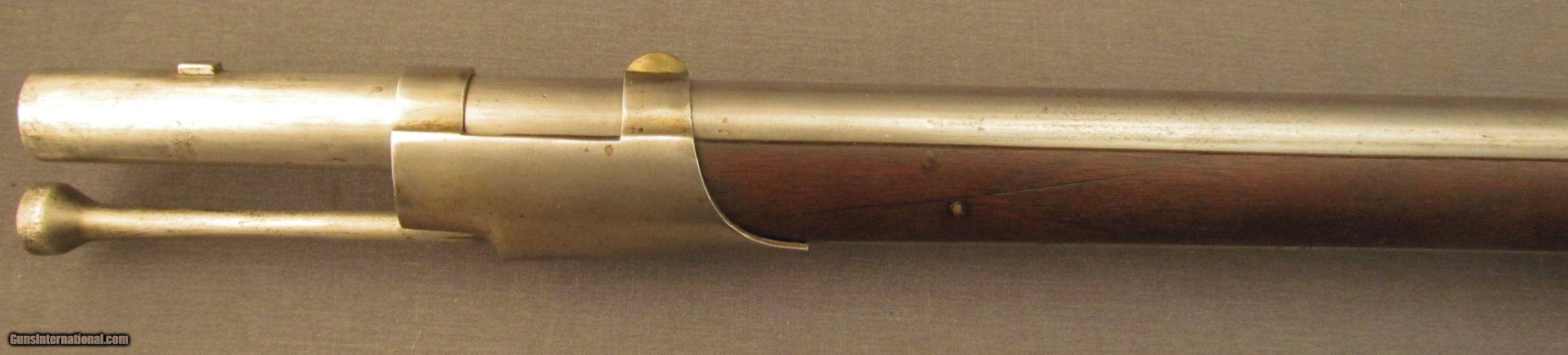 Description: Conversion #26, .68 Caliber, 42" barrel with a good bore that has dark freckling along its length. This is one of the Model 1816 muskets rifled and altered to percussion for the Commonwealth of Pennsylvania by Henry Leman of Philadelphia prior to the Civil War. The metal has an overall, lightly cleaned gray patina with some scattered dark freckling, heavier towards the breech, and lines of light-moderate pitting along the sides of the barrel where the metal meets the wood. The musket has a visible line at the breech and the large bolster with forward angled clean-out screw distinctive to Leman's work. The barrel, percussion breech piece, and the inside of the lock are marked with a conversion number (26), and there is a large “L" hand-struck into the bottom of the barrel as well. The walnut stock has been cleaned and lightly sanded, but still has a legible cartouche on the left side along with some faintly carved initials, all under an added military oil finish. The musket comes with an original Model 1816 “T" mortise bayonet with “US/SC" inspector marking along the flat at the ricasso (SC: Samuel Chandler, Springfield Armory). The bayonet matches the condition of the musket precisely and has a patina that is identical to the rest of the metal. A n old leather sling is fitted that is heavily flaked and crazed, but still fairly supple and intact. The original ramrod is still present and the mechanism functions flawlessly. This is a fine, state-converted musket and would make a fine addition to any collection. {Refs. “U.S. Military Flintlock Muskets And Their Bayonets – The Later Years" by Peter A. Schmidt (2007); “American Military Shoulder Arms – Vol. III" by George D. Moller (2011)} Antique SOLD Antique: Yes Manufacturer: Spfld Model: 1816 Caliber Info: .68 Cal Gauge Info: .68 Cal |