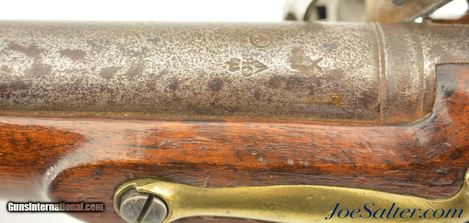 Description: NSN, .78 Caliber, 39" barrel with a good, lightly pitted bore. This is a hefty musket that has the general lines of the Pattern 1839, but with a flintlock instead of percussion. The barrel has a mottled gray-black patina with pinprick pitting along its length, heaviest towards the breech, and the "TOWER" marked lock with "VR" cypher has a lightly freckled, armory bright patina. The pin-fastened walnut stock has a thick varnish added over numerous small handling marks and blemishes scattered throughout. The Board of Ordnance "(Broad Arrow) / BO" stamp is still sharp on the right side of the buttstock, and the brass trigger guard and ramrod pipes have a mild yellow-ochre patina. The lock is fully functional, and a period, but incorrect iron ramrod is included. Interestingly, the barrel breech and inside of the lockplate are stamped with unusual Broad Arrow in circle stamps, reminiscent of Canadian property stamps used between WW1 until just after WW2. Their significance is unknown, but the musket may well have remained in government stores for some reason, and was therefore property stamped as required by regulations. In any event, this is an extremely rare British musket, in fine condition, and would make a splendid addition to any collection. Antique SOLD Antique: Yes |