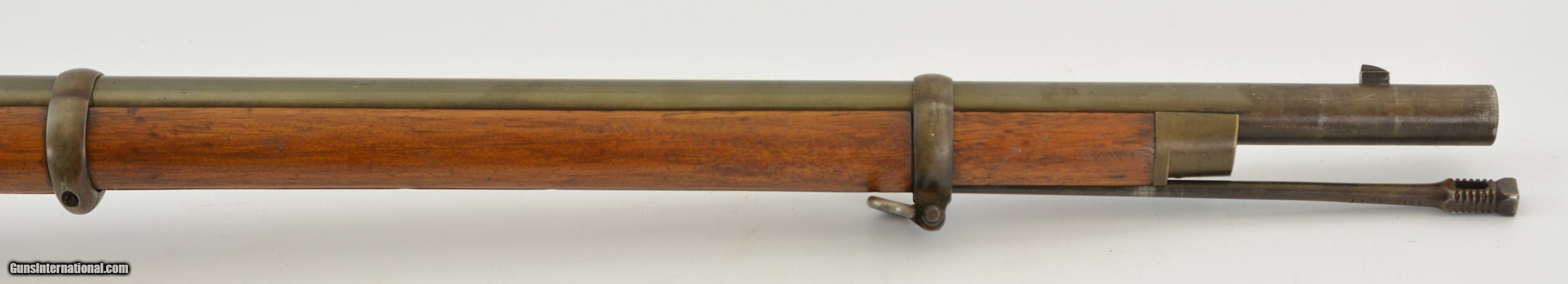 Description: This lot consists of a Canadian issue snider, bayonet, scabbard, helmet and helmet tin all marked to the 30th Wellington Battalion of Rifles (Canadian Militia) ironically this item was sourced out of the State of California. In addition we have some information relating to prior ownership. The snider is a MKII* showing a bright lock, rear sight and actin block. The barrel was cleaned by a prior owner and is a dull grey. DC marked stock, both the butt tang and rod are marked 30 #491. The bayonet is marked 30 #515 and the scabbard 30 #823. The 30th is one of the Canadian Units that had involvement with the Fenian intrusions. The helmet is a home service pattern which is complete and mounted with a silver 30th Battalion/Canada militia badge, the same pattern is shown on page 77 of the book "Fuss & Dashion, 200 years of Canadian Military Headdress" by our late friend Clive M. Law. SOLD Antique: Yes Manufacturer: Canadian Model: Snider Caliber Info: .577 Gauge Info: .577 |
