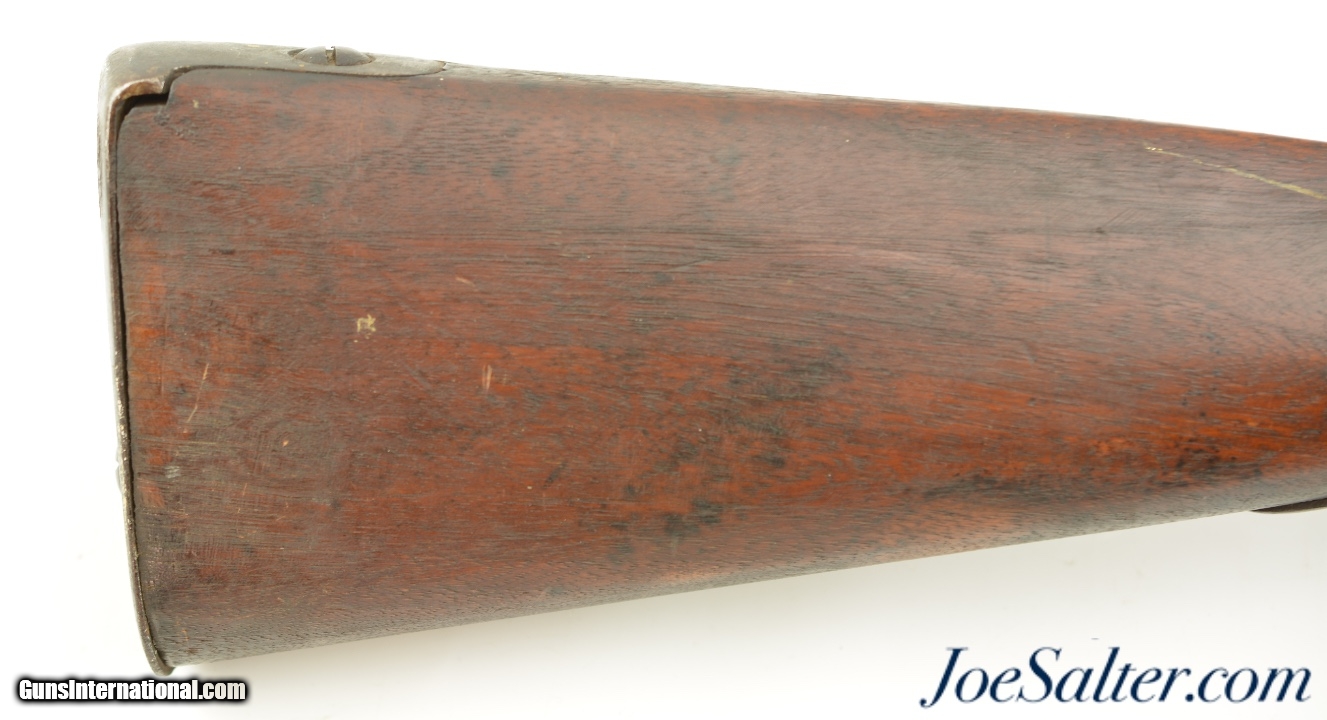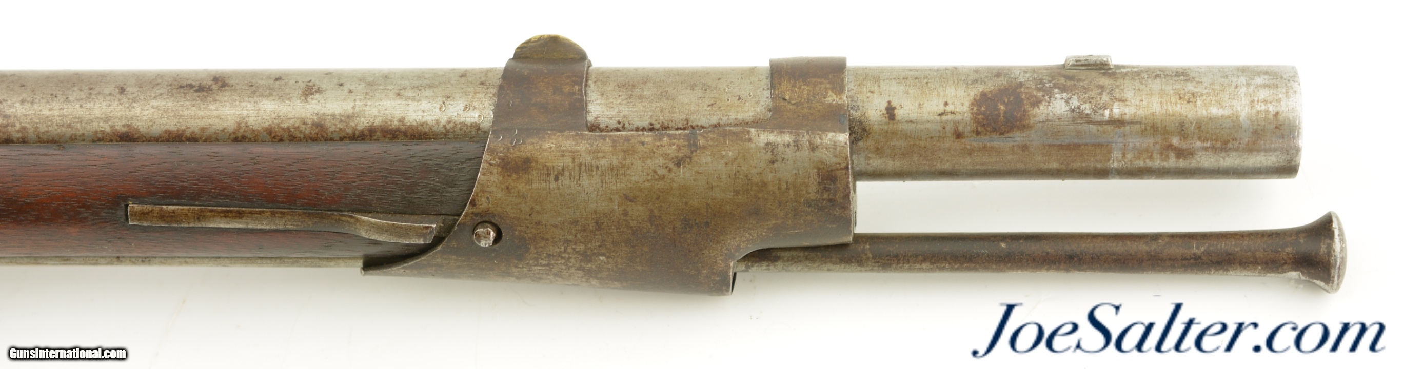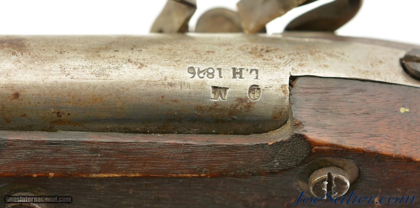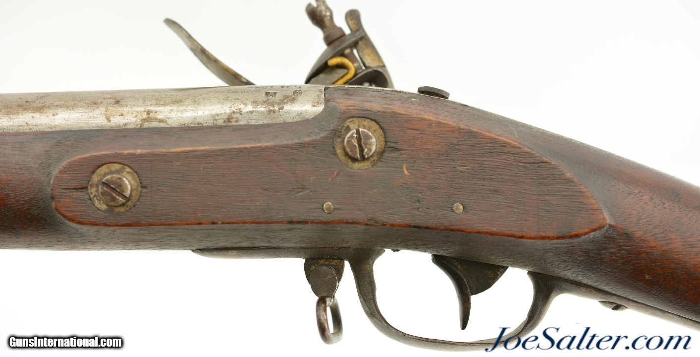 Description: NSN, .69 Caliber, 42" barrel with a very good, lightly pitted bore. This is a handsome musket, built with Charleville / Springfield type furniture, and having an imported British lock by Ashmore. The barrel has a mostly gray patina with thin patches of plum-brown freckling along its length, and clear markings at the breech, including an 1826 date and "LH" inspector markings (probably Luke Harrington, the state "barrel prover" of Worcester County, and whose initials have been found on barrels made by Elijah and Asa Waters of Millbury, MA). The fully functional lock has a matching, mostly gray patina with crisp decorative engraving and clear "R / ASHMORE / WARRANTED" markings beneath the pan. The walnut stock is in very good shape, with minor handling marks and small surface blemishes scattered throughout the old military oil finish. Some heavier pitting and a darker brown patina is visible on the iron buttplate, and the original iron ramrod is still present. In his book "Massachusetts Military Shoulder Arms 1784 & 1877" (1988), George Moller illustrates several muskets of nearly identical pattern, describing them as "variant armory pattern" muskets. This is a fantastic looking early American commercial militia pattern musket, and is in very good-fine condition overall. Antique; Price: $2,495.00 Contact Seller |