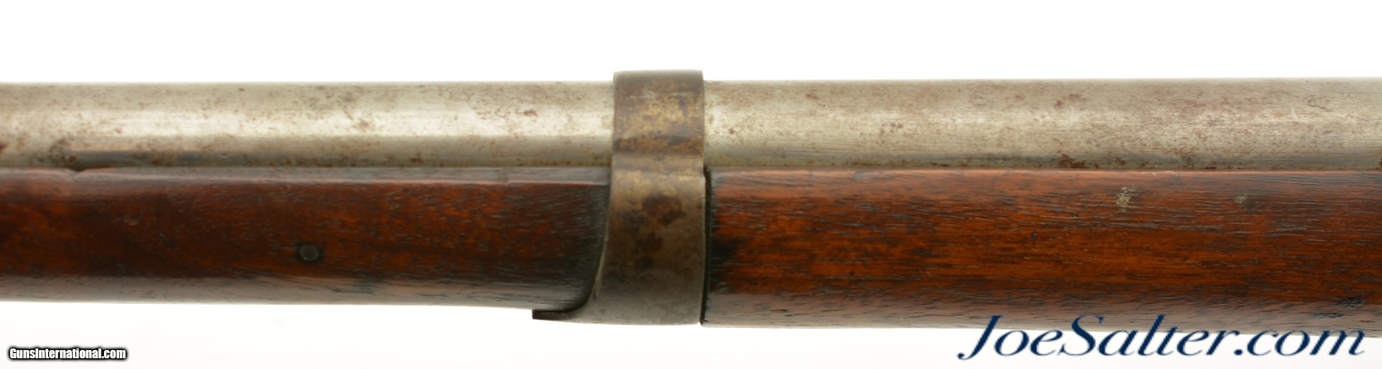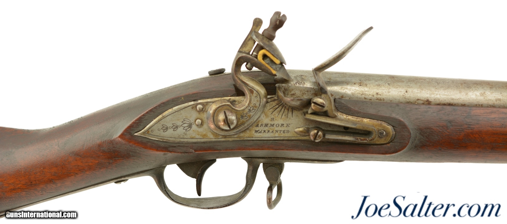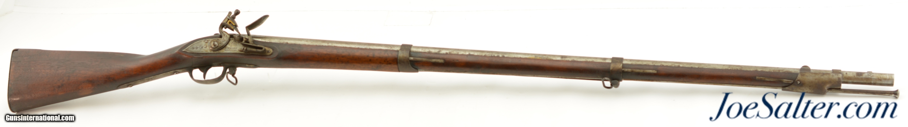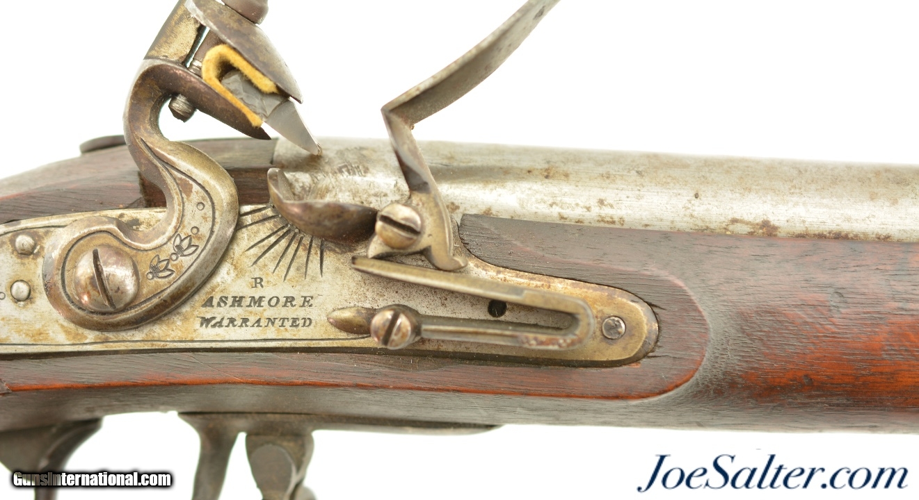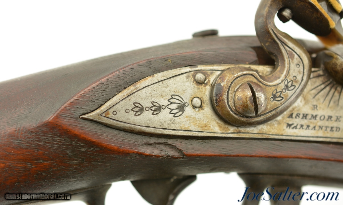 Description: NSN, .69 Caliber, 42" barrel with a very good, lightly pitted bore. This is a handsome musket, built with Charleville / Springfield type furniture, and having an imported British lock by Ashmore. The barrel has a mostly gray patina with thin patches of plum-brown freckling along its length, and clear markings at the breech, including an 1826 date and "LH" inspector markings (probably Luke Harrington, the state "barrel prover" of Worcester County, and whose initials have been found on barrels made by Elijah and Asa Waters of Millbury, MA). The fully functional lock has a matching, mostly gray patina with crisp decorative engraving and clear "R / ASHMORE / WARRANTED" markings beneath the pan. The walnut stock is in very good shape, with minor handling marks and small surface blemishes scattered throughout the old military oil finish. Some heavier pitting and a darker brown patina is visible on the iron buttplate, and the original iron ramrod is still present. In his book "Massachusetts Military Shoulder Arms 1784 & 1877" (1988), George Moller illustrates several muskets of nearly identical pattern, describing them as "variant armory pattern" muskets. This is a fantastic looking early American commercial militia pattern musket, and is in very good-fine condition overall. Antique; Price: $2,495.00 Contact Seller |