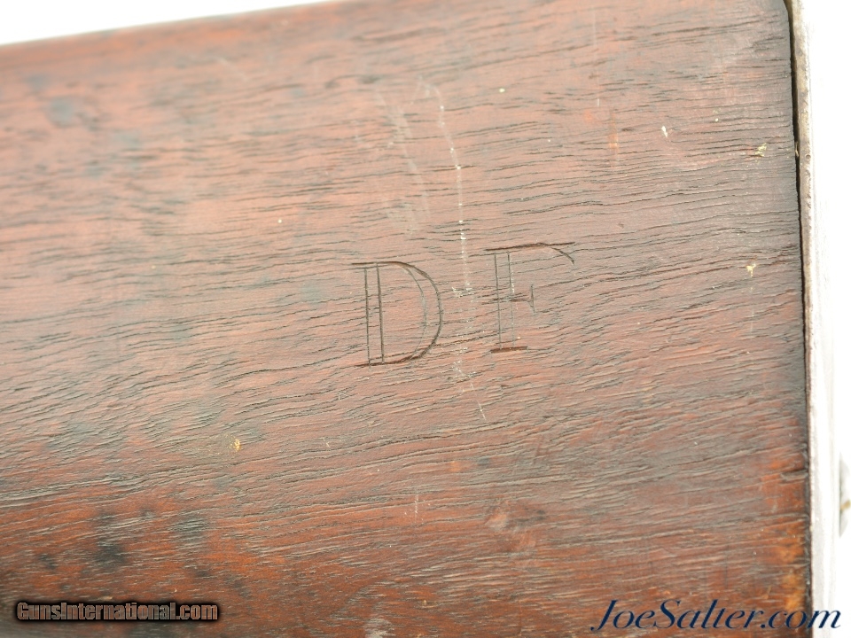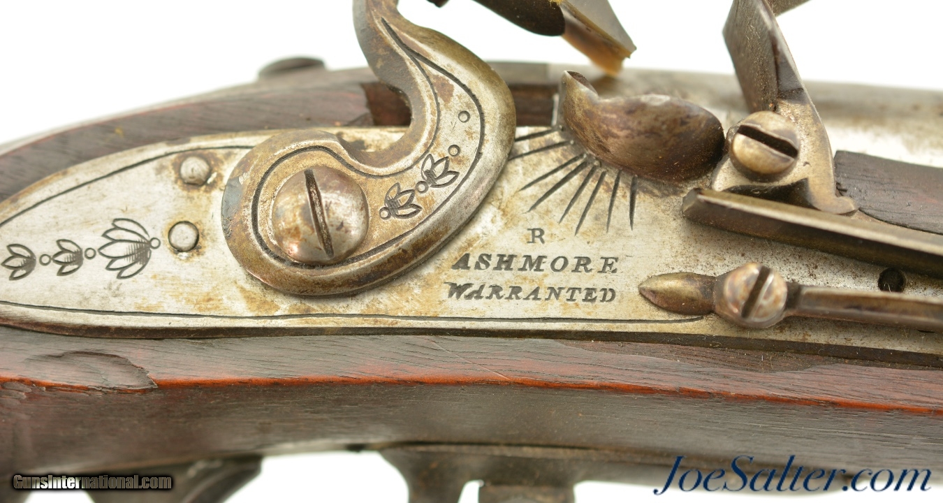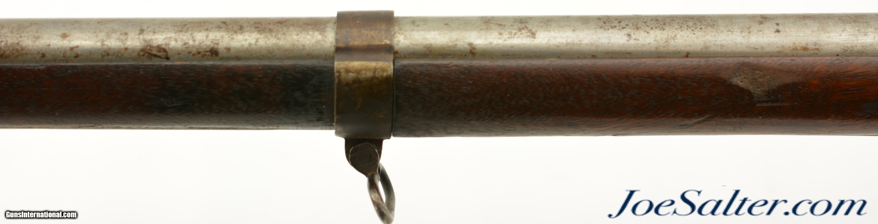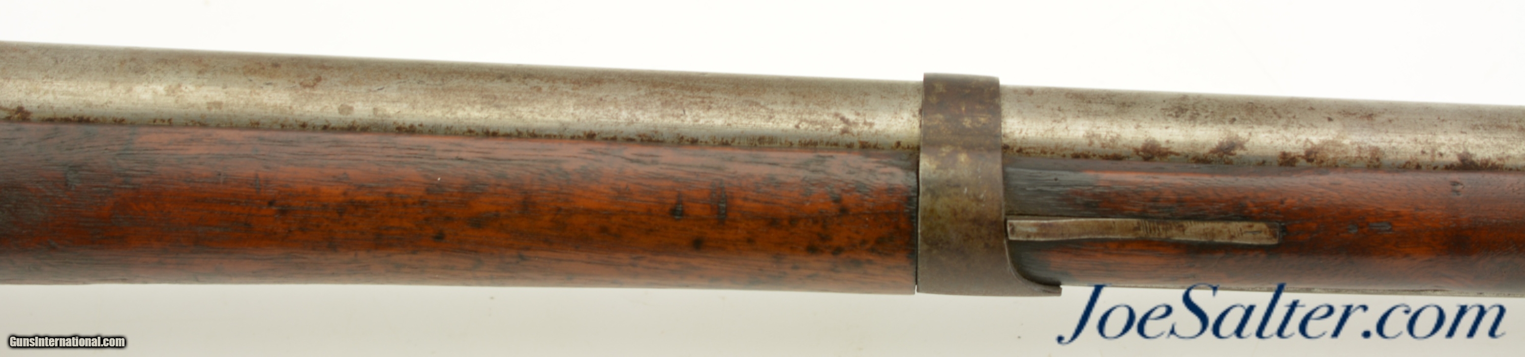 Description: NSN, .69 Caliber, 42" barrel with a very good, lightly pitted bore. This is a handsome musket, built with Charleville / Springfield type furniture, and having an imported British lock by Ashmore. The barrel has a mostly gray patina with thin patches of plum-brown freckling along its length, and clear markings at the breech, including an 1826 date and "LH" inspector markings (probably Luke Harrington, the state "barrel prover" of Worcester County, and whose initials have been found on barrels made by Elijah and Asa Waters of Millbury, MA). The fully functional lock has a matching, mostly gray patina with crisp decorative engraving and clear "R / ASHMORE / WARRANTED" markings beneath the pan. The walnut stock is in very good shape, with minor handling marks and small surface blemishes scattered throughout the old military oil finish. Some heavier pitting and a darker brown patina is visible on the iron buttplate, and the original iron ramrod is still present. In his book "Massachusetts Military Shoulder Arms 1784 & 1877" (1988), George Moller illustrates several muskets of nearly identical pattern, describing them as "variant armory pattern" muskets. This is a fantastic looking early American commercial militia pattern musket, and is in very good-fine condition overall. Antique; Price: $2,495.00 Contact Seller |