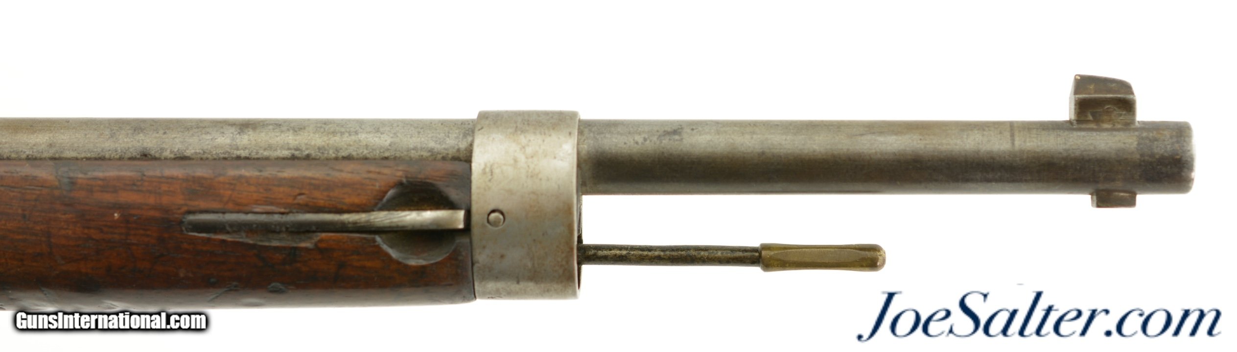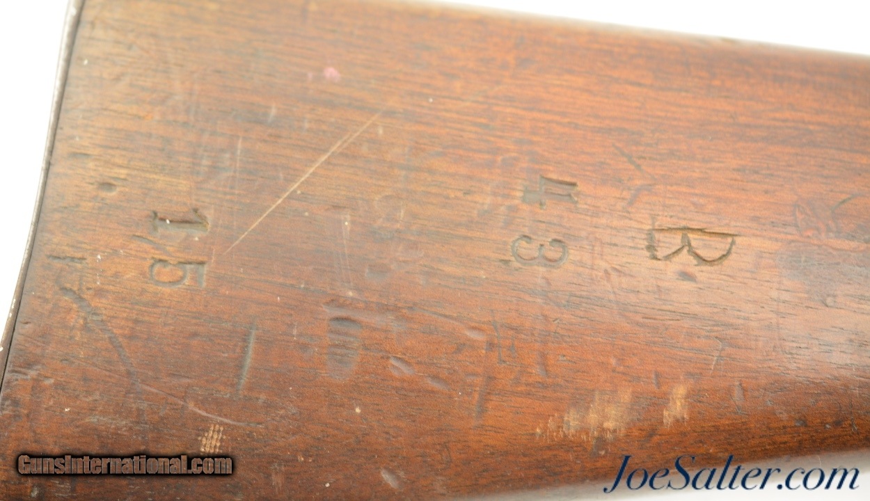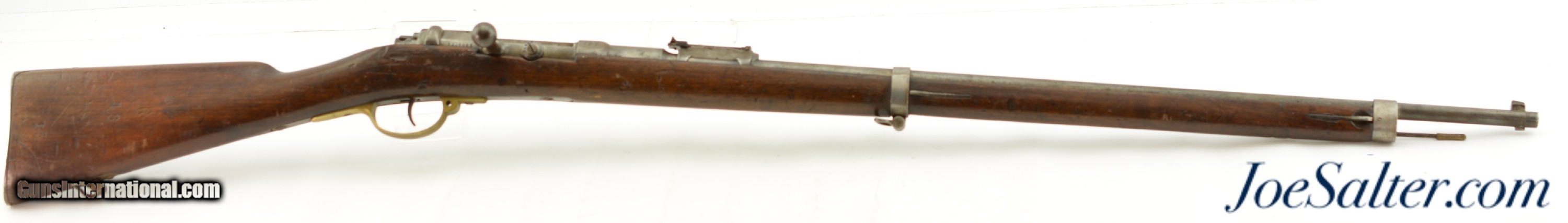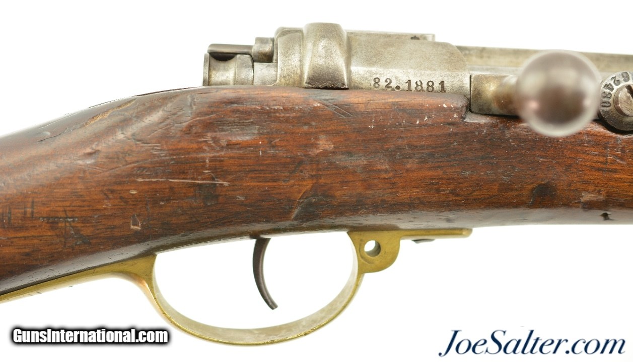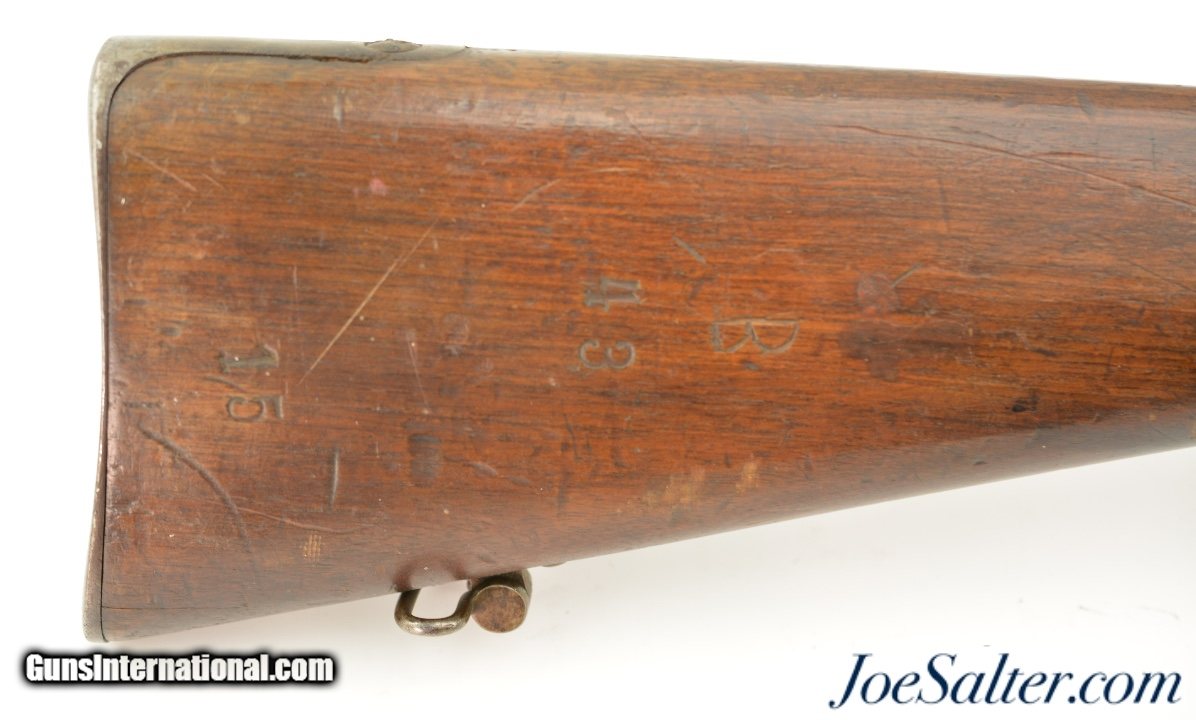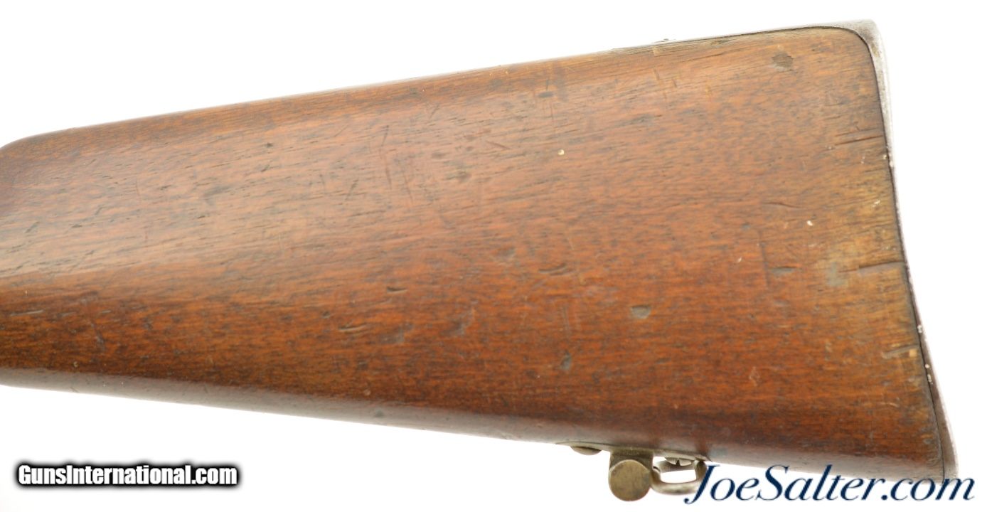 Description: Serial #92053, 6.5mm Daudeteau, 31 1/2" barrel with a fine, bright bore that has some minor freckling within the grooves. This is a French conversion of an 1888-made Gew. 1871 Mauser rifle to a small-bore, high-speed smokeless cartridge for the Uruguayan military in the 1890s. The rifle consists of a standard Gew. 1871 action with mismatched bolt, mated to a St. Denis-made barrel fitted with Lebel-Berthier type rear sight. The metal has an overall pewter gray patina with some mild surface freckling mixing in, and a single area of moderate pitting on the plum-brown bolt handle. The walnut stock has numerous small handling marks and blemishes scattered throughout the reapplied military oil finish. The rifle is accompanied by a correct cleaning rod and the action is fully functional. These rifles worked well, but were quickly replaced by Mauser Model 1895 rifles soon after their arrival. This is a very good example of a rarely seen Franco-German rifle built for the South American market. Antique; Antique: Yes Price: $695.00 Contact Seller |