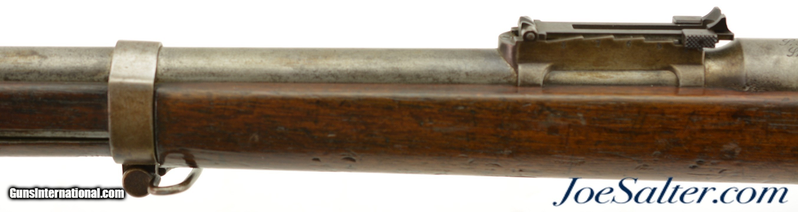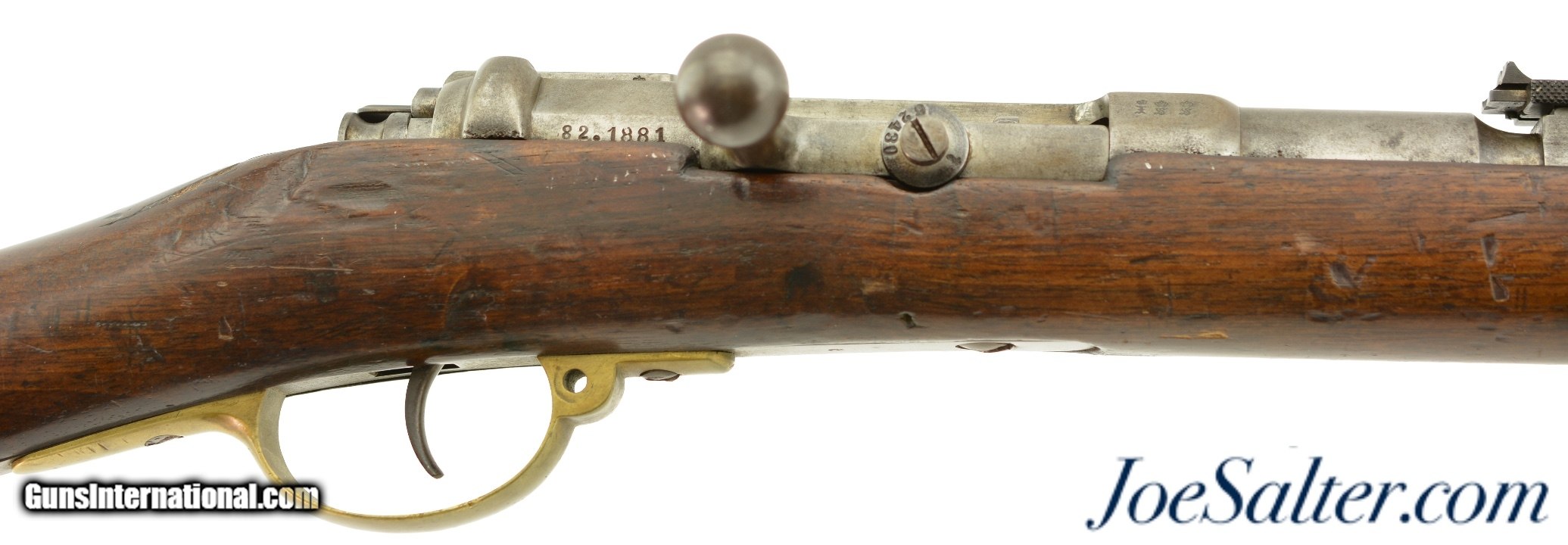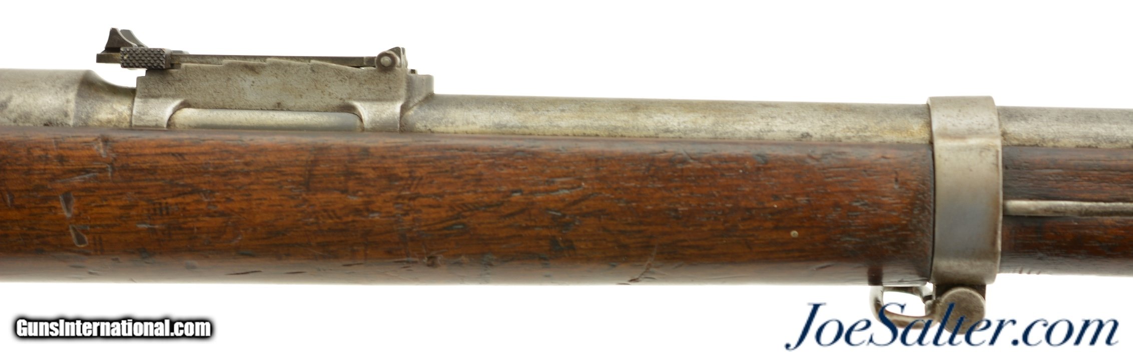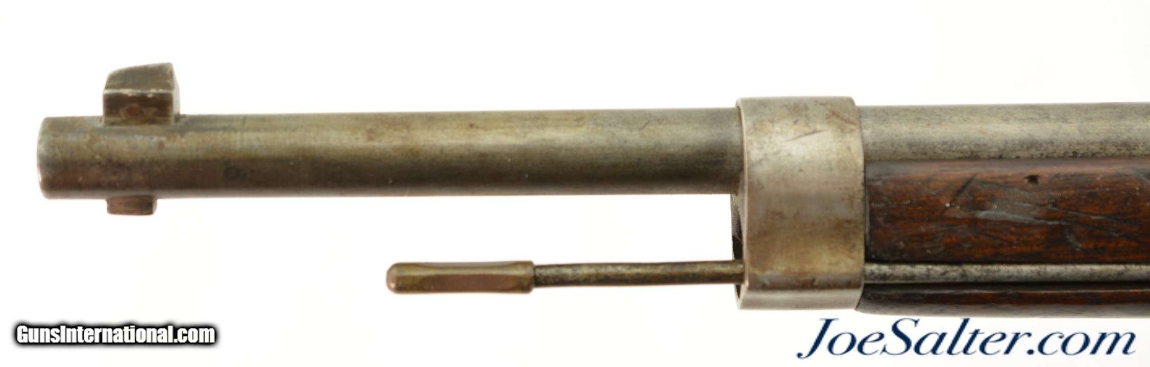 Description: Serial #92053, 6.5mm Daudeteau, 31 1/2" barrel with a fine, bright bore that has some minor freckling within the grooves. This is a French conversion of an 1888-made Gew. 1871 Mauser rifle to a small-bore, high-speed smokeless cartridge for the Uruguayan military in the 1890s. The rifle consists of a standard Gew. 1871 action with mismatched bolt, mated to a St. Denis-made barrel fitted with Lebel-Berthier type rear sight. The metal has an overall pewter gray patina with some mild surface freckling mixing in, and a single area of moderate pitting on the plum-brown bolt handle. The walnut stock has numerous small handling marks and blemishes scattered throughout the reapplied military oil finish. The rifle is accompanied by a correct cleaning rod and the action is fully functional. These rifles worked well, but were quickly replaced by Mauser Model 1895 rifles soon after their arrival. This is a very good example of a rarely seen Franco-German rifle built for the South American market. Antique; Antique: Yes Price: $695.00 Contact Seller |