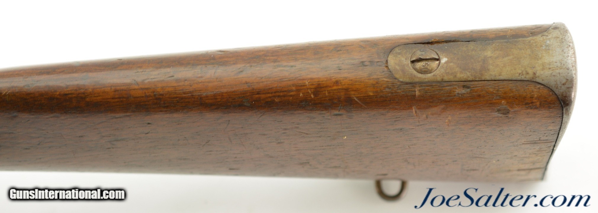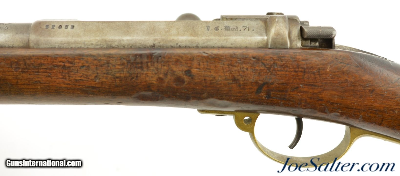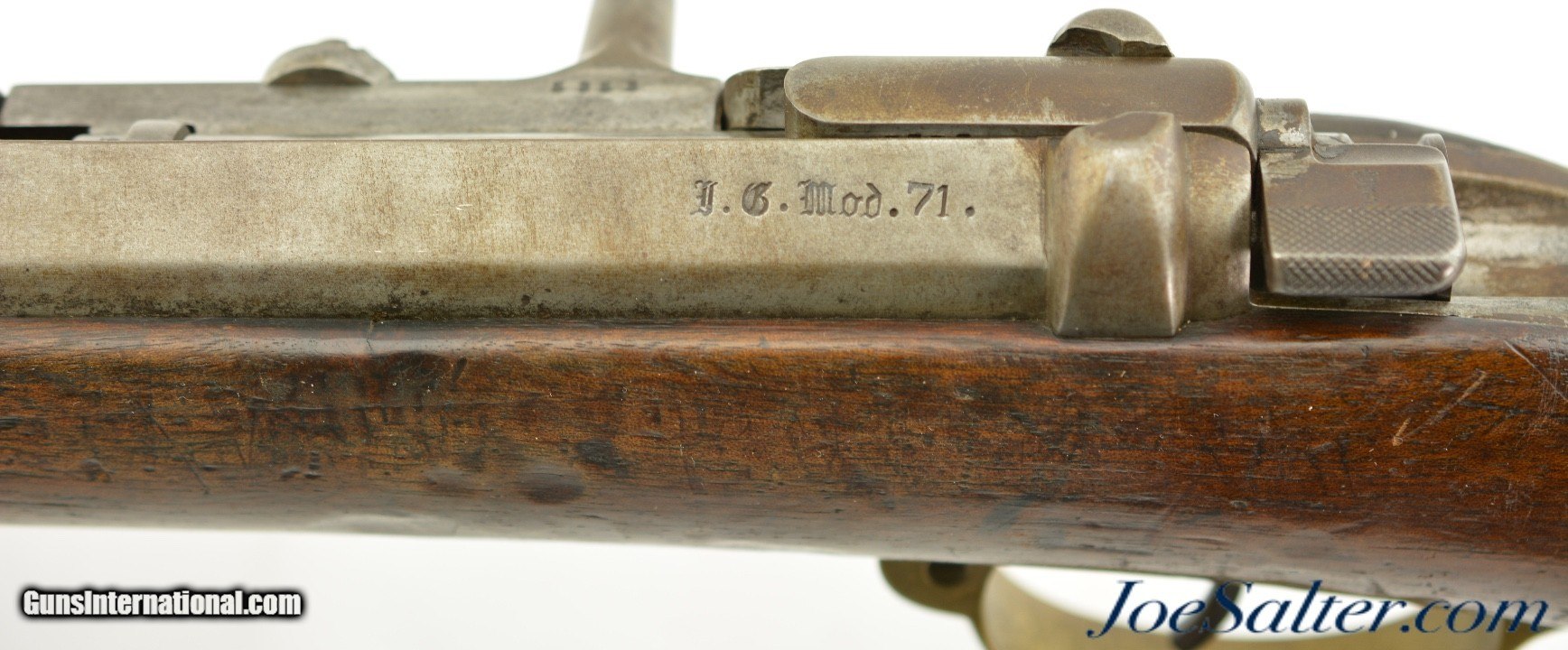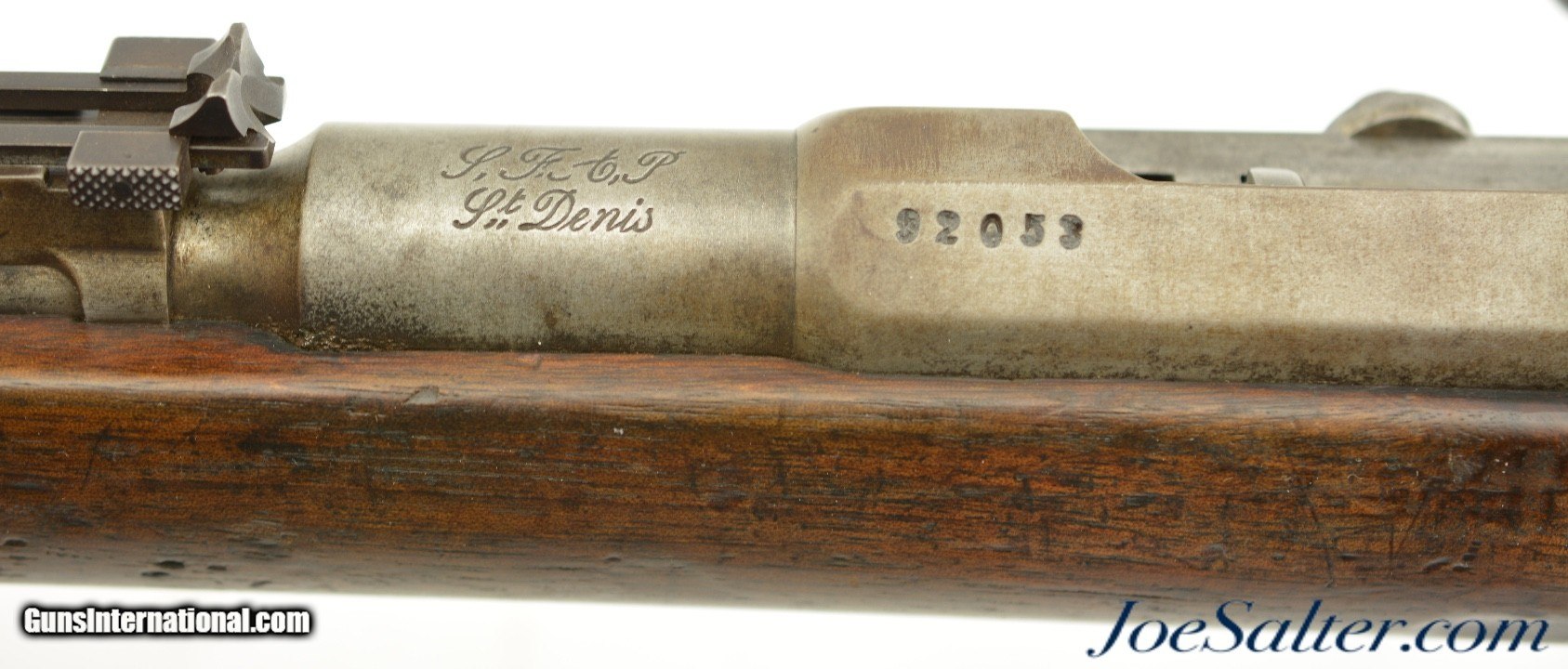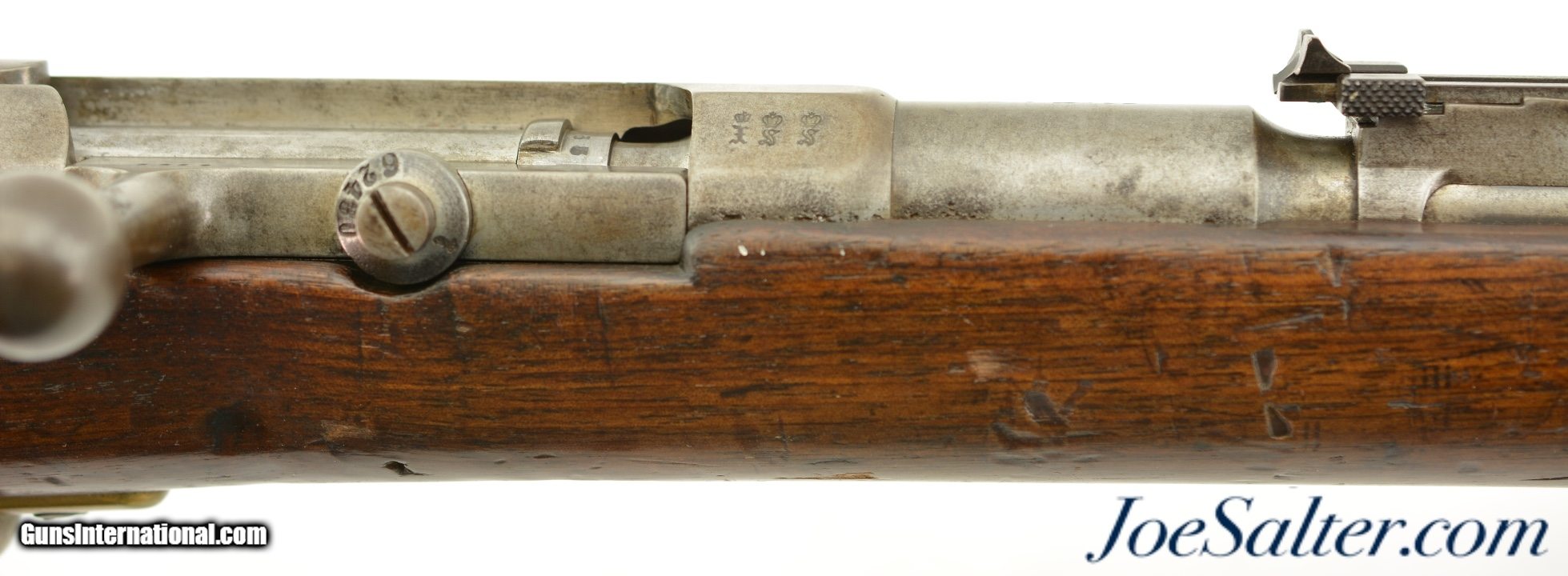 Description: Serial #92053, 6.5mm Daudeteau, 31 1/2" barrel with a fine, bright bore that has some minor freckling within the grooves. This is a French conversion of an 1888-made Gew. 1871 Mauser rifle to a small-bore, high-speed smokeless cartridge for the Uruguayan military in the 1890s. The rifle consists of a standard Gew. 1871 action with mismatched bolt, mated to a St. Denis-made barrel fitted with Lebel-Berthier type rear sight. The metal has an overall pewter gray patina with some mild surface freckling mixing in, and a single area of moderate pitting on the plum-brown bolt handle. The walnut stock has numerous small handling marks and blemishes scattered throughout the reapplied military oil finish. The rifle is accompanied by a correct cleaning rod and the action is fully functional. These rifles worked well, but were quickly replaced by Mauser Model 1895 rifles soon after their arrival. This is a very good example of a rarely seen Franco-German rifle built for the South American market. Antique; Antique: Yes Price: $695.00 Contact Seller |