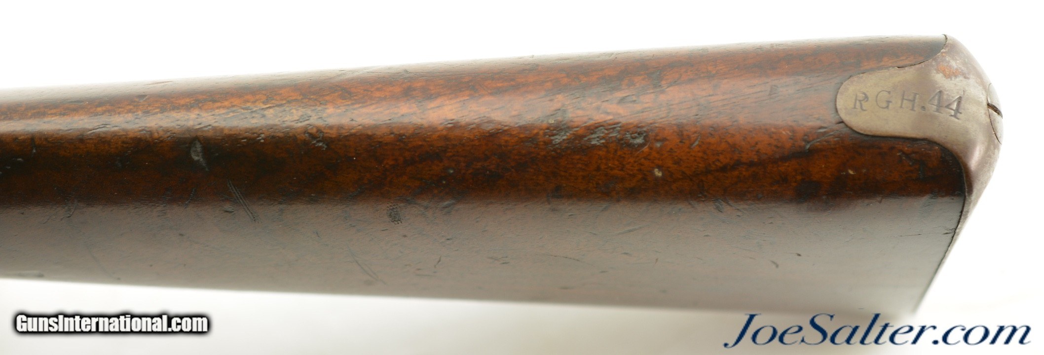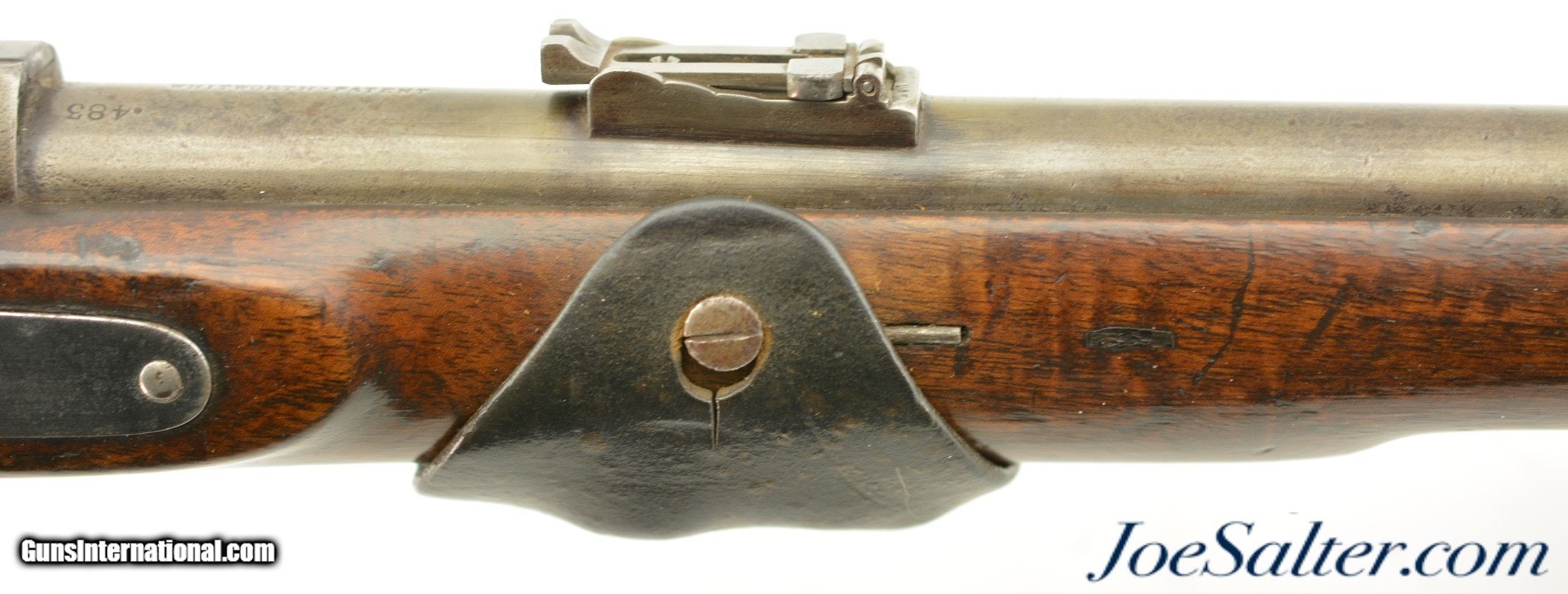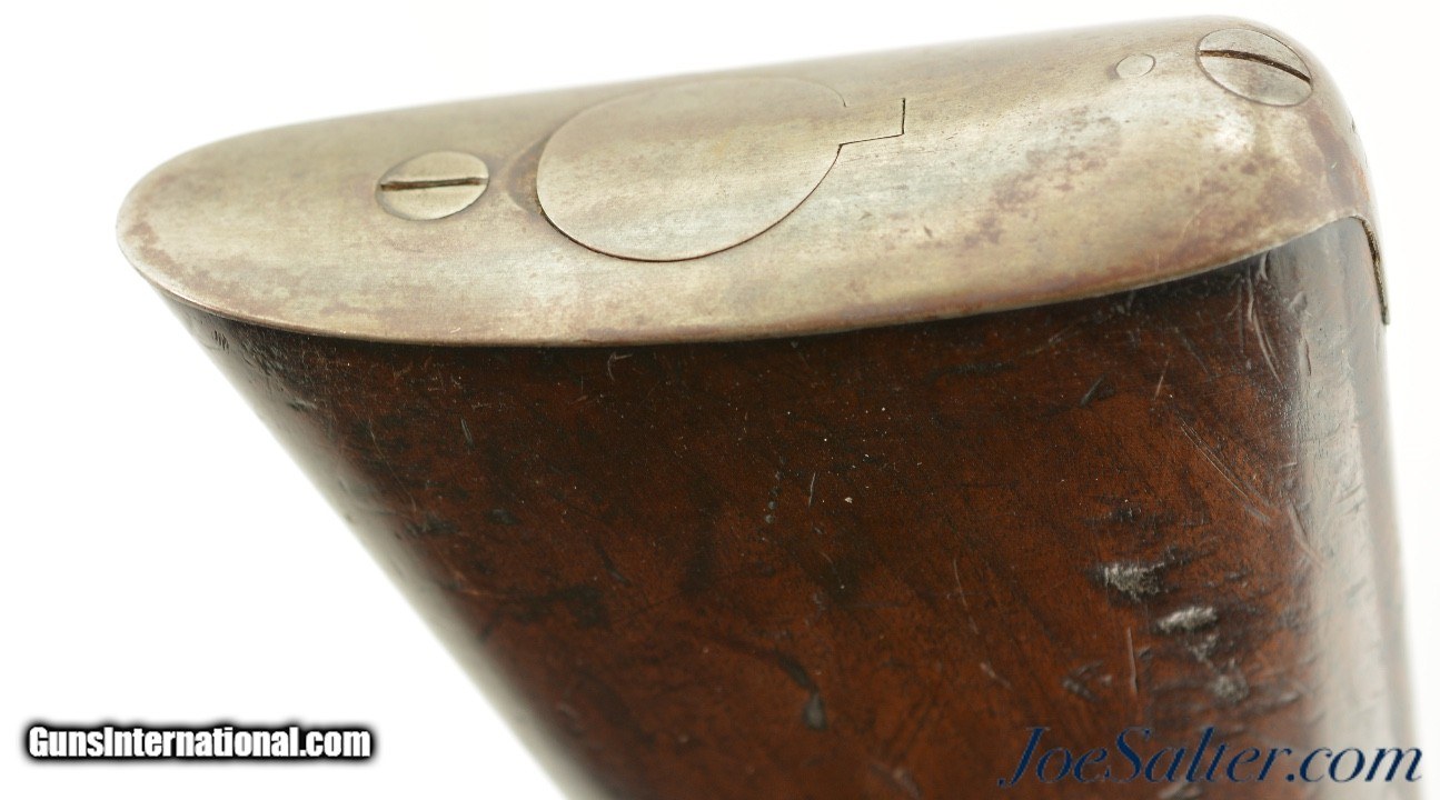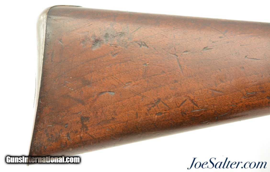 Description: Serial #197, .451 Caliber, 19" barrel with a very good, bright bore that has mild freckling and light pitting within the grooves. This is an 1861-dated carbine, and one of only sixty privately purchesed to arm select troopers of the Royal Gloucestershire Hussars. The carbine has matching serial numbers on the receiver, breech lever, rear sight, and on the underside of the wrist just behind the tip of the lower tang. The barrel and receiver have a mottled gray and plum-brown patina with some pitting present on and around the nipple bolster at the breech. The breech lever has a slightly grayer tone, as does the hammer, while the "WESTLEY RICHARDS & Co. / 1861" marked lockplate has a smooth bluish-gray patina with added blue visible along its length. The walnut stock has a thick added oil finish over numerous small handling marks and minor blemishes scattered throughout, but there are no noticeable cracks or chips in the wood. The brass trigger guard and buttplate have developed a dark ochre patina over time, with a clear unit issue marking on the buttplate tang: "RGH.44" (Royal Gloucester Hussars, carbine number 44). The carbine comes equipped with the original steel ramrod, leather sight cover, and chained nipple protector. In 1861, Charles Somerset, 8th Duke of Beaufort, purchased 60 Monkey Tail carbines at his own expense to equip the best marksmen in the regiment, who were to act as outriders and skirmishers, with a quick loading, capping breechloader capable of rapid fire. The carbines were issued at the rate of 12 per squadron, until 1871, when Monkey Tails were adopted for the entire regiment. This is a truly rare piece of Victorian British military history, and is in very good-near fine condition overall. Antique; Antique: Yes Price: $3,795.00 Contact Seller |