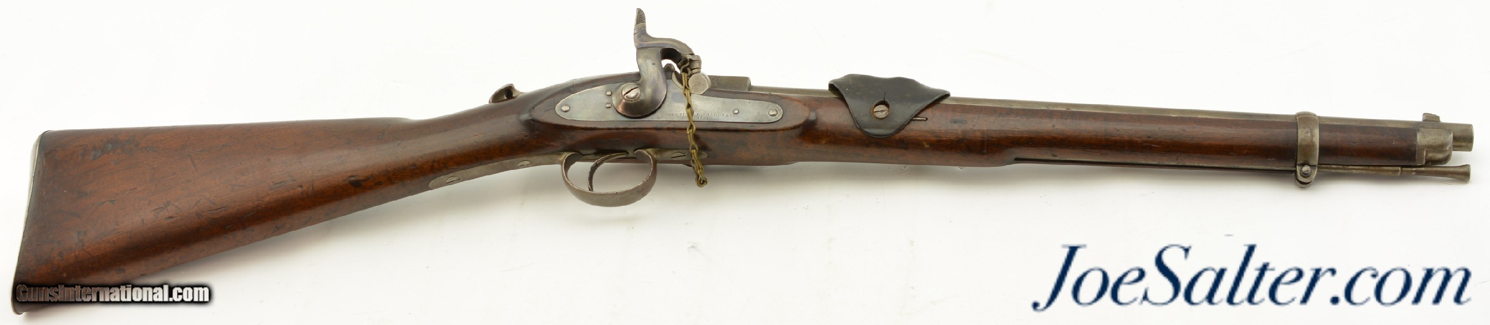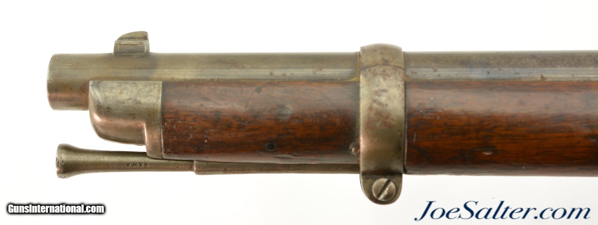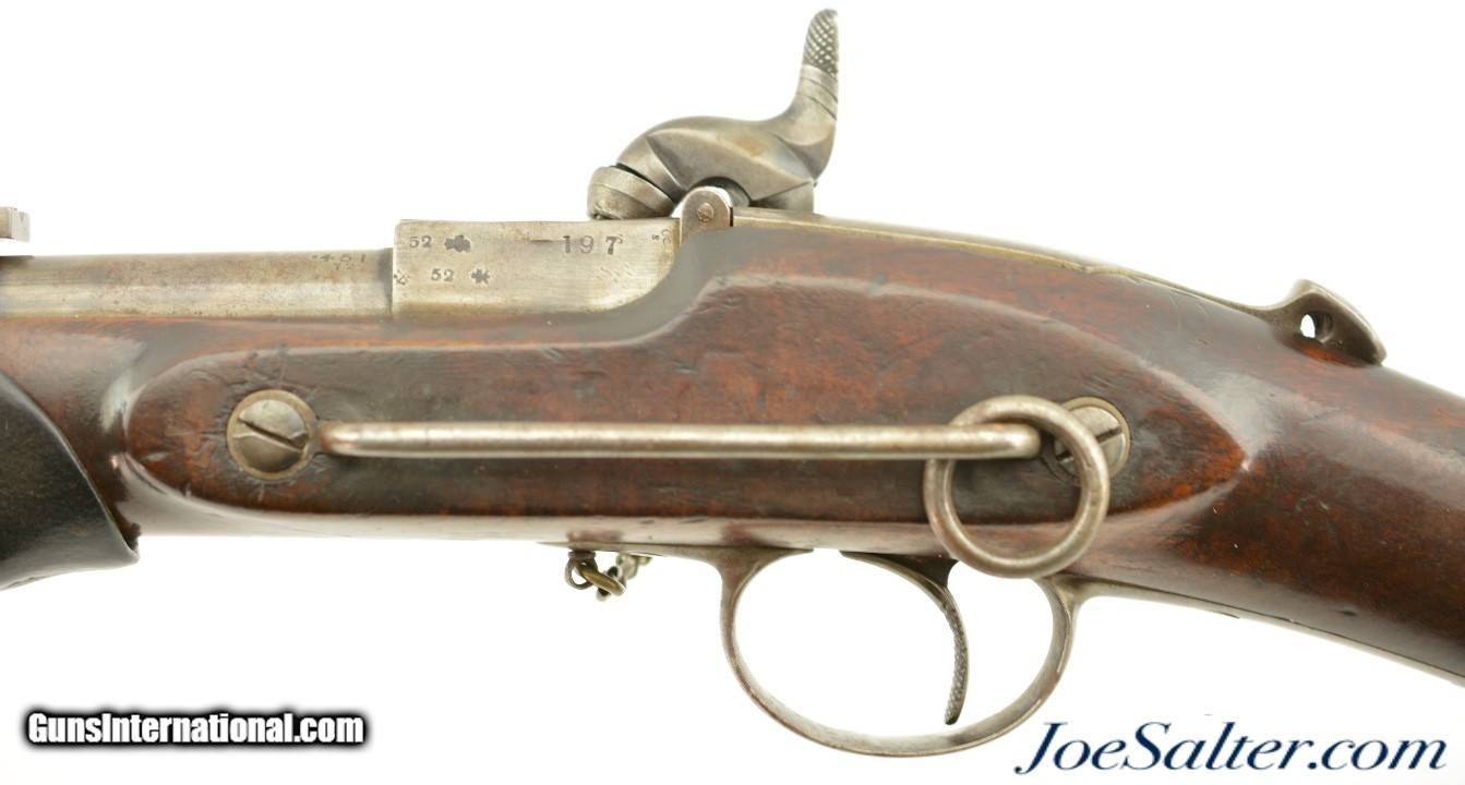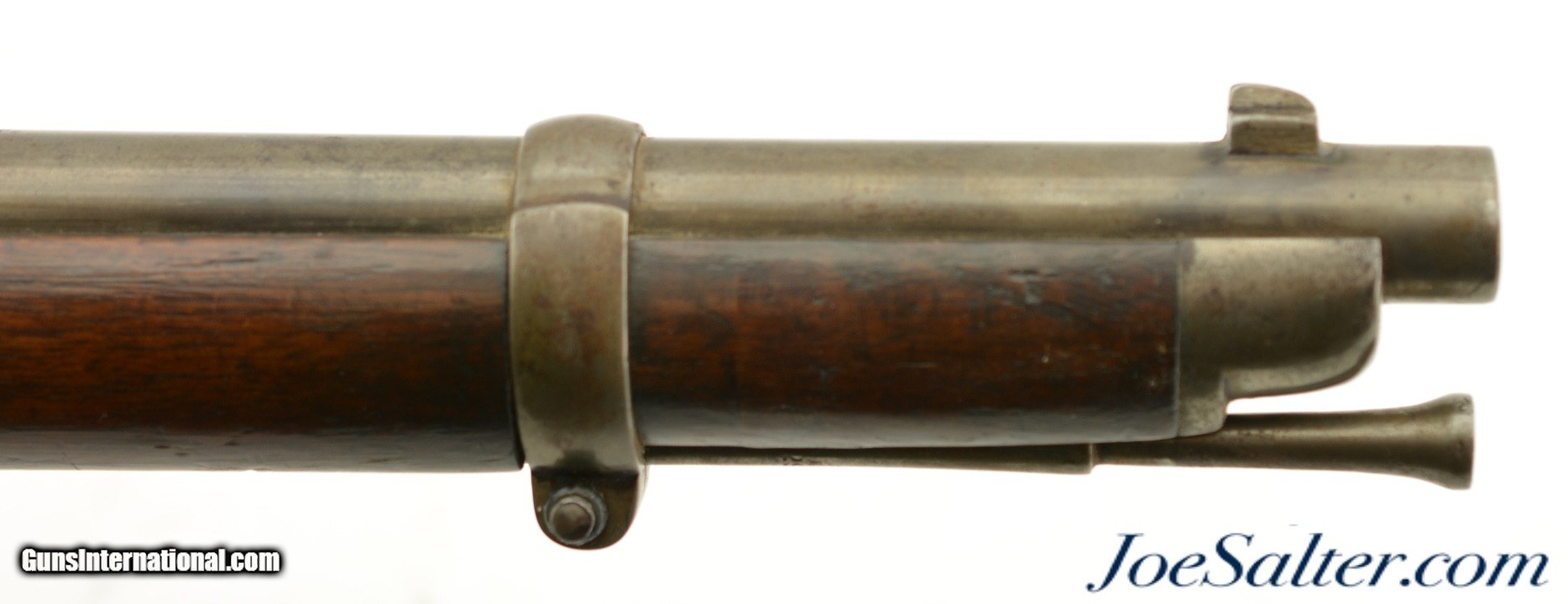 Description: Serial #197, .451 Caliber, 19" barrel with a very good, bright bore that has mild freckling and light pitting within the grooves. This is an 1861-dated carbine, and one of only sixty privately purchesed to arm select troopers of the Royal Gloucestershire Hussars. The carbine has matching serial numbers on the receiver, breech lever, rear sight, and on the underside of the wrist just behind the tip of the lower tang. The barrel and receiver have a mottled gray and plum-brown patina with some pitting present on and around the nipple bolster at the breech. The breech lever has a slightly grayer tone, as does the hammer, while the "WESTLEY RICHARDS & Co. / 1861" marked lockplate has a smooth bluish-gray patina with added blue visible along its length. The walnut stock has a thick added oil finish over numerous small handling marks and minor blemishes scattered throughout, but there are no noticeable cracks or chips in the wood. The brass trigger guard and buttplate have developed a dark ochre patina over time, with a clear unit issue marking on the buttplate tang: "RGH.44" (Royal Gloucester Hussars, carbine number 44). The carbine comes equipped with the original steel ramrod, leather sight cover, and chained nipple protector. In 1861, Charles Somerset, 8th Duke of Beaufort, purchased 60 Monkey Tail carbines at his own expense to equip the best marksmen in the regiment, who were to act as outriders and skirmishers, with a quick loading, capping breechloader capable of rapid fire. The carbines were issued at the rate of 12 per squadron, until 1871, when Monkey Tails were adopted for the entire regiment. This is a truly rare piece of Victorian British military history, and is in very good-near fine condition overall. Antique; Antique: Yes Price: $3,795.00 Contact Seller |