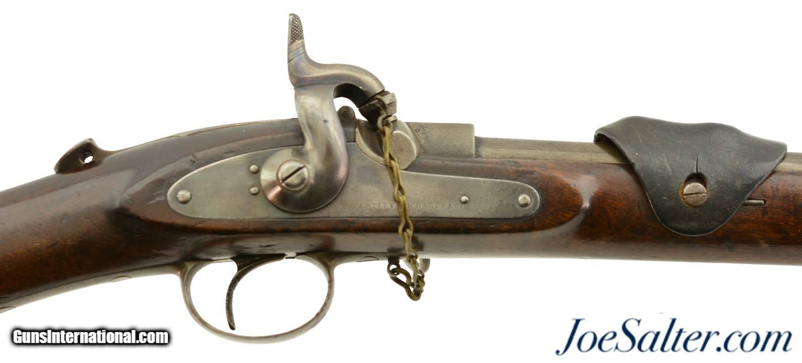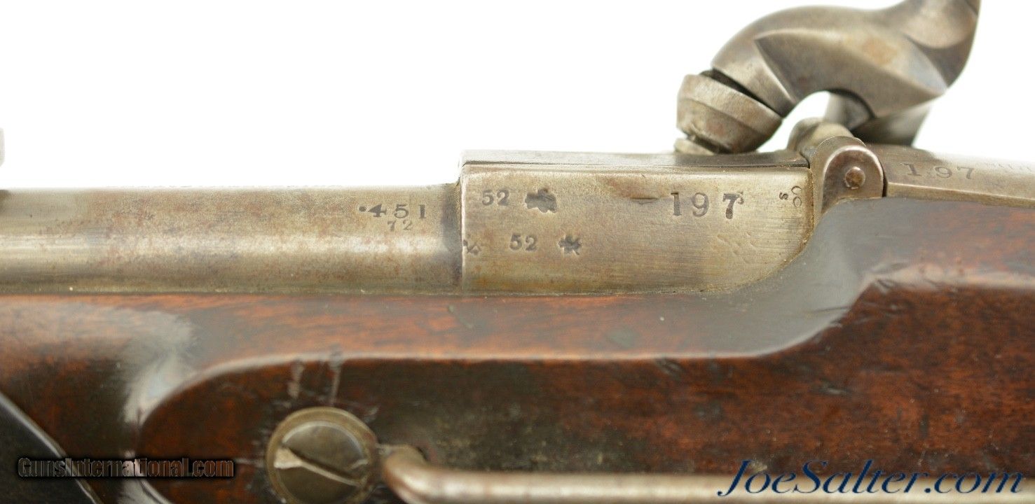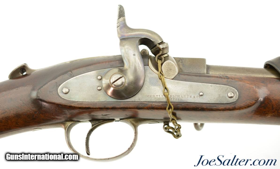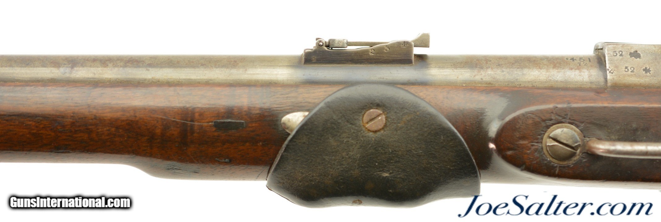 Description: Serial #197, .451 Caliber, 19" barrel with a very good, bright bore that has mild freckling and light pitting within the grooves. This is an 1861-dated carbine, and one of only sixty privately purchesed to arm select troopers of the Royal Gloucestershire Hussars. The carbine has matching serial numbers on the receiver, breech lever, rear sight, and on the underside of the wrist just behind the tip of the lower tang. The barrel and receiver have a mottled gray and plum-brown patina with some pitting present on and around the nipple bolster at the breech. The breech lever has a slightly grayer tone, as does the hammer, while the "WESTLEY RICHARDS & Co. / 1861" marked lockplate has a smooth bluish-gray patina with added blue visible along its length. The walnut stock has a thick added oil finish over numerous small handling marks and minor blemishes scattered throughout, but there are no noticeable cracks or chips in the wood. The brass trigger guard and buttplate have developed a dark ochre patina over time, with a clear unit issue marking on the buttplate tang: "RGH.44" (Royal Gloucester Hussars, carbine number 44). The carbine comes equipped with the original steel ramrod, leather sight cover, and chained nipple protector. In 1861, Charles Somerset, 8th Duke of Beaufort, purchased 60 Monkey Tail carbines at his own expense to equip the best marksmen in the regiment, who were to act as outriders and skirmishers, with a quick loading, capping breechloader capable of rapid fire. The carbines were issued at the rate of 12 per squadron, until 1871, when Monkey Tails were adopted for the entire regiment. This is a truly rare piece of Victorian British military history, and is in very good-near fine condition overall. Antique; Antique: Yes Price: $3,795.00 Contact Seller |