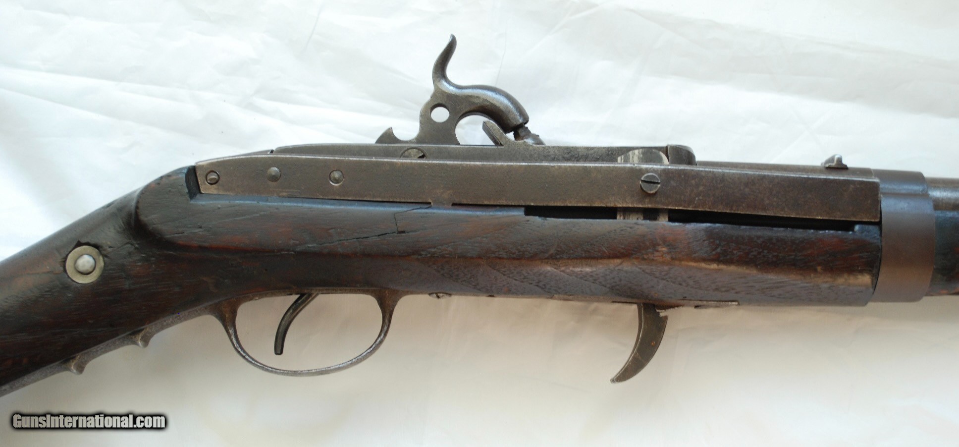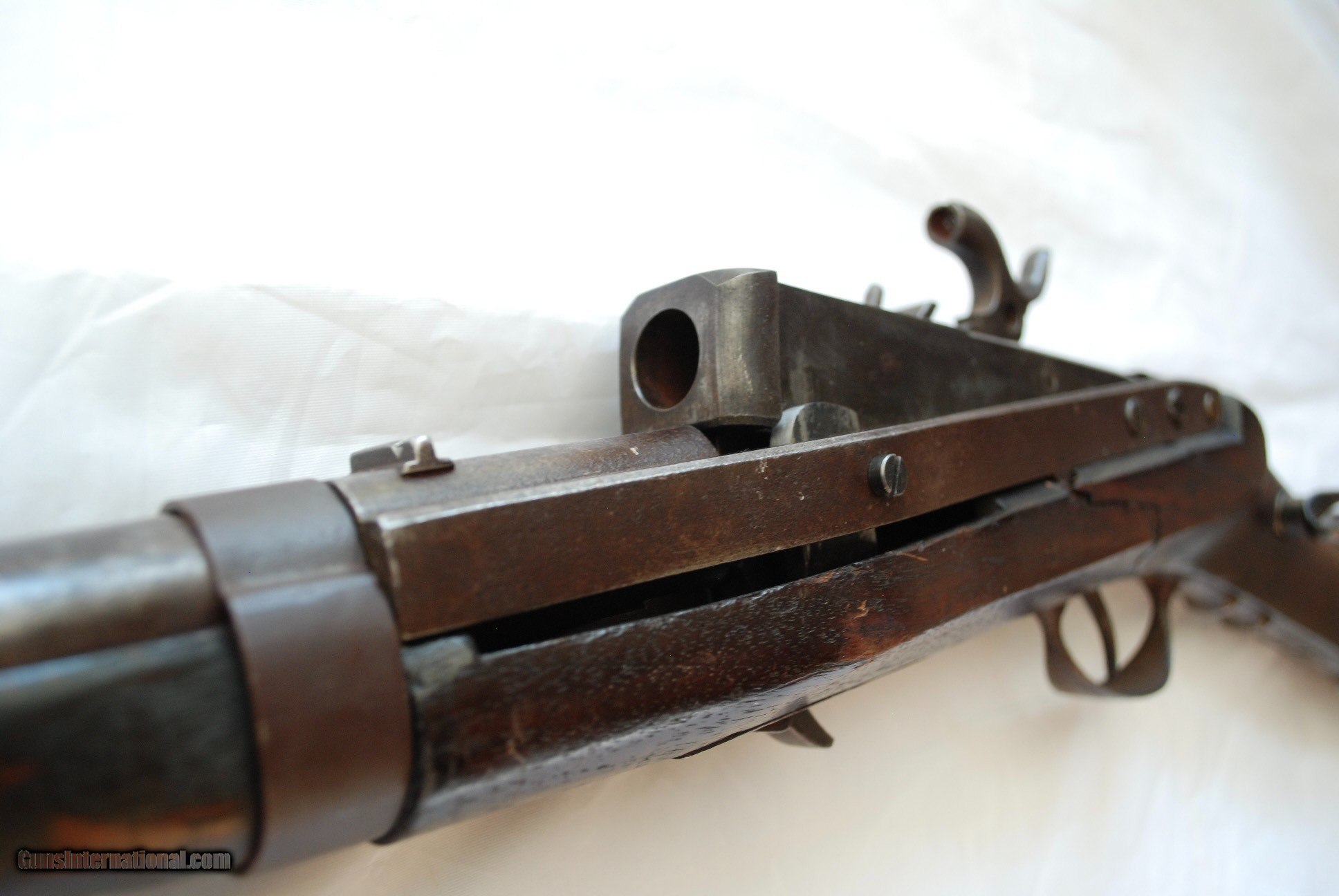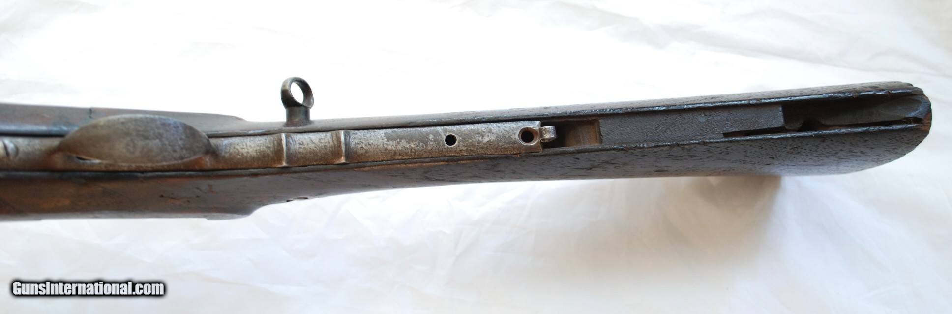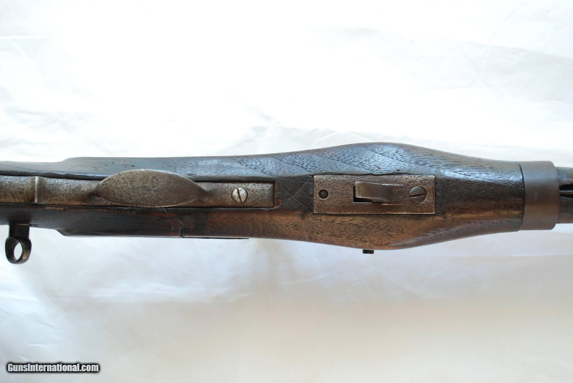 Description: This revolutionary gun was the first American breech loading rifle adopted for military service, also the first one to have interchangeable parts. As scarce as the rifles are, the carbines are scarcer, especially the ones that feature an integral bayonet. Hall rifles were used during Mexican American war, Indian wars and to a smaller extend in Civil war. The gun for sale is in good everall condition, stock has a usual crack on the left side of the receiver, Action works fine with a two stage hammer. Rear barrel band is loose. The gun is missing a butt plate and a patchbox cover that was integral with trigger guard but the price refletcs that. No license needed to buy xcept NJ residents. Thanks, check my other listings. SOLD Antique: Yes |