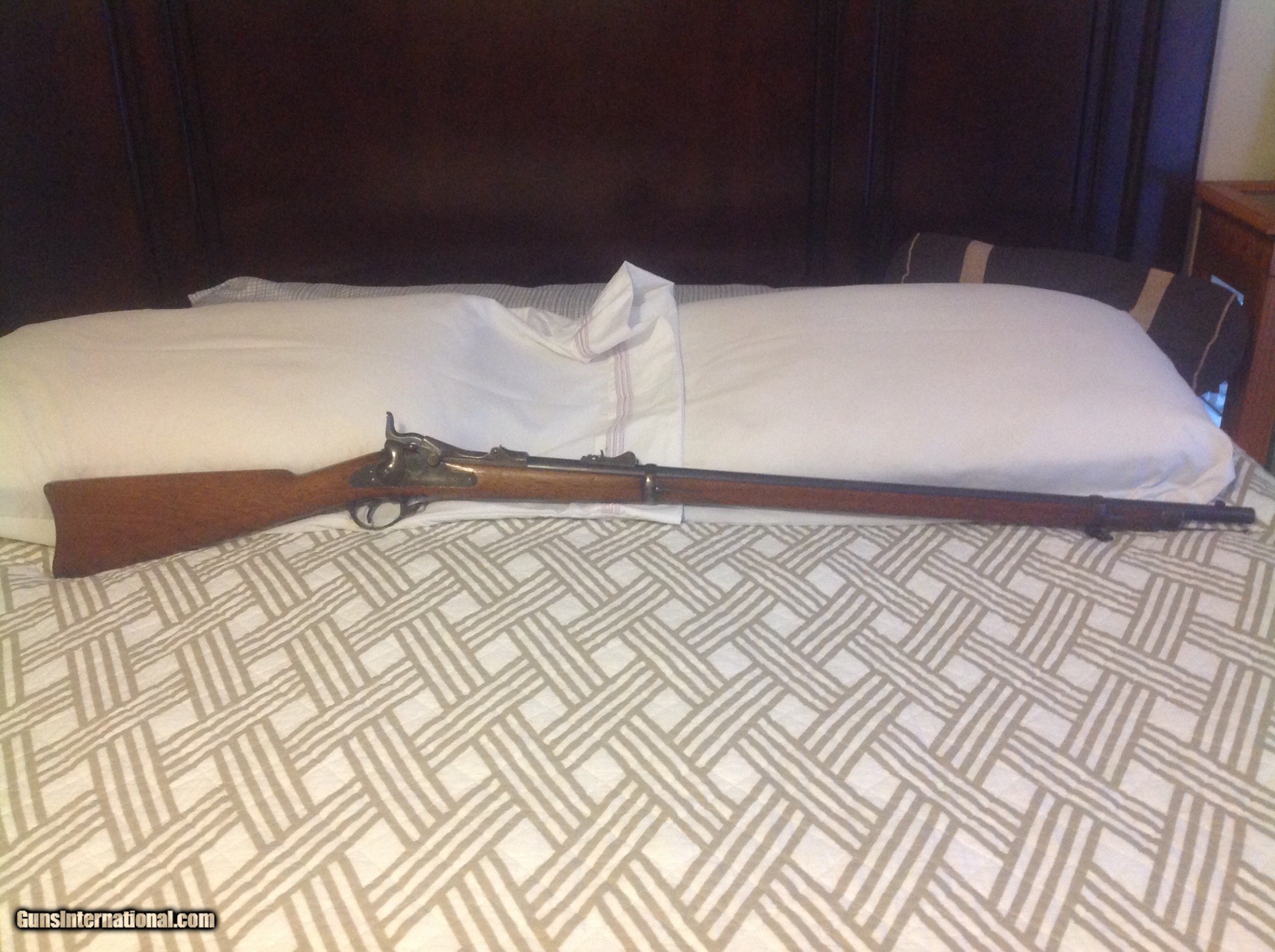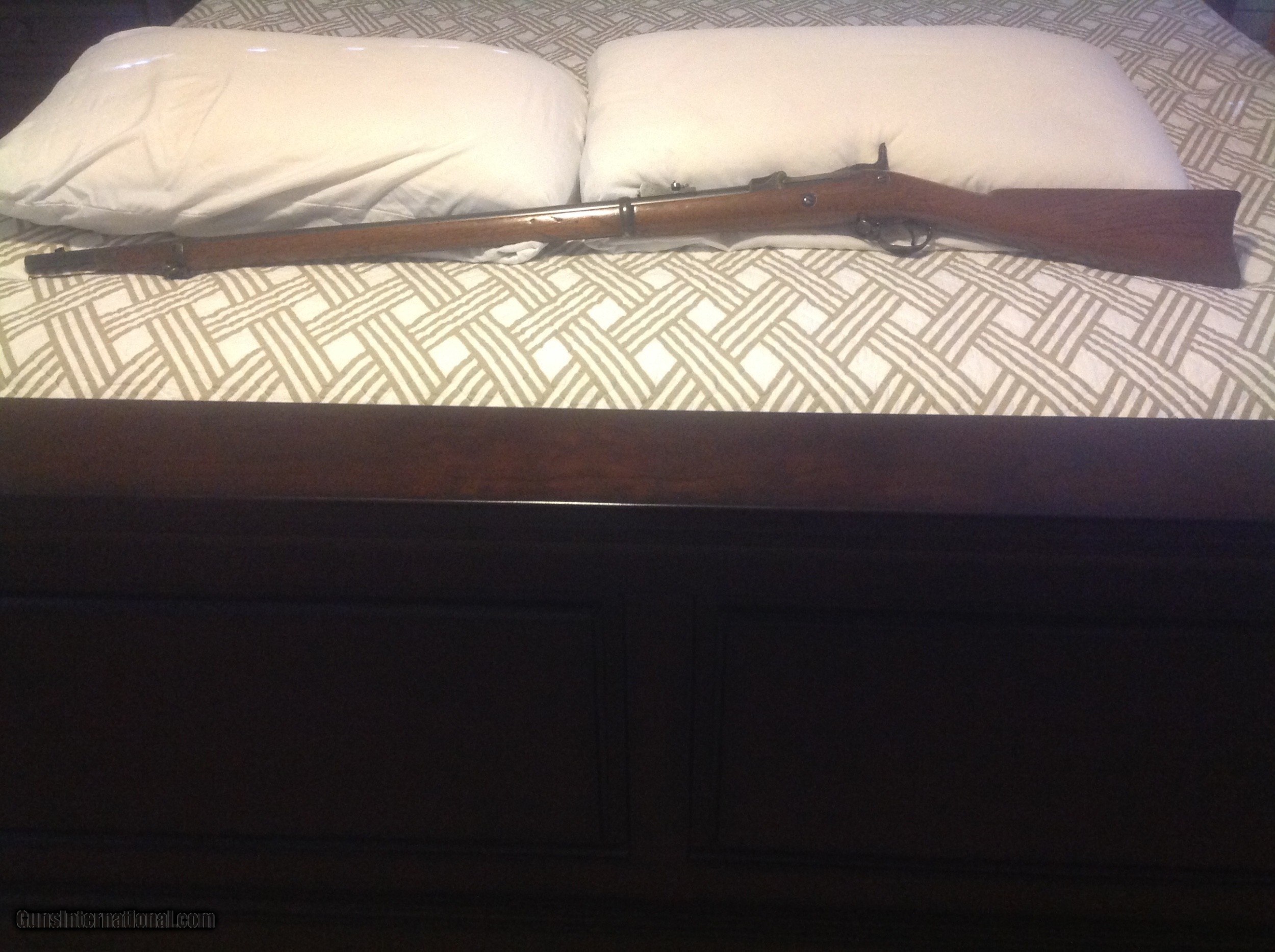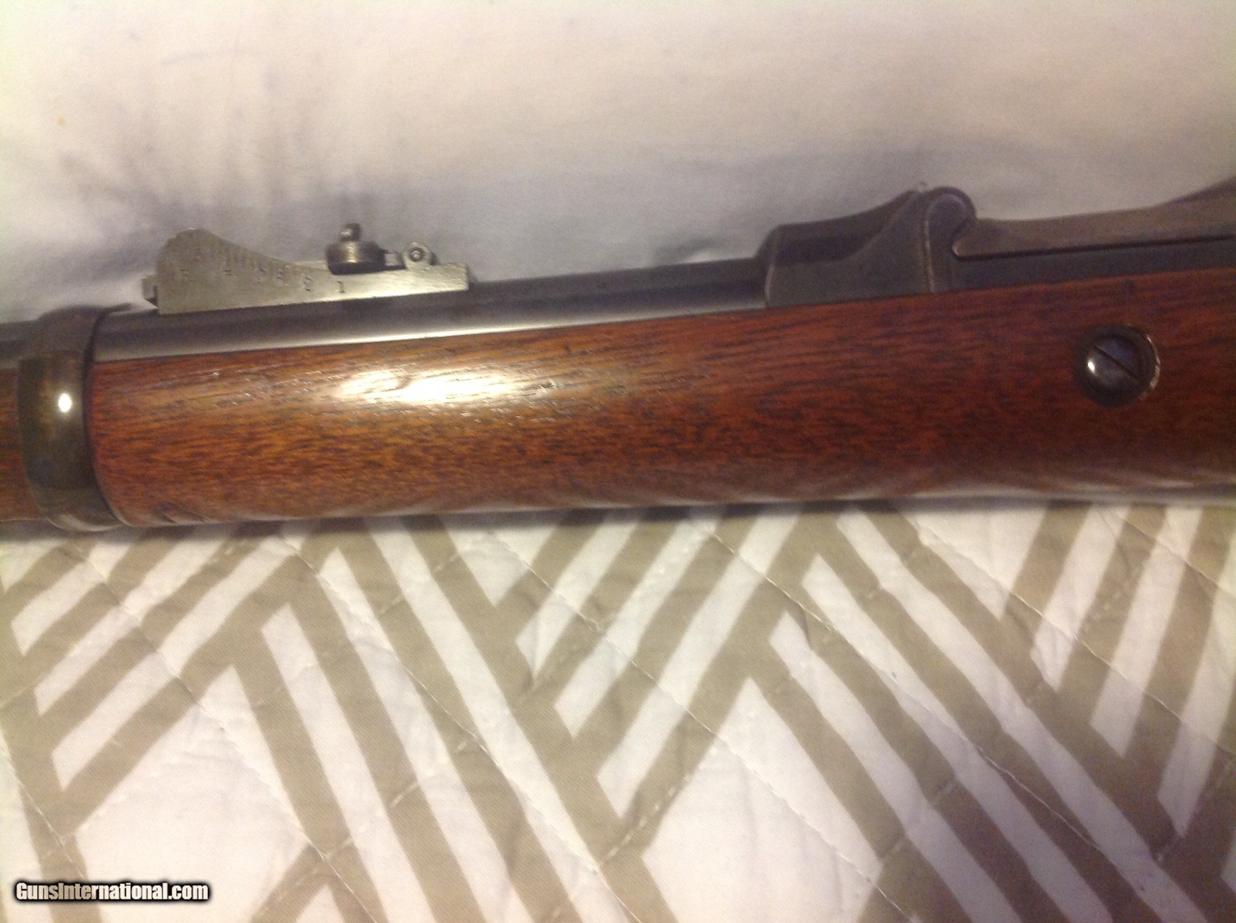 Description: Springfield Model 1878 Trapdoor 45/70 with triangular bayonet with scabbard.This rifle retains 95% of the original bluing. Super good bore,all wood in great shape. The inspectors cartouche is clear and readable. There is also an issue stamp on the stock for the Detroit Armory. This rifle is in excellent condition. SOLD Antique: Yes |