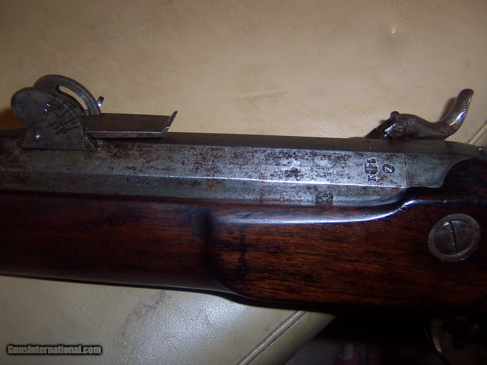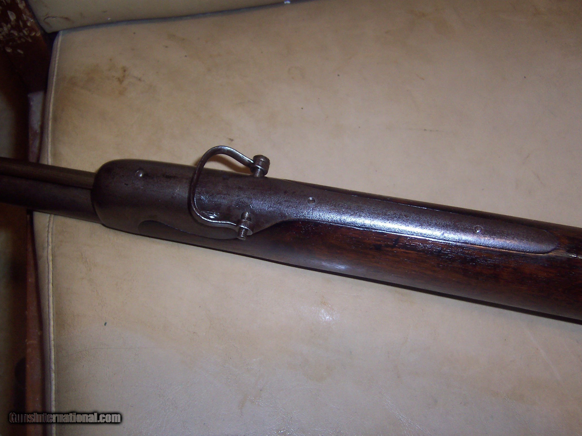 Description: 35 inch barrel with micro groved rifled bore //60 caliber // bore could be cleaned to vg shootable condition // / has bayonet lug with spring catch/ gun in gray metal condition / minor pitting by bayont lug /// set trigger works // nice solid stock / belgium proof marks normal for many swiss weapons / circa 1840s// may weigh 13 pounds $65 sh SOLD Antique: Yes Manufacturer: swiss Model: target Condition: vg Metal Condition: vg Wood Condition: vg Bore Condition: vg |