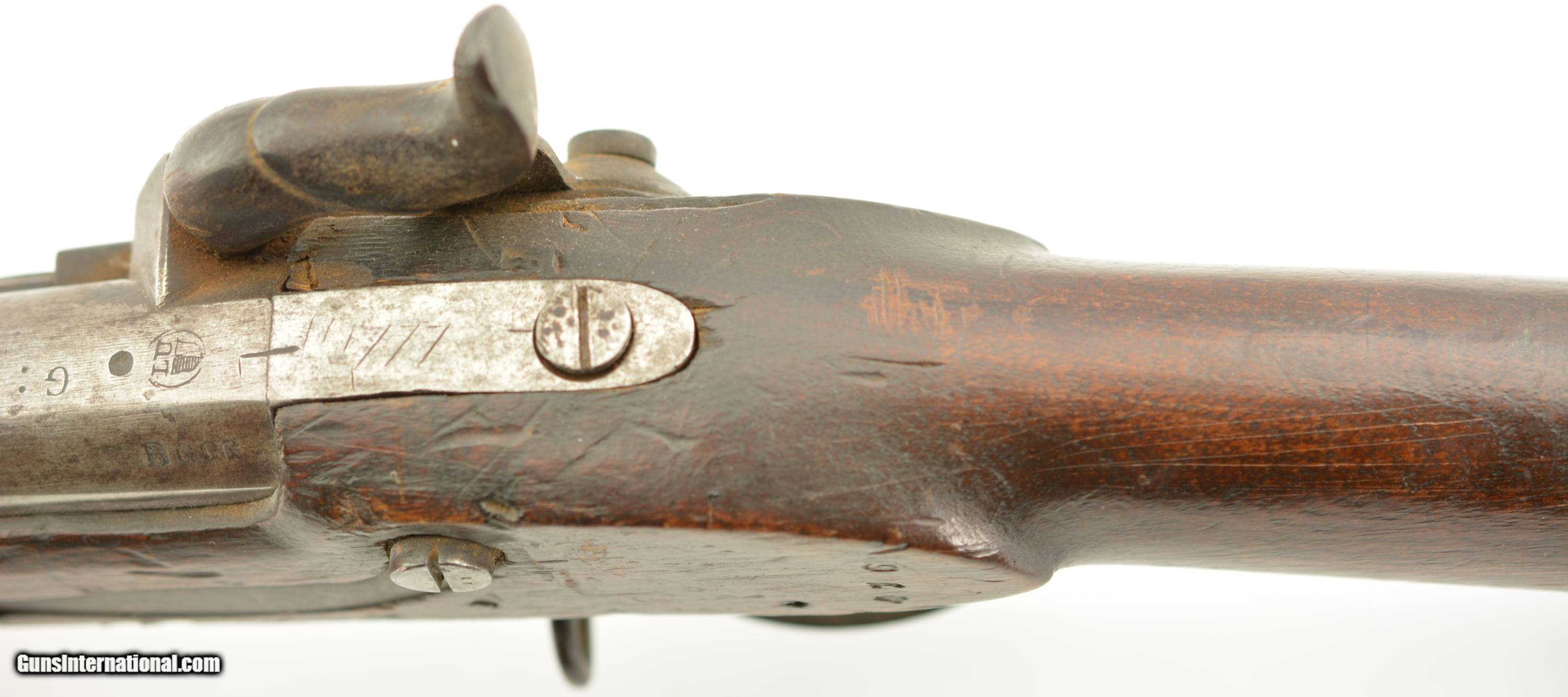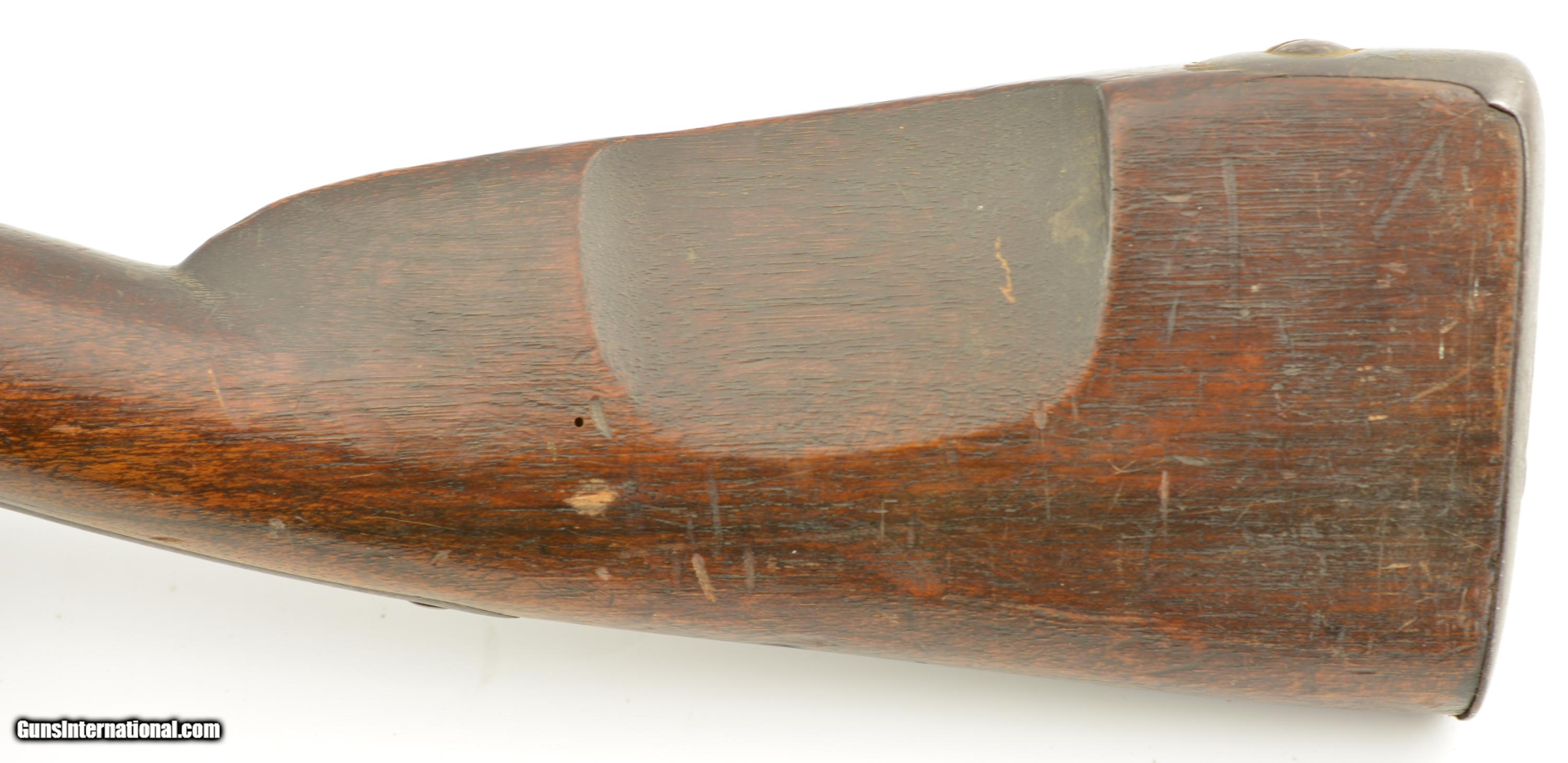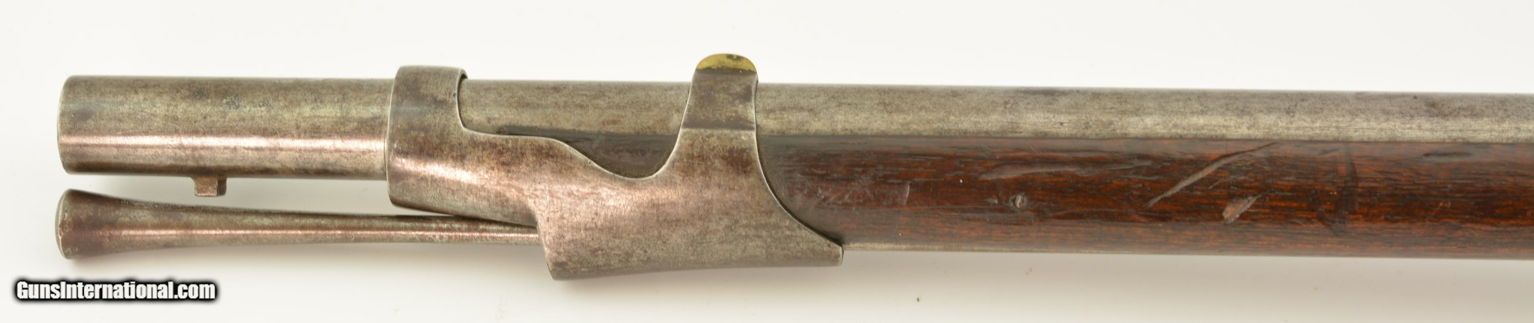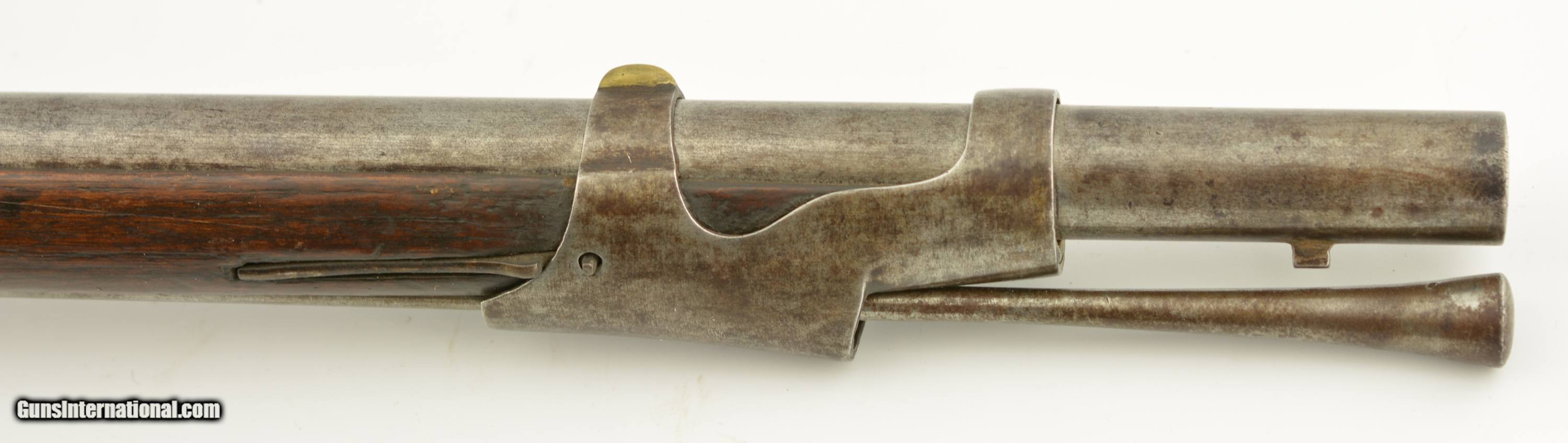 Description: Serial #490, .69 Caliber, 40 1/4" barrel with a fair bore that has dark freckling along its length. This was originally a Model 1817 flintlock musket and was converted to percussion in order to conform with the 1840 specifications. The metal has an overall mottled gray and plum-brown patina, as well as an overall dark brown patina on the hammer and unmarked lockplate. Additionally, there are scattered spots of mild surface oxidation on the hammer. The walnut stock is in about good shape with numerous handling marks and small surface blemishes scattered about the added varnish finish, and a small number stamped into the wood just above the trigger on the left side. The musket comes with a correct, trumpet-head ramrod, and the action is tight and fully functional. This is a good-near very good example of a seldom seen Swiss musket. Antique SOLD Antique: Yes Manufacturer: Swiss Model: Musket Serial Number: 490 Caliber Info: .69 Gauge Info: .69 |