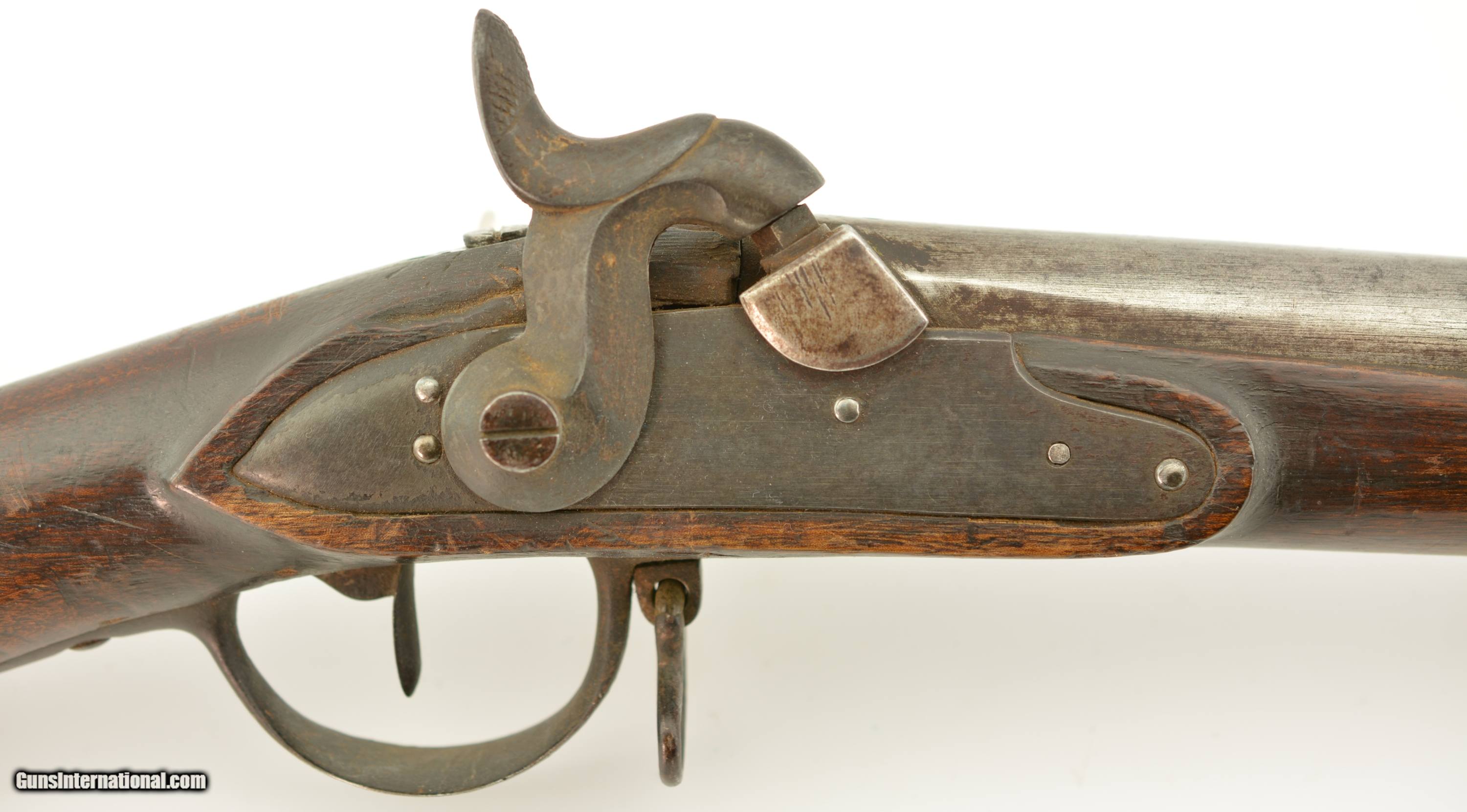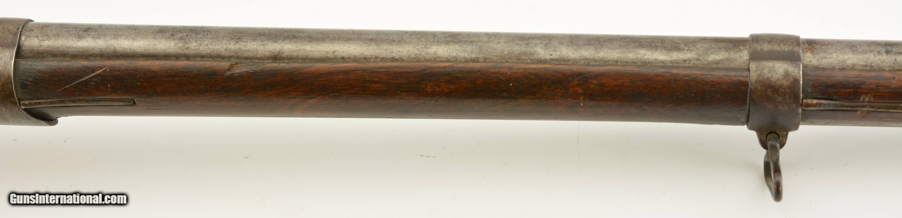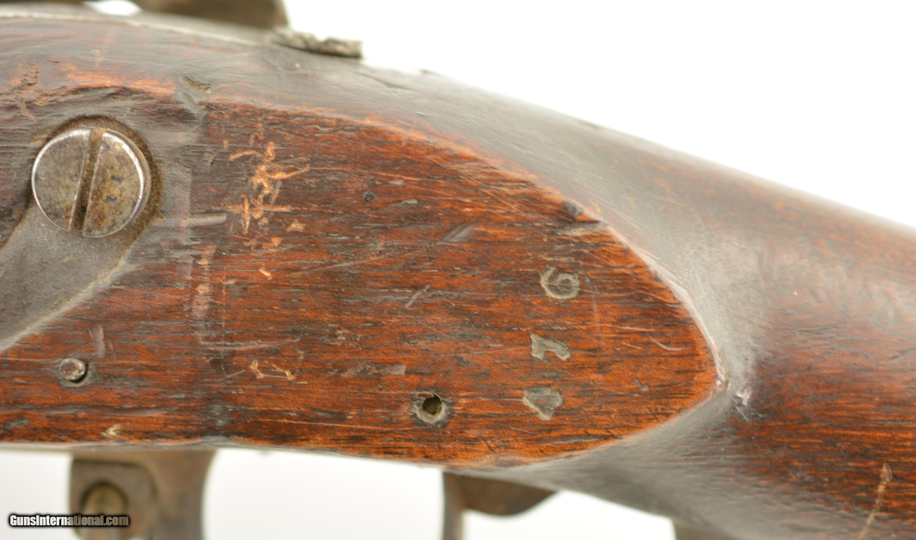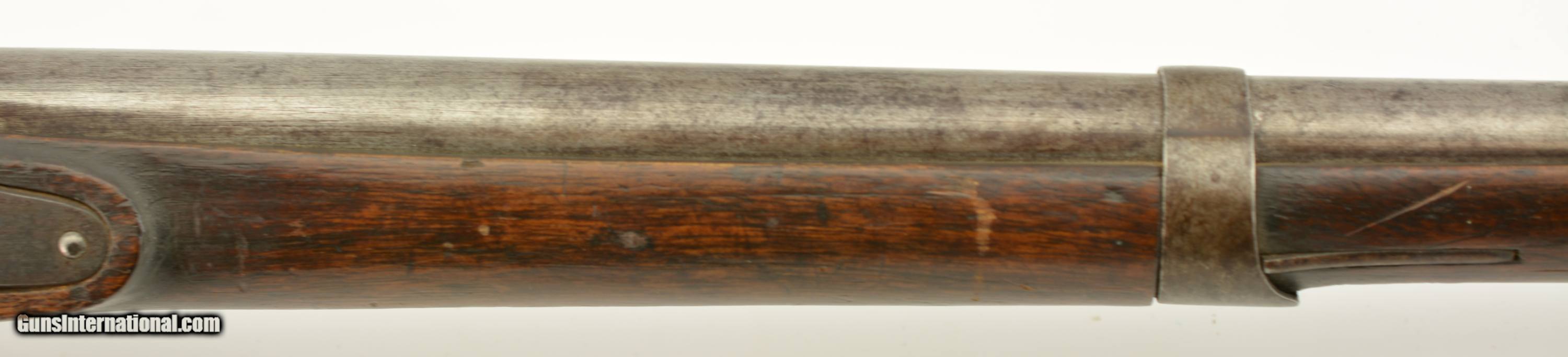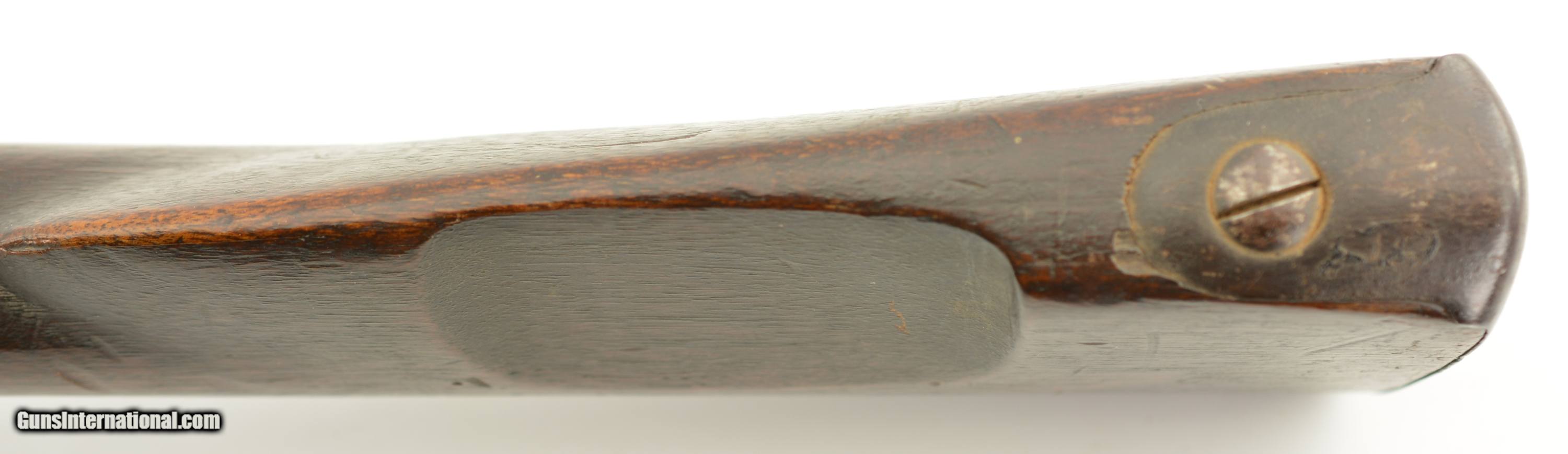 Description: Serial #490, .69 Caliber, 40 1/4" barrel with a fair bore that has dark freckling along its length. This was originally a Model 1817 flintlock musket and was converted to percussion in order to conform with the 1840 specifications. The metal has an overall mottled gray and plum-brown patina, as well as an overall dark brown patina on the hammer and unmarked lockplate. Additionally, there are scattered spots of mild surface oxidation on the hammer. The walnut stock is in about good shape with numerous handling marks and small surface blemishes scattered about the added varnish finish, and a small number stamped into the wood just above the trigger on the left side. The musket comes with a correct, trumpet-head ramrod, and the action is tight and fully functional. This is a good-near very good example of a seldom seen Swiss musket. Antique SOLD Antique: Yes Manufacturer: Swiss Model: Musket Serial Number: 490 Caliber Info: .69 Gauge Info: .69 |