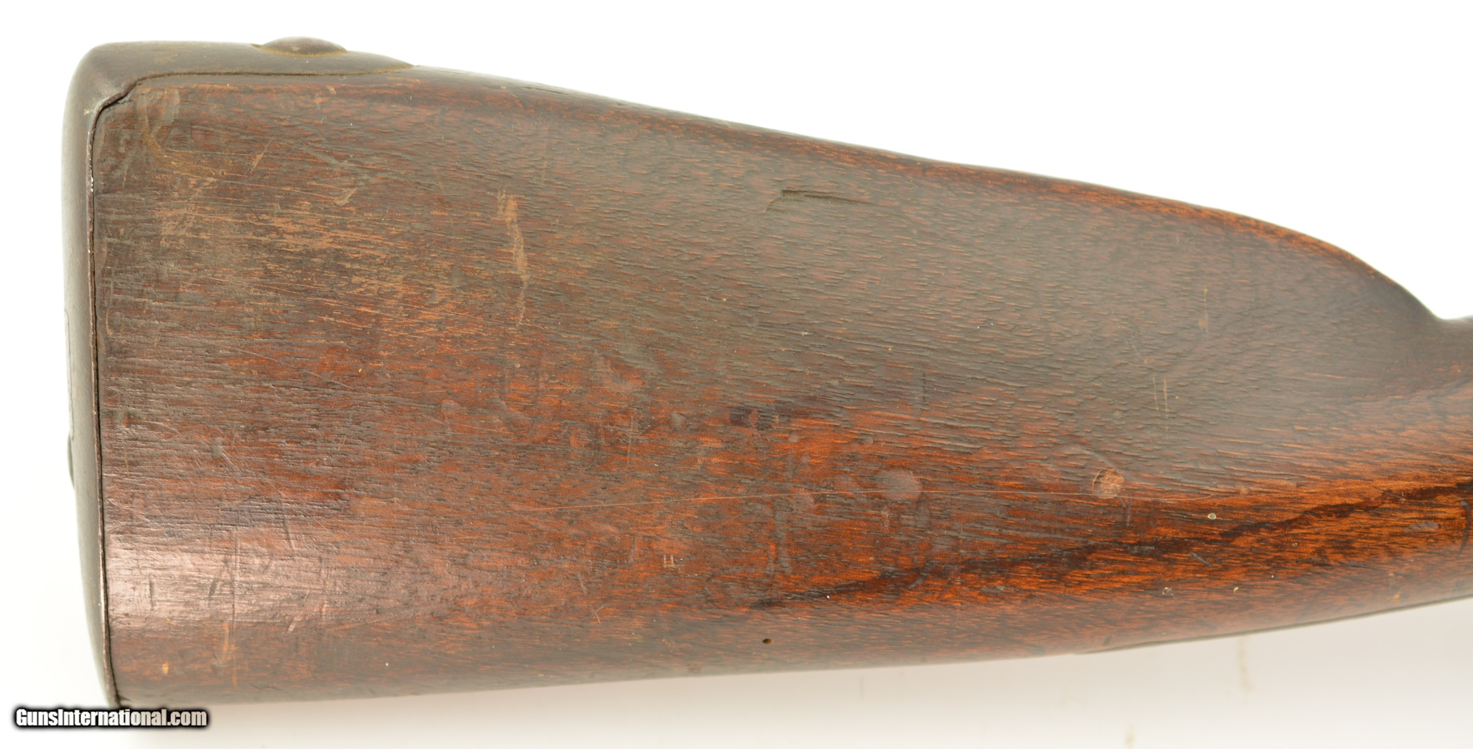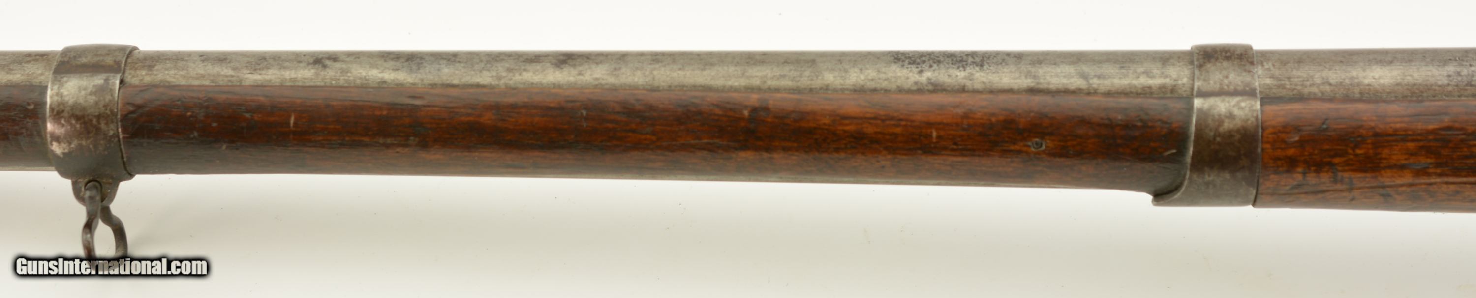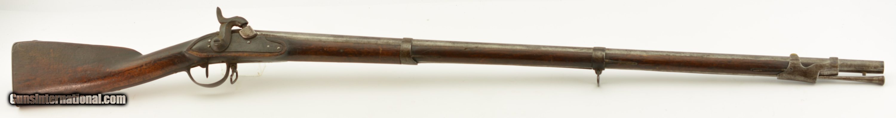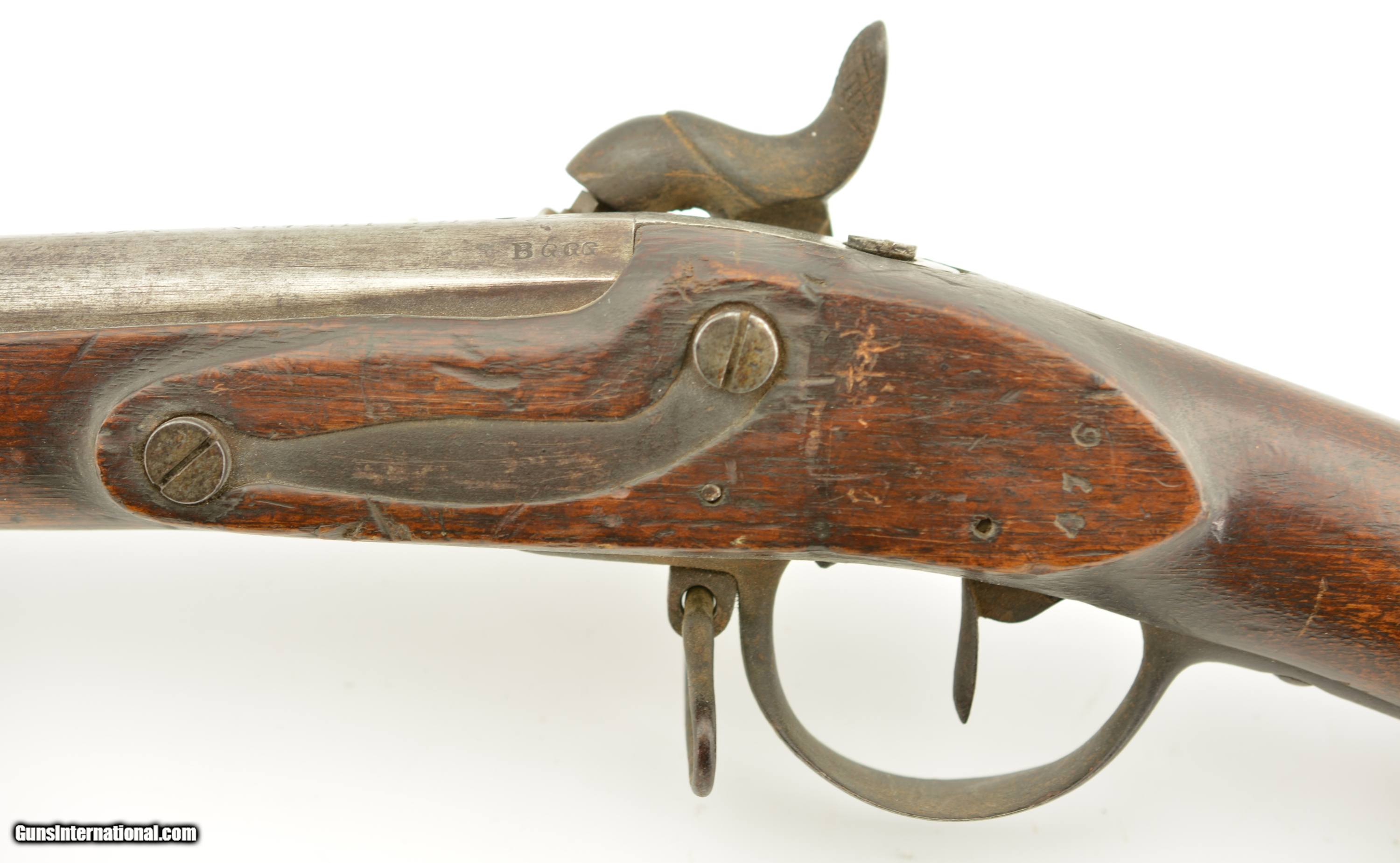 Description: Serial #490, .69 Caliber, 40 1/4" barrel with a fair bore that has dark freckling along its length. This was originally a Model 1817 flintlock musket and was converted to percussion in order to conform with the 1840 specifications. The metal has an overall mottled gray and plum-brown patina, as well as an overall dark brown patina on the hammer and unmarked lockplate. Additionally, there are scattered spots of mild surface oxidation on the hammer. The walnut stock is in about good shape with numerous handling marks and small surface blemishes scattered about the added varnish finish, and a small number stamped into the wood just above the trigger on the left side. The musket comes with a correct, trumpet-head ramrod, and the action is tight and fully functional. This is a good-near very good example of a seldom seen Swiss musket. Antique SOLD Antique: Yes Manufacturer: Swiss Model: Musket Serial Number: 490 Caliber Info: .69 Gauge Info: .69 |