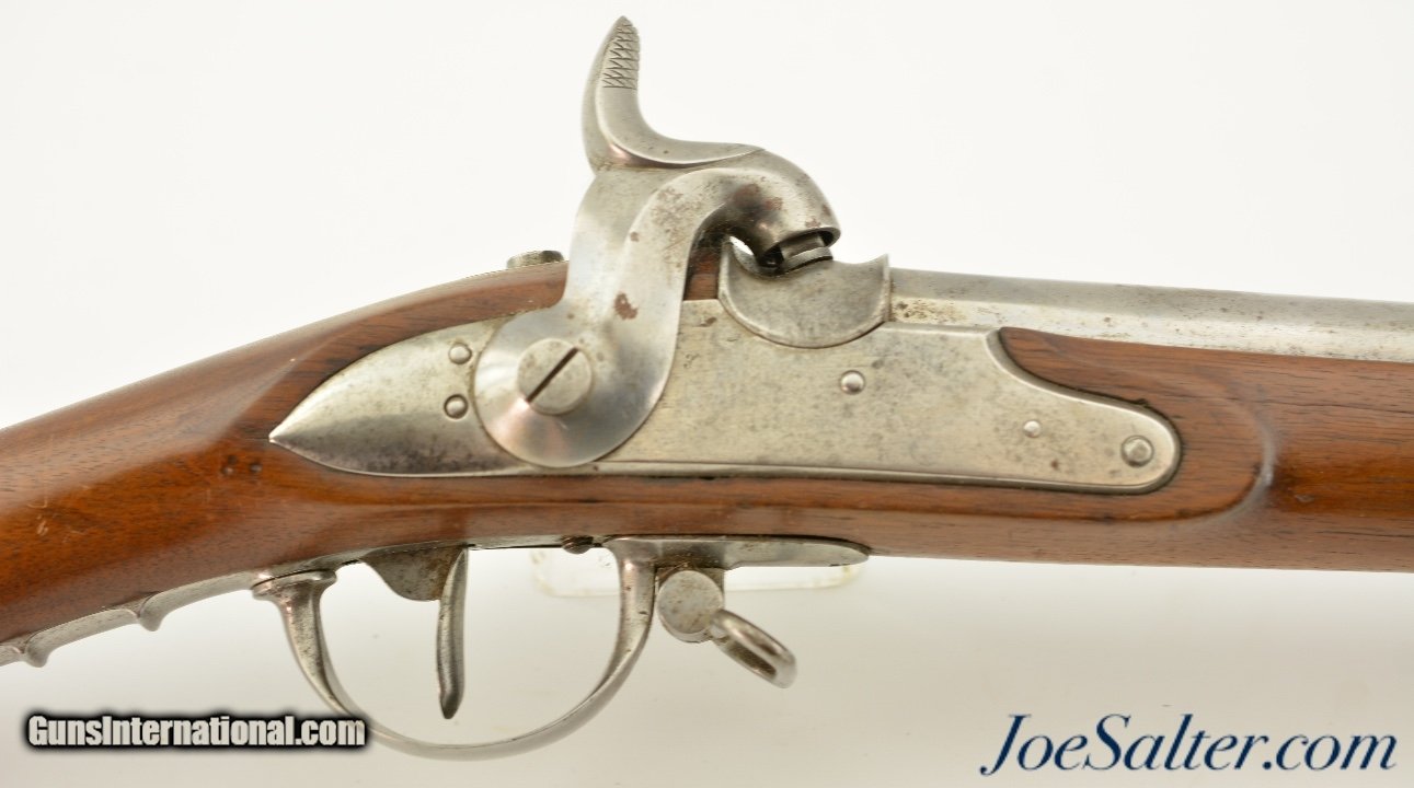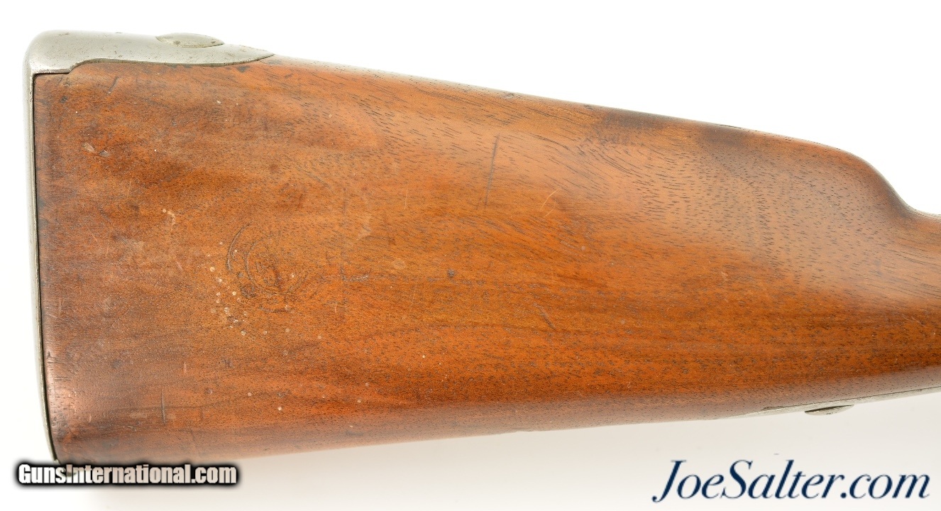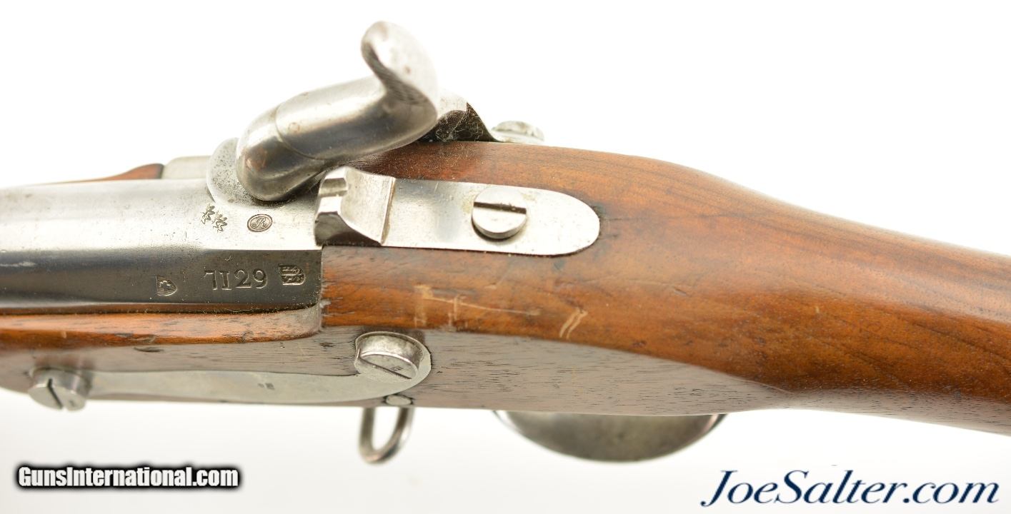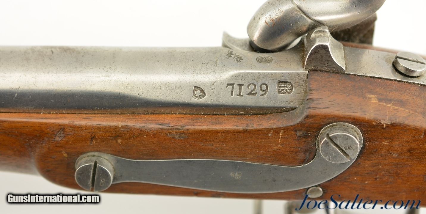 Description: Serial #7129, .69 Caliber, 42 1/2" barrel with a good, lightly pitted bore. This was originally a Model 1817 flintlock musket and was converted to percussion in order to conform with the 1842 specs. The metal has an overall armory bright finish, with spots of dark freckling scattered throughout, as well as some darker mottling on the unmarked lockplate. Extensive proofs are present on the breech of the barrel, including a deeply struck Geneva coat of arms. The walnut stock is in very good shape with minor handling marks in the added varnish finish, and a visible, but illegible Swiss military cartouche on the right side of the butt. The musket comes with a correct, trumpet-head ramrod, and the action is tight and fully functional. This is a fine example of a seldom seen Swiss musket. Antique SOLD Antique: Yes |