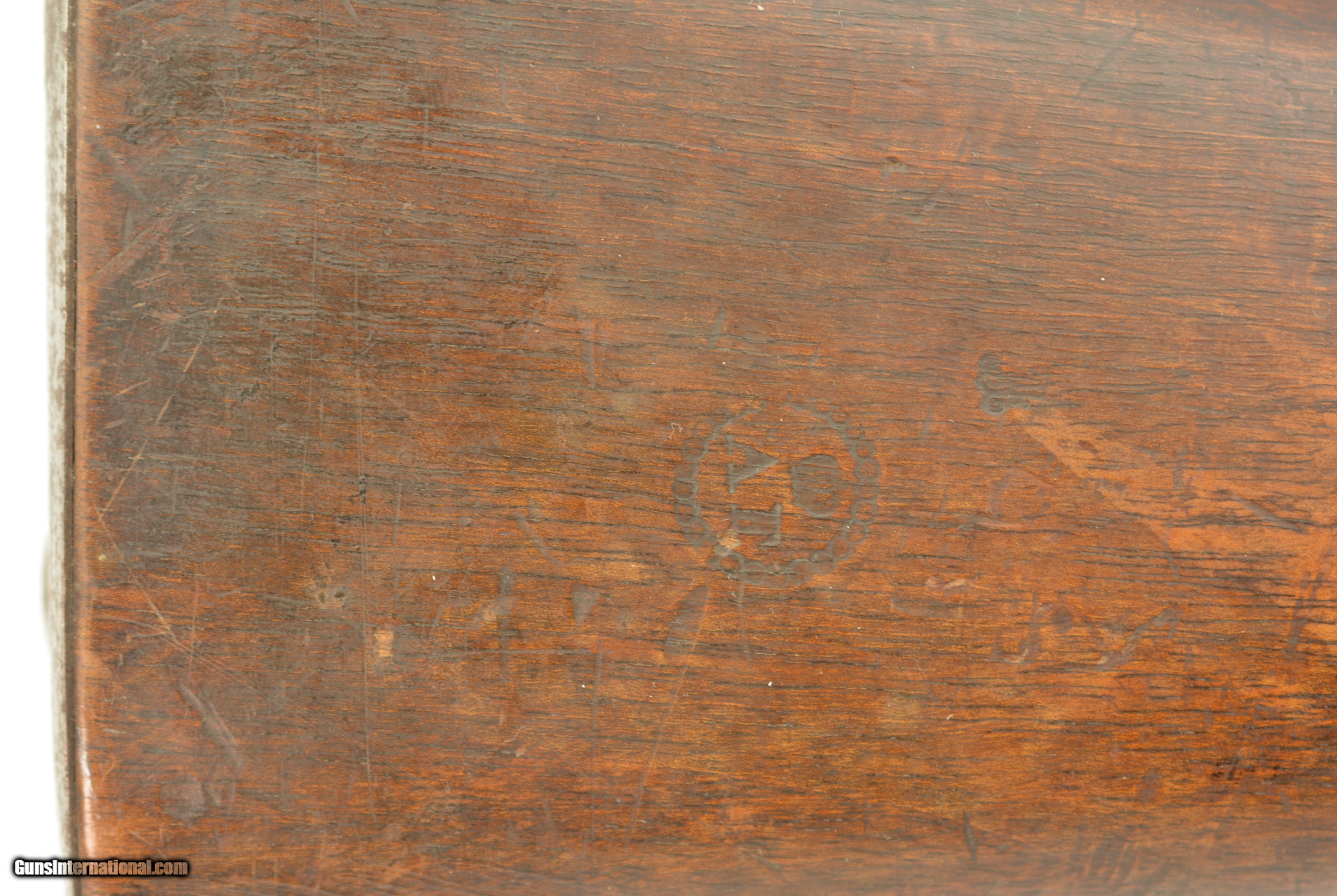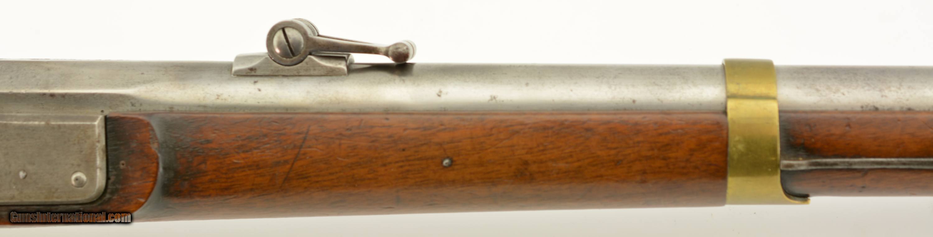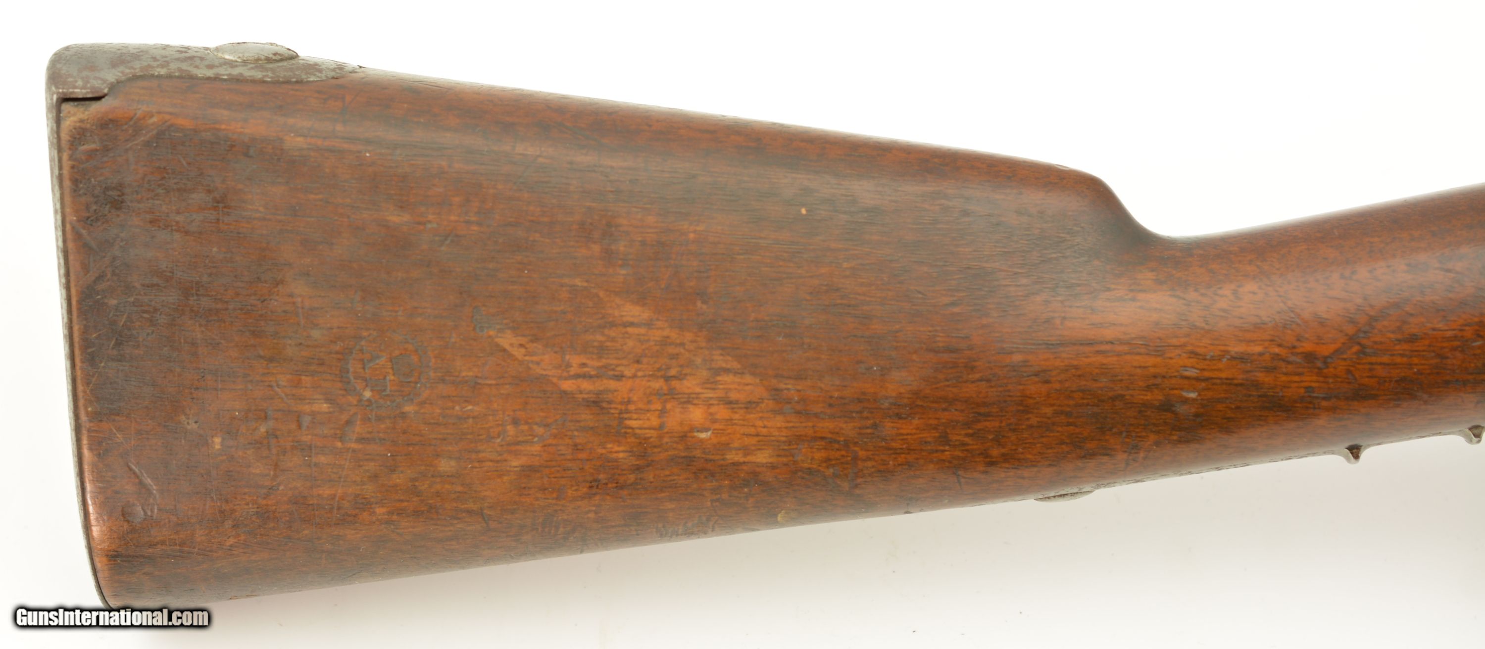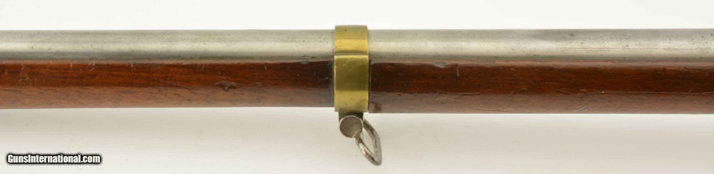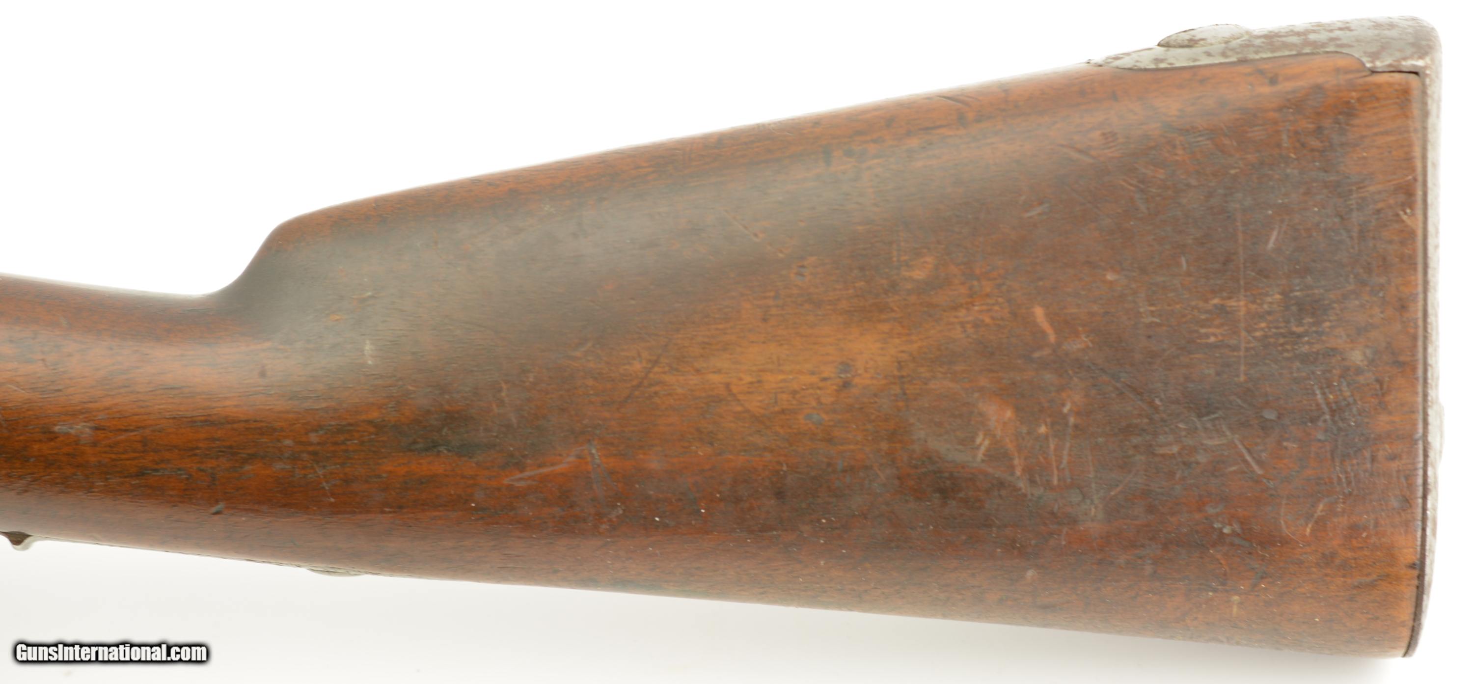 Description: Serial #1221, .70 Caliber, 36 1/4" barrel with a very good, lightly pitted bore. This is a well-made and sturdy rifle-musket that retains its original armory bright finish on the barrel, lock, and buttplate. The "A. FRANCOTTE / A / LIEGE" and Zurich marked barrel and lock, hammer, and breech iron have even, thin freckling throughout, with some dark spots of oxidation on the buttplate. All markings, including the "E / LG" proof, are crisp and sharp. The stock is in very good condition with numerous minor handling marks spread about the old, added oil finish. The Francotte "AF" cartouche is still quite crisp on the right side of the butt, and the brass bands and other furniture are in fine shape with an appealing yellow-ochre patina throughout. The action is fully functional, and an original ramrod is included. This is a rarely seen Swiss percussion military longarm, and is in very good-near fine condition. Antique SOLD Antique: Yes |