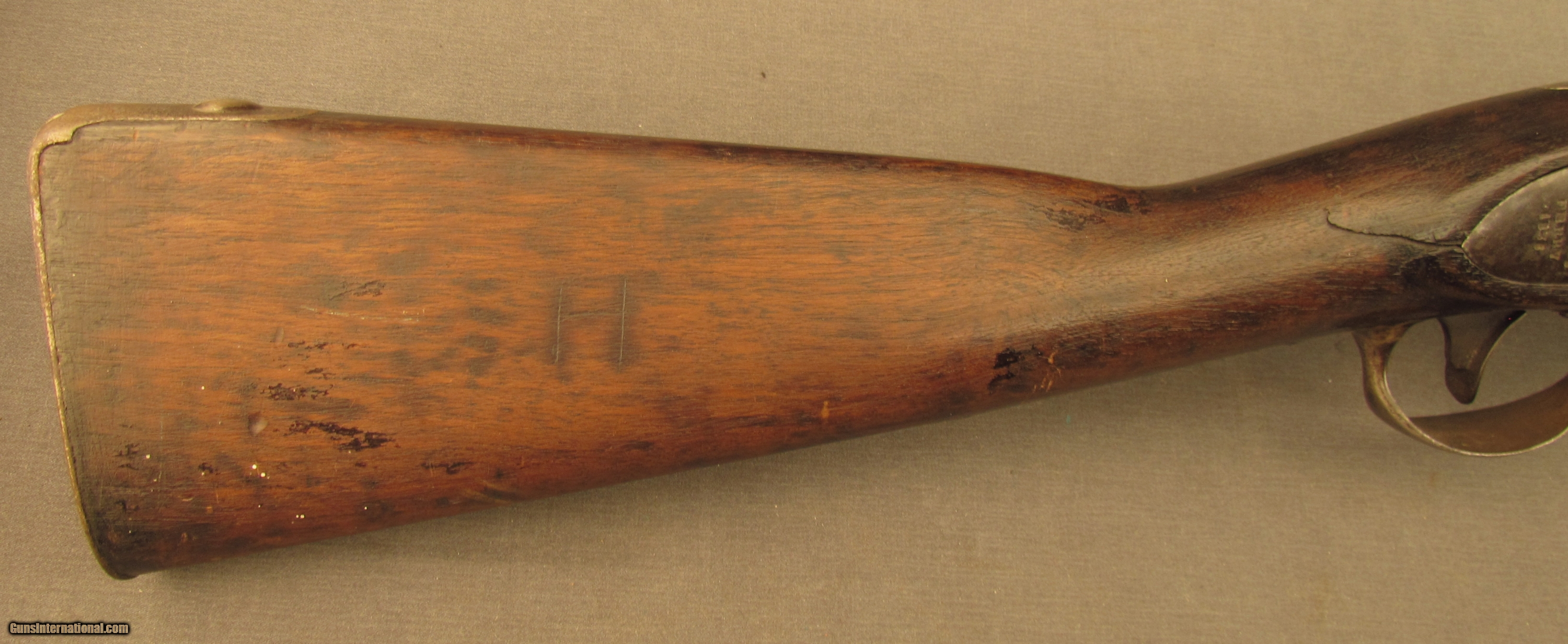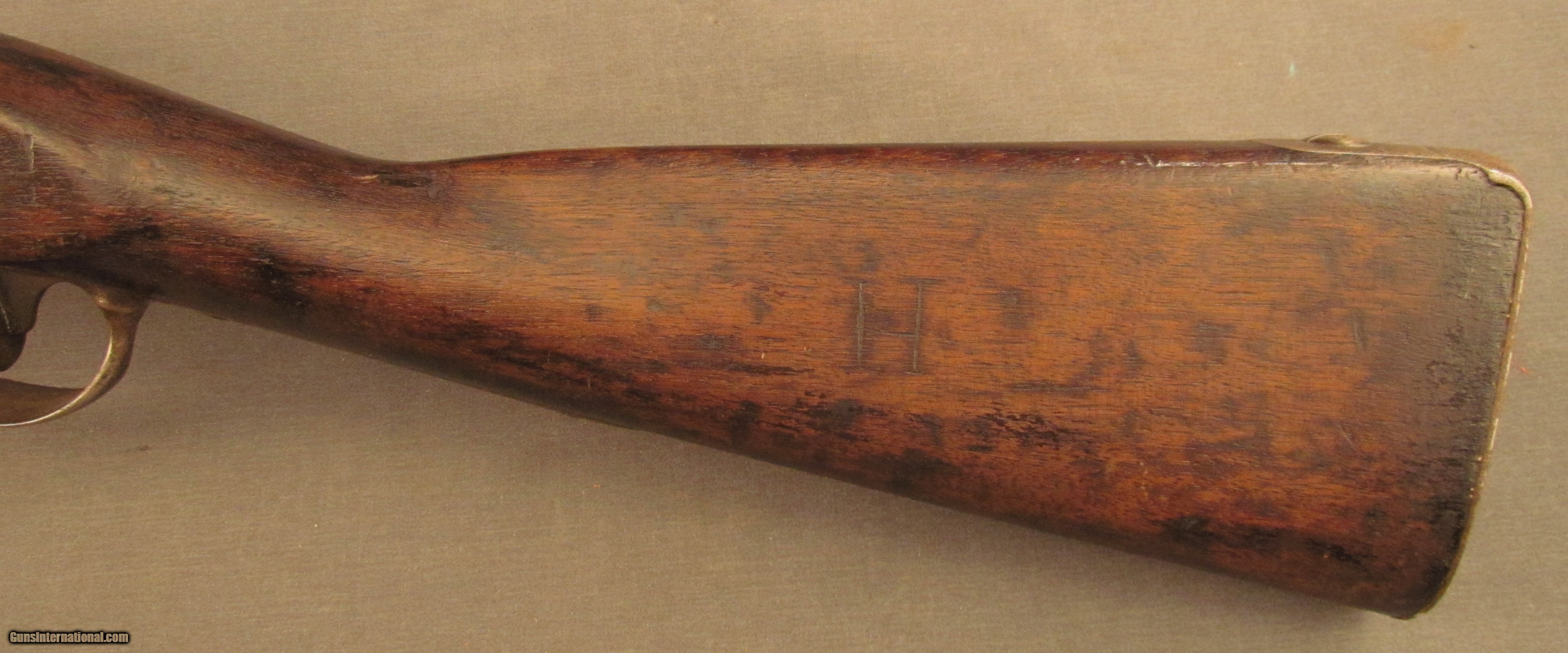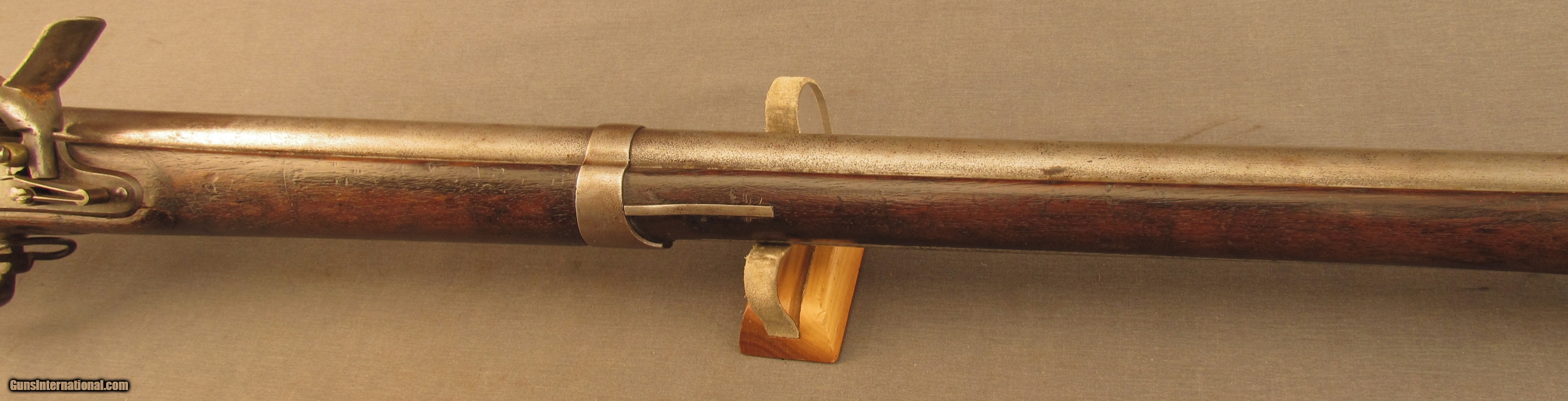 Description: Serial #102, .69 cal., 42” barrel with a fair, darkly freckled bore. This musket has been reconverted from percussion and has an 1825 dated, Springfield Manufacturing Co.-made barrel (marked “S.M.Co.” on the left breech flat below the Springfield proofmarks). The Harpers Ferry-made lock is dated 1832 while the trigger guard has the matching Springfield “102” serial number. There is light-moderate pitting throughout the darkly mottled, pewter gray metal, with even pinprick pitting that gets heaviest along the sides of the barrel where it meets the stock, and some mild oxidation on the forward surface of the frizzen. The walnut stock has a dark brown, added varnish finish with period carved identifying or unit markings on both sides of the buttstock (“H”), as well as scattered handling marks and blemishes. Additionally, there is a further lazy “E” marking on the right side of the stock just behind the sideplate that is repeated in the metal at the top of the barrel breech. The wood surrounding the lock has several small cracks and partial chips as well. A slightly too short, correct metal ramrod is included and the mechanism is tight and functional. This is a very nice looking example of a reconverted musket with an appealing antique look, and would make a great addition to any collection. {Ref. "American Military Shoulder Arms" Vol. 2 by George D. Moller; 1993} Antique SOLD Antique: Yes Manufacturer: Spfld Model: 1816 Serial Number: 102 Caliber Info: .69 Cal Gauge Info: .69 Cal |