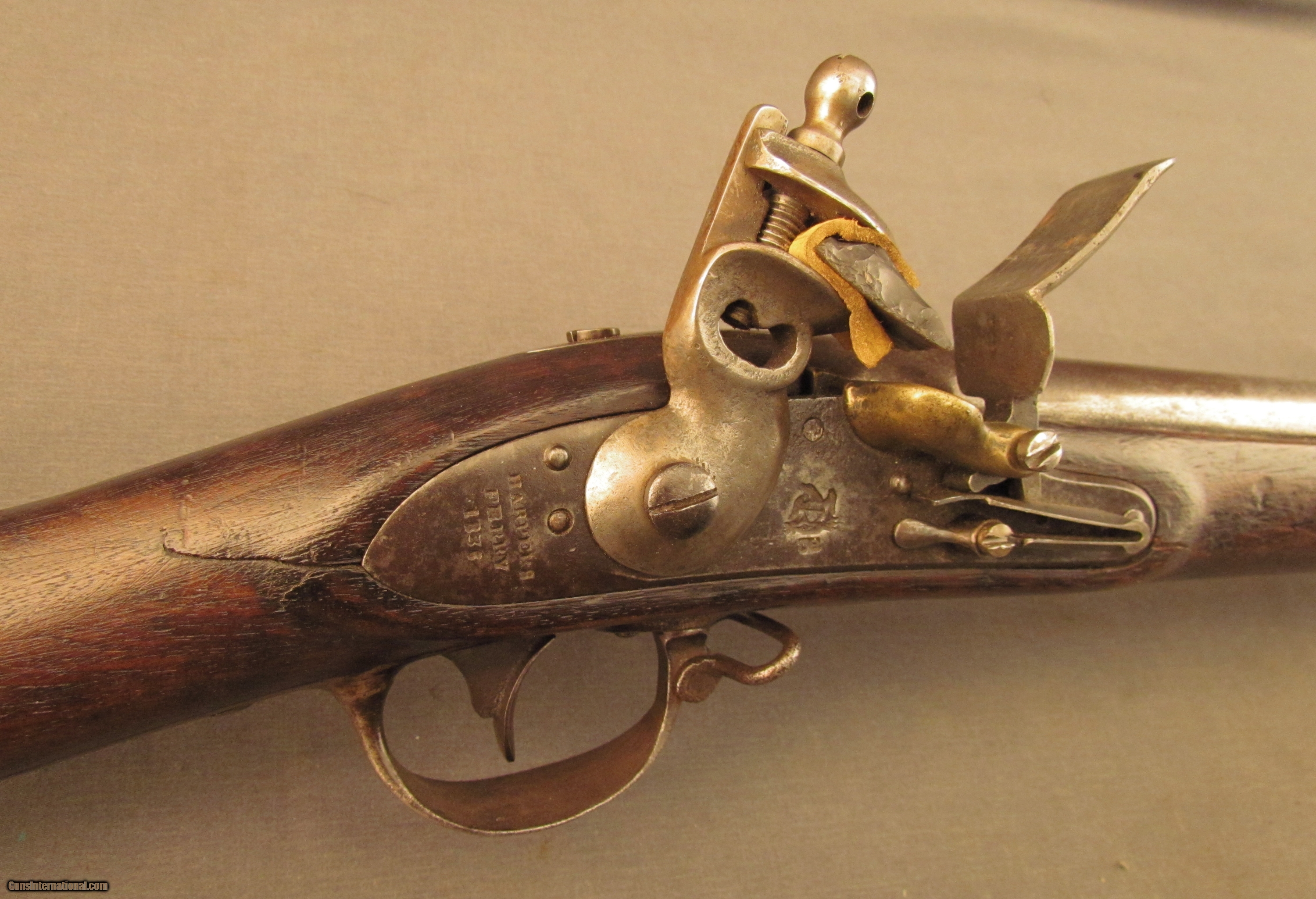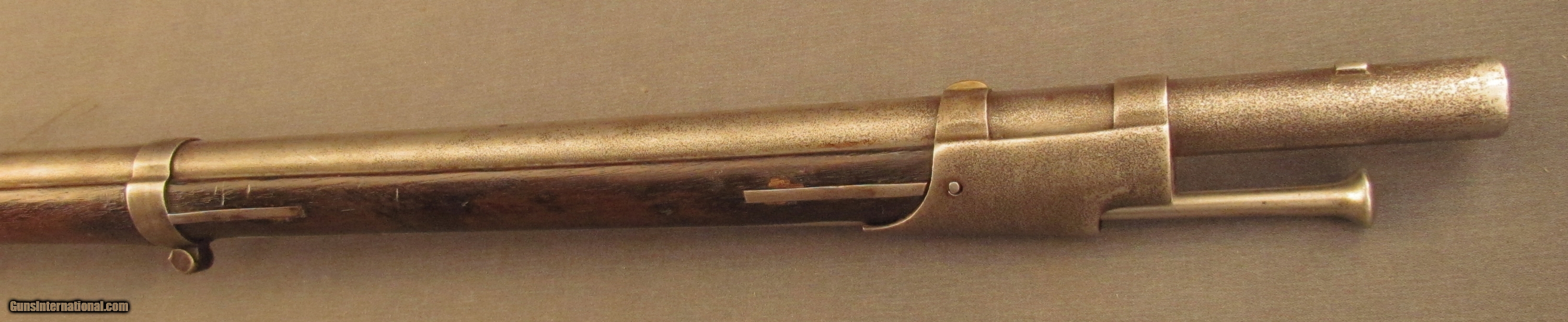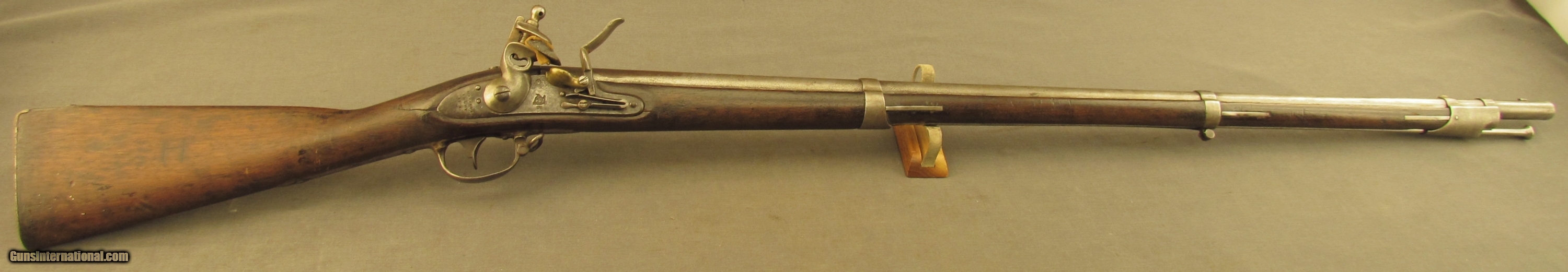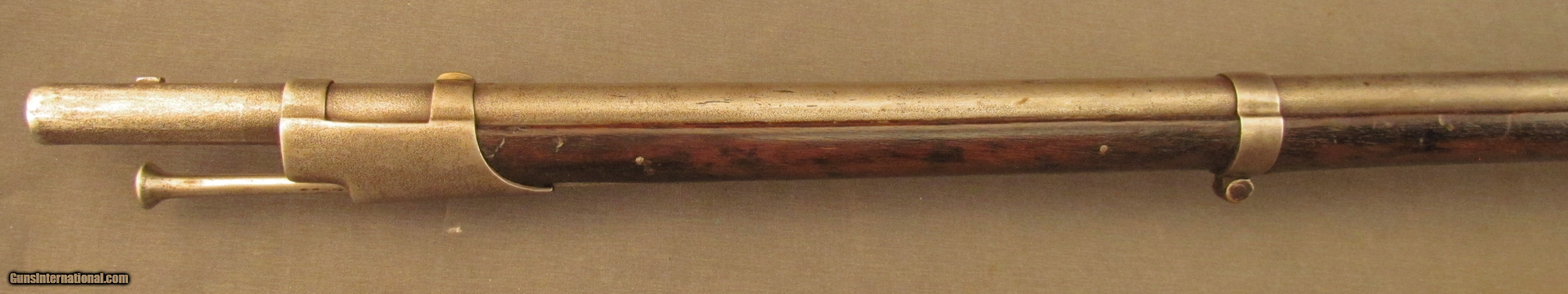 Description: Serial #102, .69 cal., 42” barrel with a fair, darkly freckled bore. This musket has been reconverted from percussion and has an 1825 dated, Springfield Manufacturing Co.-made barrel (marked “S.M.Co.” on the left breech flat below the Springfield proofmarks). The Harpers Ferry-made lock is dated 1832 while the trigger guard has the matching Springfield “102” serial number. There is light-moderate pitting throughout the darkly mottled, pewter gray metal, with even pinprick pitting that gets heaviest along the sides of the barrel where it meets the stock, and some mild oxidation on the forward surface of the frizzen. The walnut stock has a dark brown, added varnish finish with period carved identifying or unit markings on both sides of the buttstock (“H”), as well as scattered handling marks and blemishes. Additionally, there is a further lazy “E” marking on the right side of the stock just behind the sideplate that is repeated in the metal at the top of the barrel breech. The wood surrounding the lock has several small cracks and partial chips as well. A slightly too short, correct metal ramrod is included and the mechanism is tight and functional. This is a very nice looking example of a reconverted musket with an appealing antique look, and would make a great addition to any collection. {Ref. "American Military Shoulder Arms" Vol. 2 by George D. Moller; 1993} Antique SOLD Antique: Yes Manufacturer: Spfld Model: 1816 Serial Number: 102 Caliber Info: .69 Cal Gauge Info: .69 Cal |