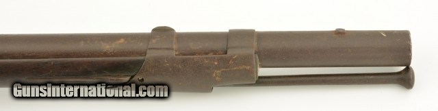 Description: NSN, .69 caliber, 44 1/2" barrel with fair-good, lightly pitted bore. This is an 1811-dated, Type III musket that has an overall plum-brown patina with evenly scattered areas of dark freckling and mild pinprick pitting, heaviest towards the breech. The musket was converted via the drum and nipple process, and has some mild surface oxidation on the drum, as well as on the hammer. the deeply struck "US" and "P / (eagle head) / V" proofs are still crisp and clear. The walnut stock, which has a thick, re-applied military oil finish, has scattered minor handling marks and small blemishes throughout, as well as an array of small brass brads added to the wood on top just ahead of the wrist. Additionally, a previous owner scratched his initials into the center of the sideplate on the left, "J (or (I) S." The lock is tight and functions well, and the original ramrod is still present. This is a very nice, US-marked, War of 1812 era musket in about good-near very good condition overall. Antique SOLD Antique: Yes |