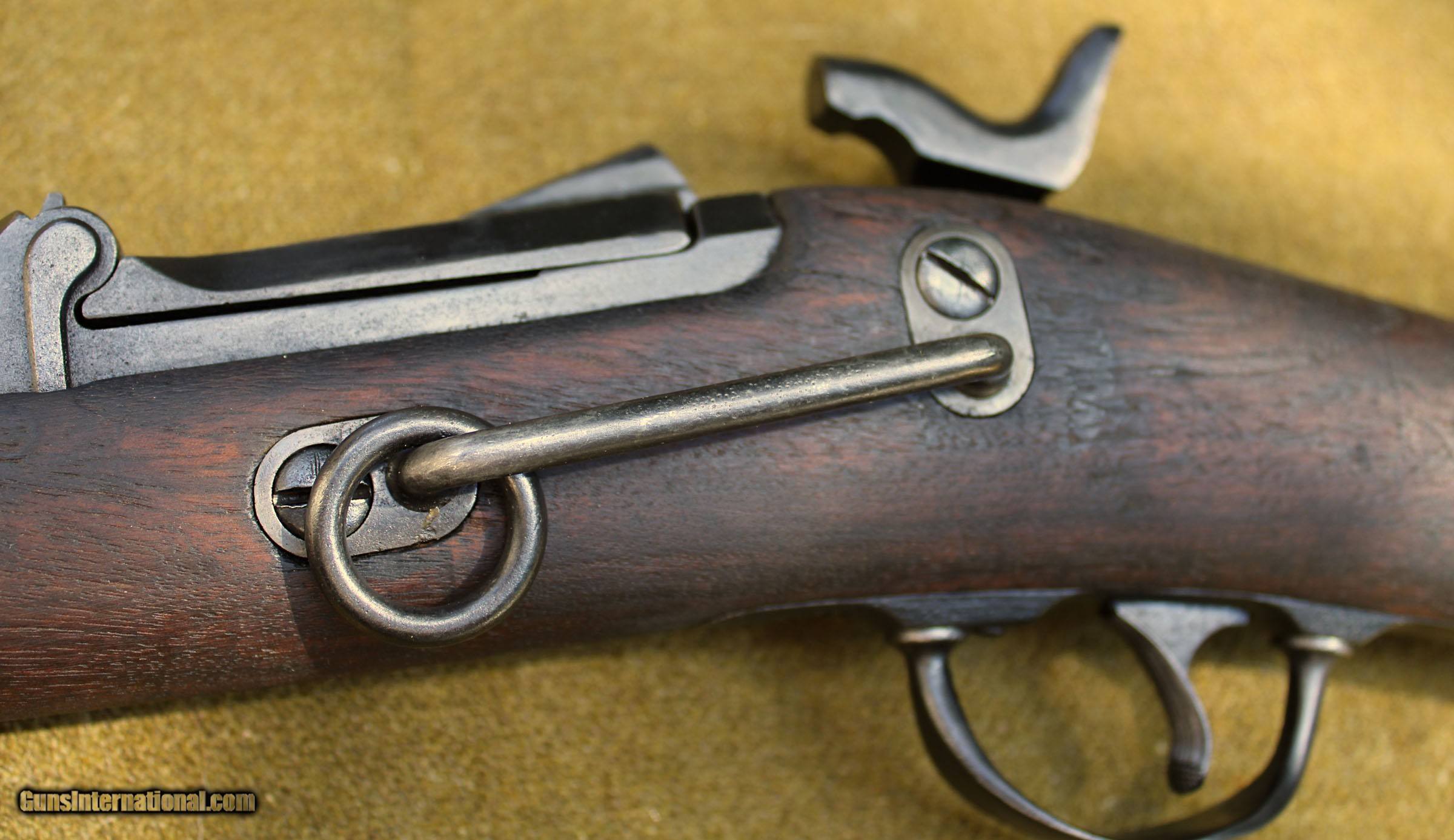Description: Offered for sale is this U.S. Model 1884 Springfield Carbine. This is a true original carbine, not a firearm assembled by someone from spare parts or a cut-down rifle. Based on the serial number (452689), this carbine was manufactured in 1888. All parts are correct for a firearm manufactured in that year. This carbine has a Model 1890 carbine rear sight protector barrel band. These bands were installed on carbines already in inventory at that time or on those that were sent in for repair. The rear Buffington sight is correctly marked with a “C” for a carbine. The windage knob is stiff but operable. The front sight is a fourth type as installed on carbines after 1886. The firing pin is a bronze alloy, which is also correct for a post-1886 firearm. This sale includes an original three-piece cleaning rod of the second type. This carbine has been detail stripped and extensively refurbished. Accordingly, there is no hundred+ year-old goop, grease, oil, or carbon to be found. The stock has been deep-cleaned, given a fresh coat of boiled linseed oil, and further given a coat of Renaissance Wax for protection. There is only one minor stock crack located on the front, left side near the barrel band. Appearance-wise, the stock does have some scratches and dents (see photos). All imperfections were not sanded out due to the fact that this stock has been previously refinished at some time or several times in the past. The result is that the barrel band fits a little loose and the stock cartouche is no longer visible. The metal has been re-blued using Pilkington’s rust bluing, the process originally known as “browning.” This is not a cold bluing process. The metal has also been given a final thin coat of linseed oil, as was originally done by the Springfield Armory for protection. The Springfield eagle on the lock plate is faint, but the words “U.S. Springfield can still be read. The barrel has some small dents and exterior pitting that do not affect the function of the carbine. Re-bluing does not remove these imperfections. Screw and bolt heads are sharp with no or minimal rounding. The bore has been extensively cleaned of all possible lead and black powder residue. The rifling is good, but there is minor bore pitting as is common for old black powder firearms. I have personally fired this carbine using period-correct .45-55-405 black powder cartridges without any problems. Accuracy and shot groups are good out to 100 yards. If you already have the correct black powder cartridges, this carbine is ready to go straight out of the box. All questions will be promptly answered. Thank you. SOLD Curio/Relic: Yes Antique: Yes Manufacturer: US Springfield Armory Model: 1884 Serial Number: 452689 Caliber Info: .45-55-405 Condition: Very good Metal Condition: Very good Wood Condition: Very good Bore Condition: Very good Action: Trapdoor Stock: Walnut Sights: Buffington Manufacture Date: 1888 Extras: Original 3-piece cleaning rod Item Location: Tallahassee, FL |