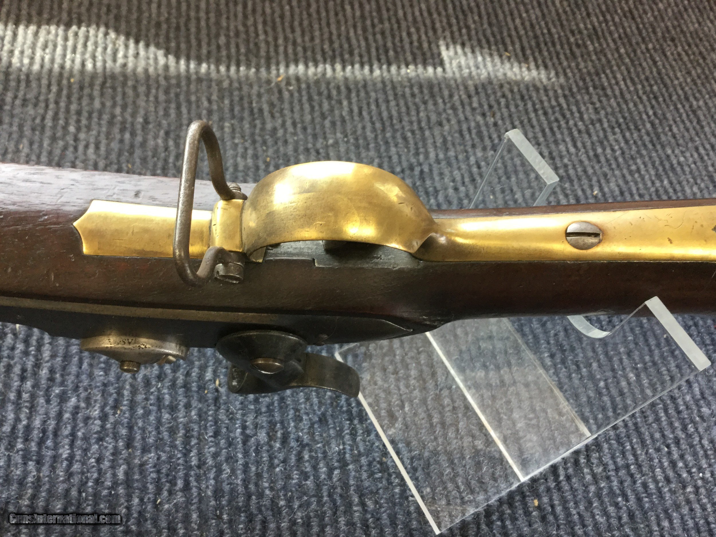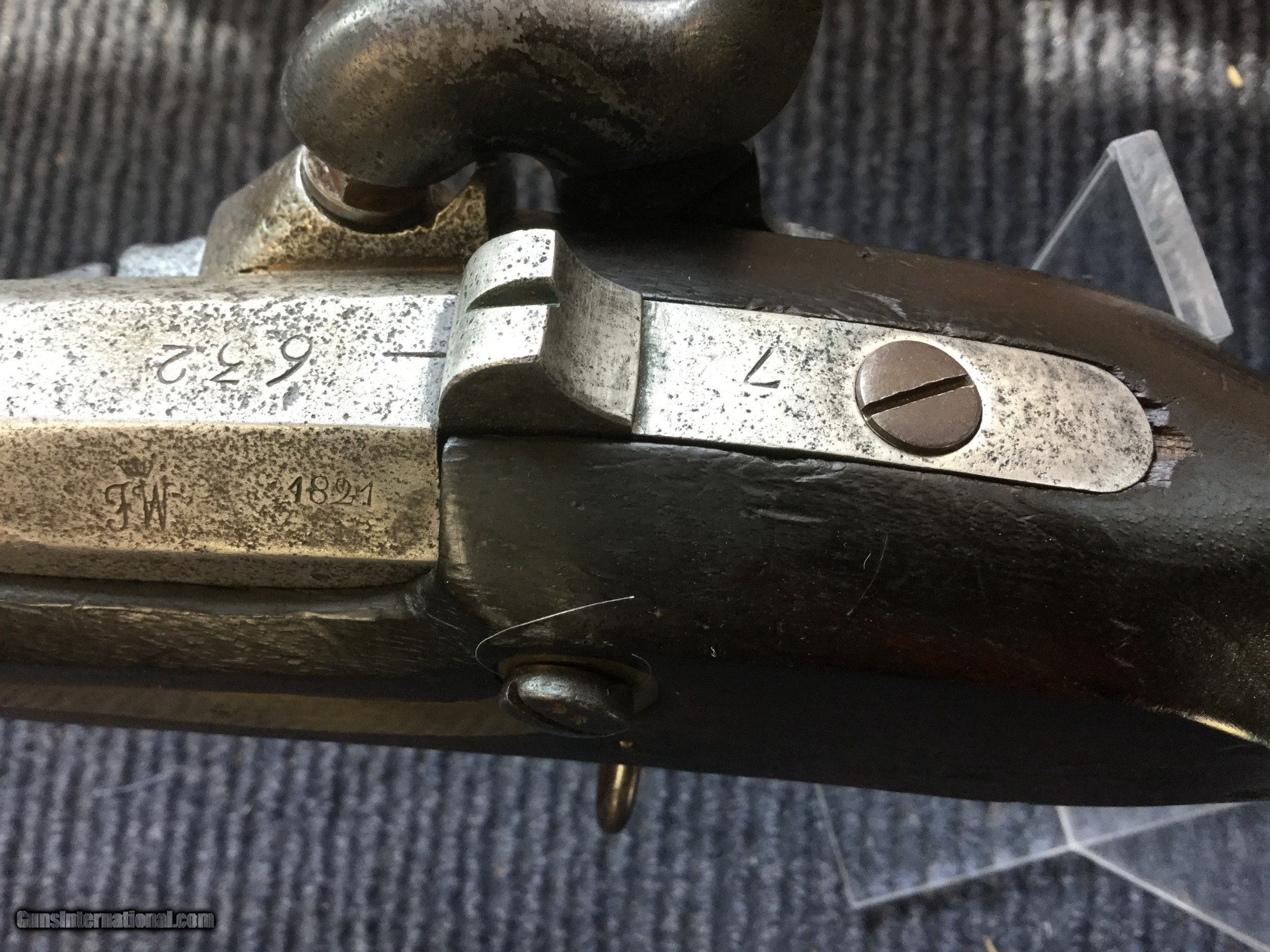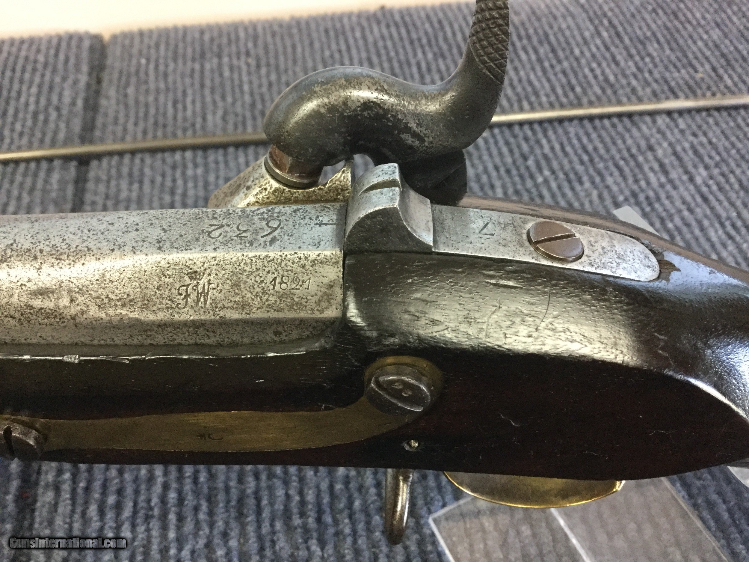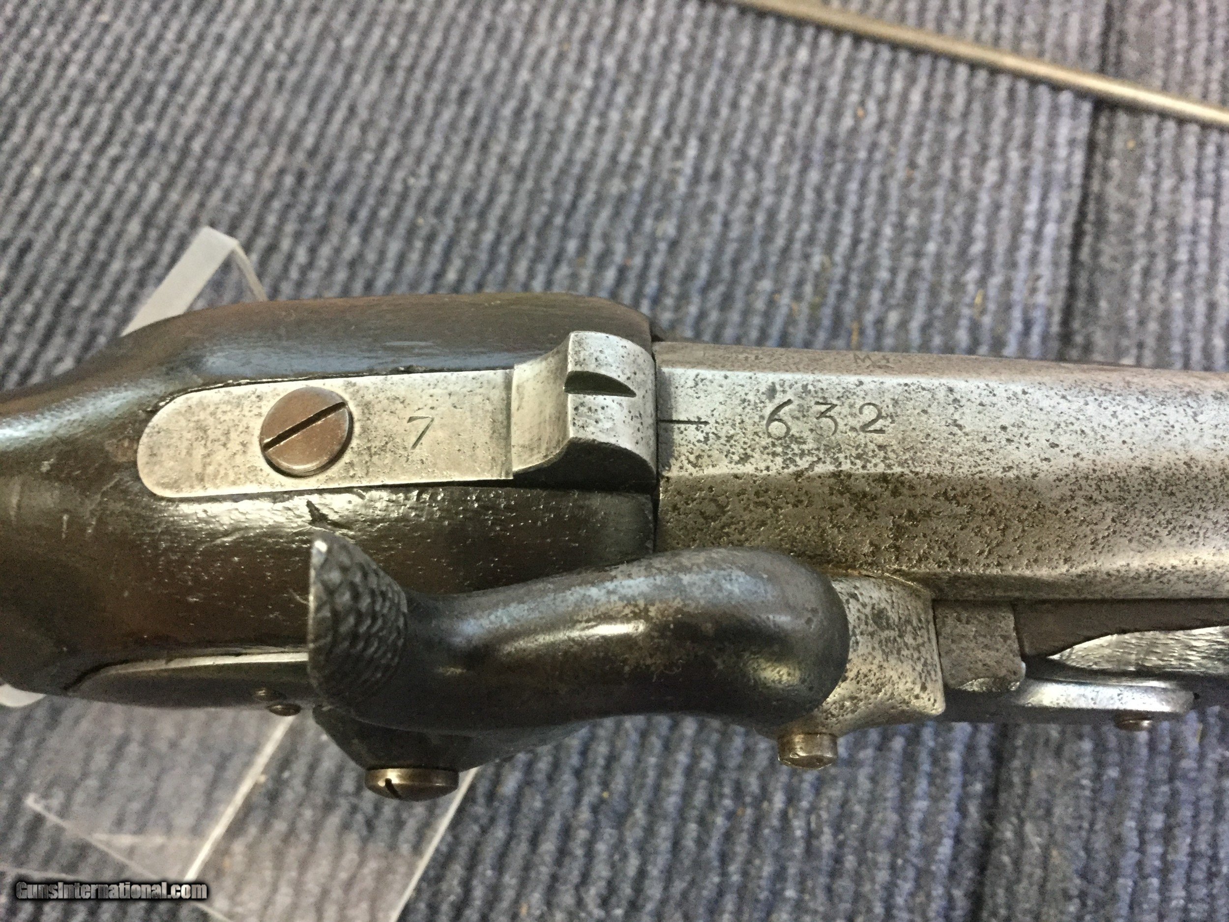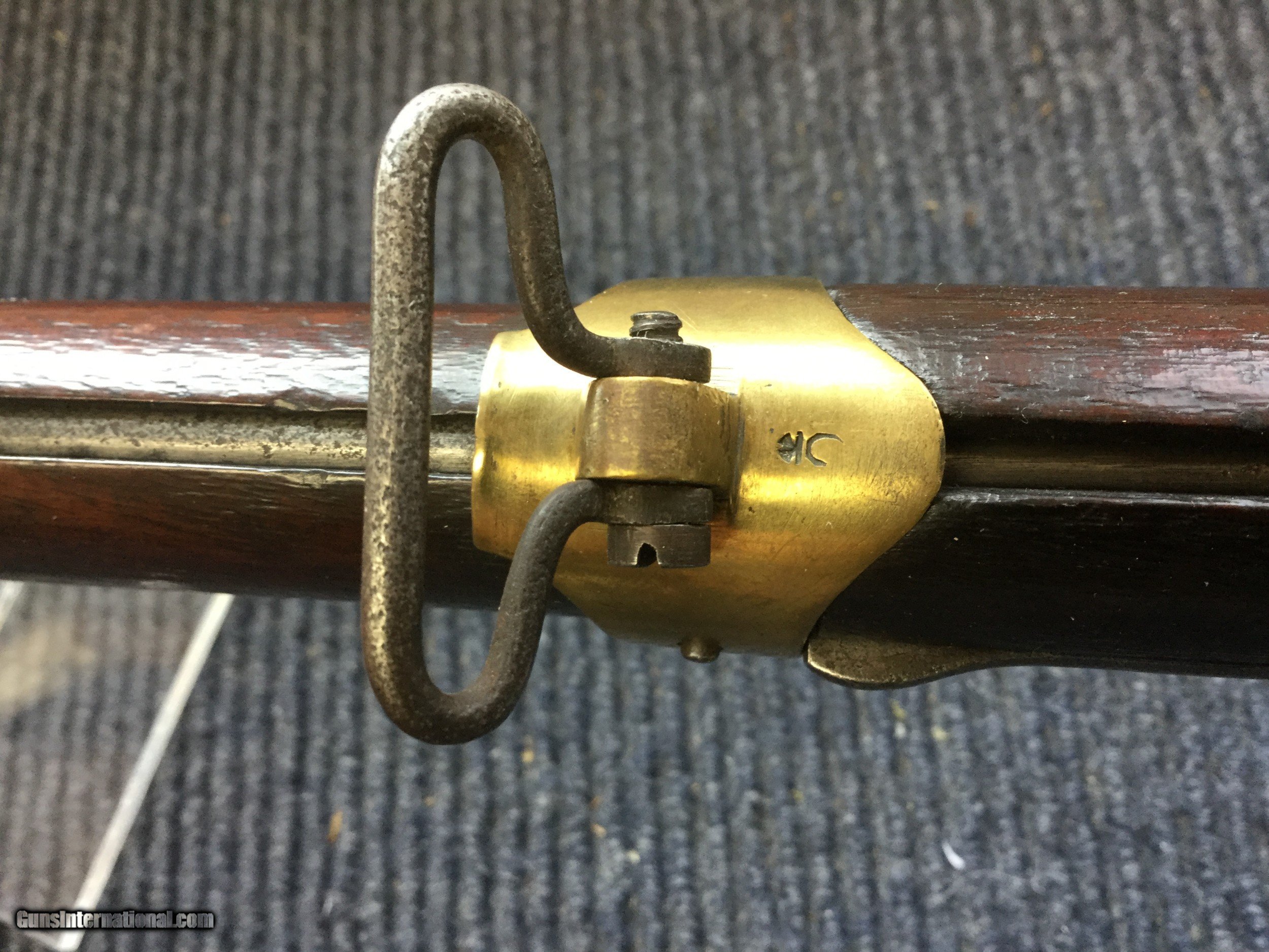Description: VERY FINE .70 CALIBER 1809 MODEL PRUSSIAN “POTSDAM” SMOOTHBORE MUSKET The 3-band Prussian Model 1809 Smoothbore Musket (often referred to as “the Potsdam Musket”) was one of the most recognizable imported arms during the American Civil War. The weapon was originally manufactured as a flintlock for use by the Prussian Army, with the lock plate stamped with the particular armory of manufacture - “Potsdam”, “Saarn”, “Neisse”, “Suhl” or “ Dresden”. Beginning in 1839 most were converted to the percussion system, with the year of that upgrade stamped on the underside of the barrel. Starting in 1855, the Prussians began to rearm their front line infantry with breech loading Dreyse rifles. Accordingly, even though the 1809 Model remained a well made and fully serviceable weapon, the Prussians sold many of their surplus to the United States government. The gun proved a reliable long arm for many infantry units. It was referred to by many soldiers as a “pumpkin slinger”, given the large caliber of round ball it sent down the battlefield (ranging from .69 to .72). It did serious damage up to 100 yards. This particular musket was acquired by me in 2012 to be used in smoothbore competition with the North South Skirmish Association. Judging the condition of the bore to be a bit iffy for competition, I had the barrel relined by Dan Whitaker, at his Civil War gun barrel workshop. (By my mic, the bore after relining is approximately .70; but mileage may vary with your own measurement). Relocation across the Country and the press of other matters has precluded my shooting let alone working up a proper load for this musket. Now, I am too geographically distant to further compete with the NSSA, so I am selling this musket along with other antique guns in my toy chest. The details of the musket are as follows: Barrel (steel): Having been relined the bore is absolutely smooth, bright and mint. There is consistent gray age patina on the exterior of the barrel, with some age spots but only very tiny and very random pin prick pitting. The bolster is clean and intact with an unbuggered cleanout screw and clean entry to the ignition chamber. The markings: Top Flat - large 632; under bolster very small AS; lower left flat medium FW with crown above and to right very small 1821; bottom of barrel rear - tiny 86 followed by birdlike symbol [hereafter maker mark #1] followed by small 1840 followed by large 2 and then another large 2 followed by 22414 and then another indistinguishable symbol (smile with dot above); breach plug has 7 on top flat, 22414 on right flat, tiny M with crown above on left flat, tiny 86 on bottom flat, and on rear flat a B and below an H above which is an indistinguishable tiny symbol. Breach plug mounts fixed rear sight which lines up perfectly with tiny cut in center of top flat of barrel. Spoon is mounted with tiny retaining pin at raised post with hole at bottom front of barrel. Hammer (appears case hardened): External - cock with deep cross hatch; inside stamped with tiny 86 and crown over M. Lock (appears case hardened): External - small surface pitting with stamps: maker mark #3, an S, and Saarn with small F below; inside - plate stamped with tiny 8 and 86 and 22414, and larger VFL, and stirrup marked with tiny 86. Barrel Bands (brass): Front band with front sight and external maker stamp (tiny crown or star or similar with wide U above [hereafter maker mark #2]; middle band with external maker stamp [#2] and internal L stamp; rear band with external maker stamp (0 with tiny star or crown or similar above [hereafter maker mark #3] and internal s inside 4 stamp points in square. Base Plate (brass): Bottom external stamped 22414 and, smaller, 42598; top external stamped with maker mark #3 and 632 and C. and 28 and L.W. R. 1821 just below top screw hole. Swivels (iron): no marks Estrucheon Screws (iron): Each stamped with tiny 86. Estrucheon (brass): 0 with indistinguishable symbol above stamped on exterior center. Trigger Guard (brass): exterior - tiny 86 with indistinguishable symbol below on far bottom; interior - medium L at far top . Ramrod (steel): Flat bottom, swelled flat top with internal screw thread for attachments. Marks: medium 605 at top, 5 below, then 5 below, tiny 0 with crown above at top, tiny 11 or 77 at top. Series of 3 small W's midway on rod appear scratched there by soldier. Furniture: Very solid and intact with minimal shrinkage and still with good wood to metal fit. Some minor wear and crease marks consistent with age. Tiny chip immediately behind tang end. Walnut stock is very solid with intact ramrod channel. Markings: Marked on lock flat with large FW with crown above in center, and M with crown above to right. Underneath trigger guard: two I's and a back slash. In top of inlet, below lock: 7 small slashes at center top, 2 larger slashes to the right. From the foregoing it appears the gun is one of the mid generation issues of the 1809 Model Prussian ("Potsdam"). Butt plate and barrel markings identify it as having been made in 1821 at the Prussian military factory at Saarn. Conversion to percussion by the typical armory mode was done in 1840, but it is unclear precisely where. (I believe from S stamps either Saarn or the factory at Soemmerda). The buttplate markings indicate this was musket #632 of Company C of the 28th Landwehr Regiment. The Landwehr regiments were originally formed in 1813 as active field regiments of the Prussian army, but in 1859 these units were redesignated local defense units composed of all able men 17 to 45 not in the regular army, who were to serve as “national guard” troops in the local area where mustered. In 1855, the Prussians had some 380,000 Model 1809 muskets still in active use, and began a program of “modernizing” these weapons by rifling and resighting them. This program had hardly begun when government officials decided to replace the Model 1809 with the new breach loading