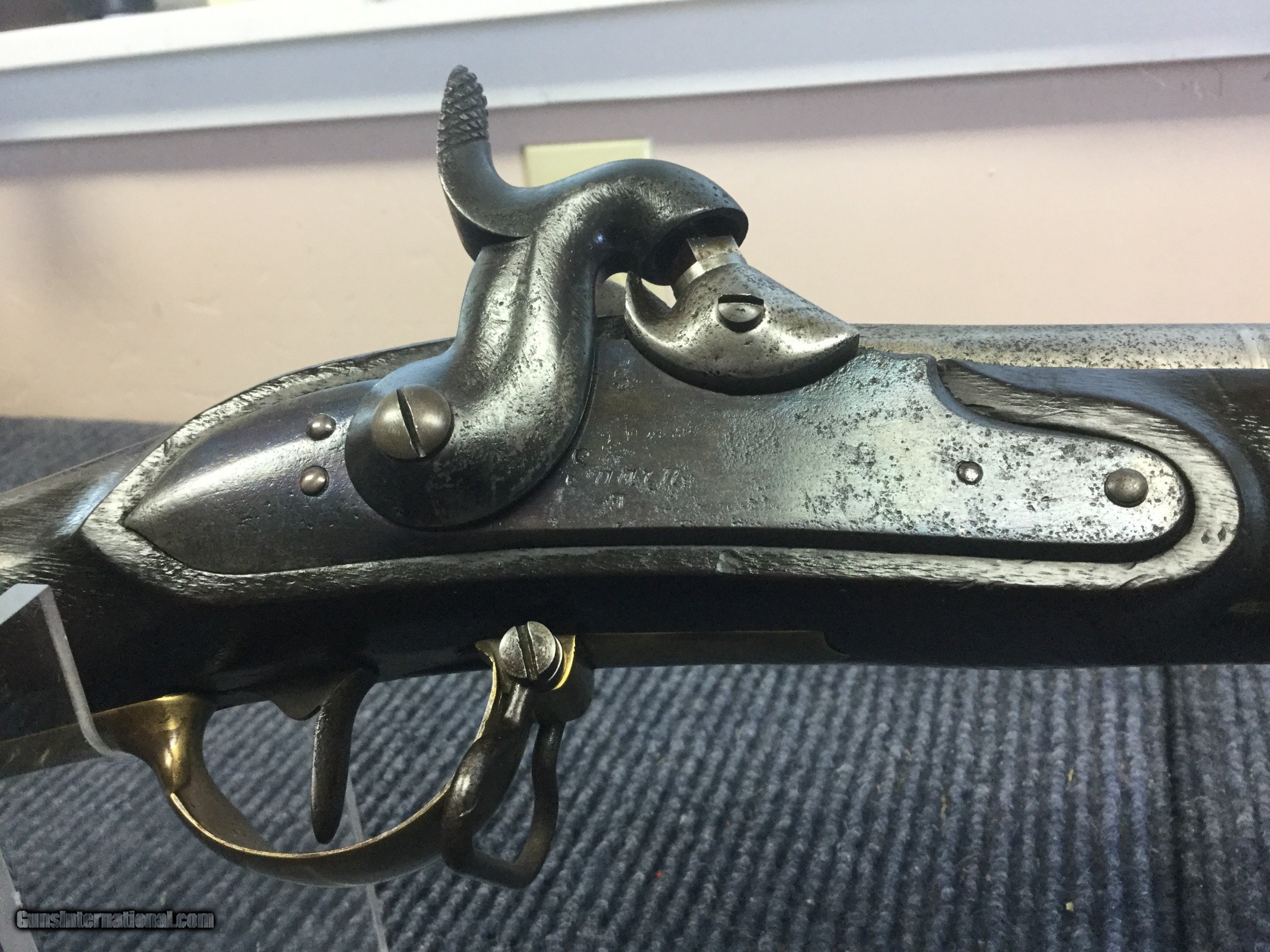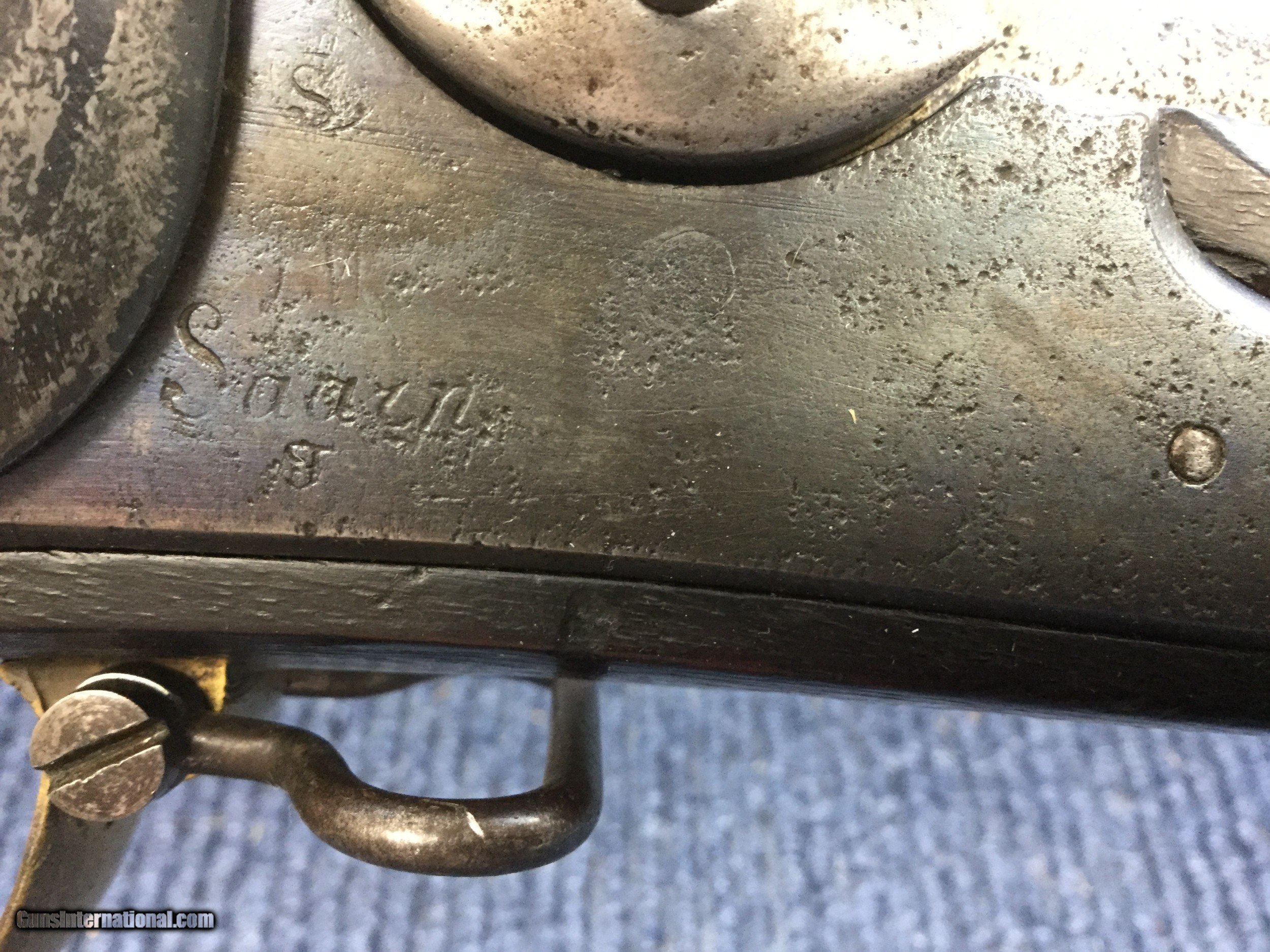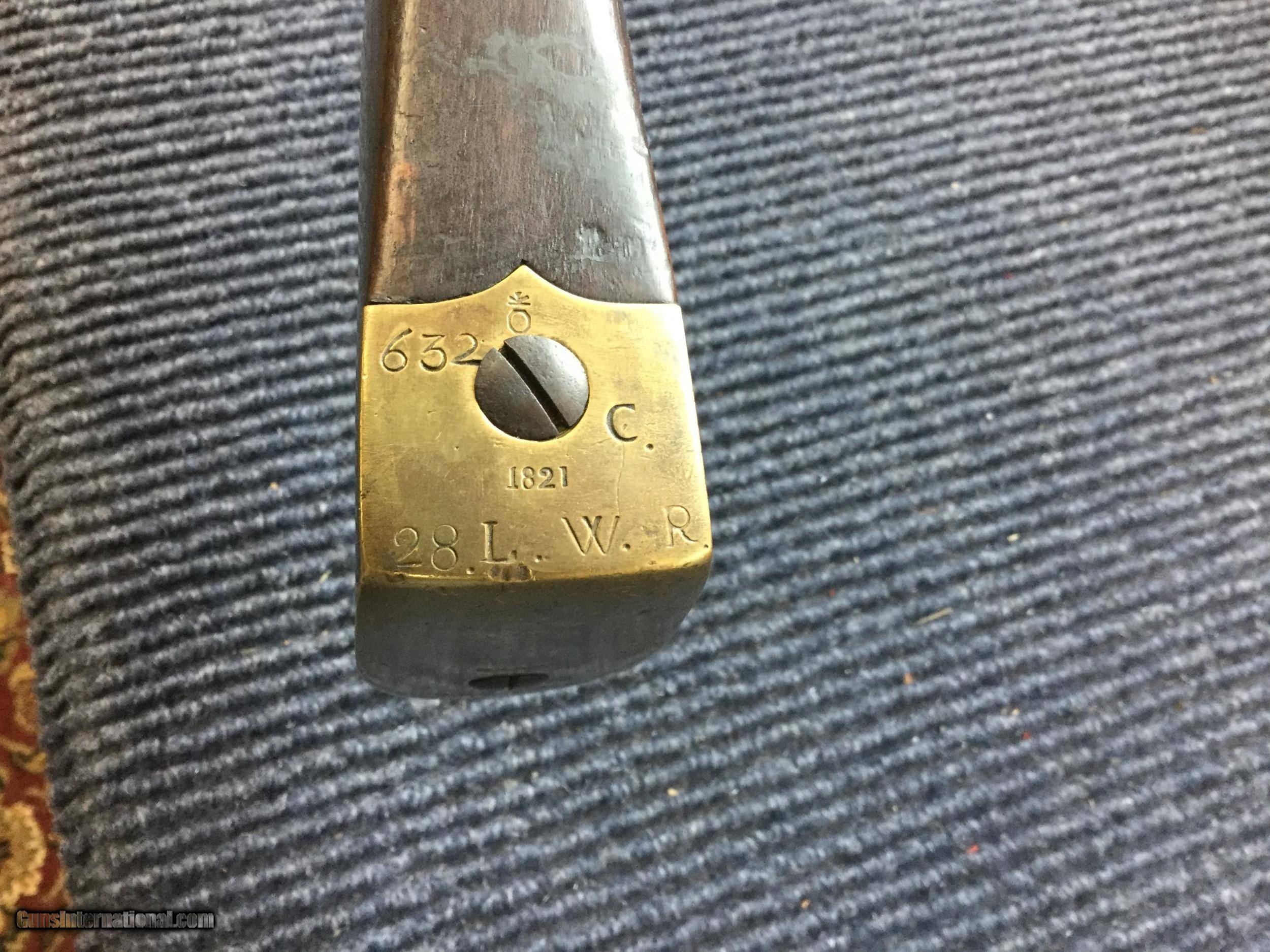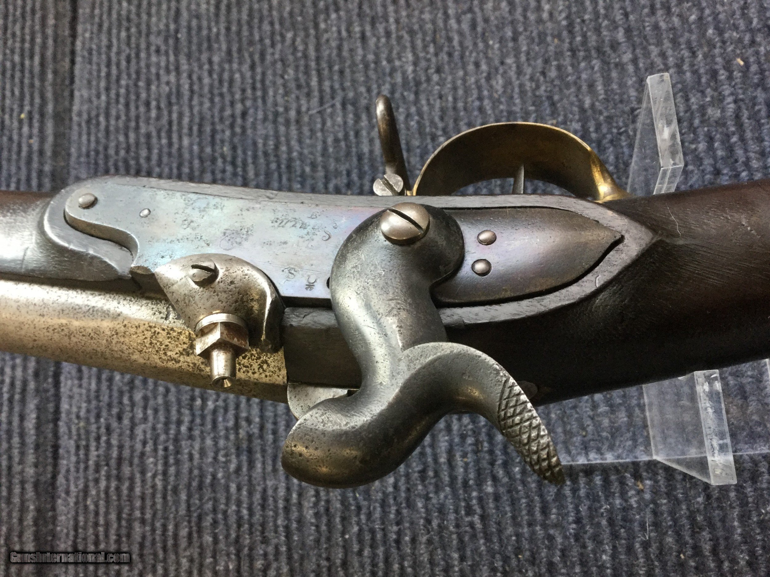 Description: VERY FINE .70 CALIBER 1809 MODEL PRUSSIAN “POTSDAM” SMOOTHBORE MUSKET The 3-band Prussian Model 1809 Smoothbore Musket (often referred to as “the Potsdam Musket”) was one of the most recognizable imported arms during the American Civil War. The weapon was originally manufactured as a flintlock for use by the Prussian Army, with the lock plate stamped with the particular armory of manufacture - “Potsdam”, “Saarn”, “Neisse”, “Suhl” or “ Dresden”. Beginning in 1839 most were converted to the percussion system, with the year of that upgrade stamped on the underside of the barrel. Starting in 1855, the Prussians began to rearm their front line infantry with breech loading Dreyse rifles. Accordingly, even though the 1809 Model remained a well made and fully serviceable weapon, the Prussians sold many of their surplus to the United States government. The gun proved a reliable long arm for many infantry units. It was referred to by many soldiers as a “pumpkin slinger”, given the large caliber of round ball it sent down the battlefield (ranging from .69 to .72). It did serious damage up to 100 yards. This particular musket was acquired by me in 2012 to be used in smoothbore competition with the North South Skirmish Association. Judging the condition of the bore to be a bit iffy for competition, I had the barrel relined by Dan Whitaker, at his Civil War gun barrel workshop. (By my mic, the bore after relining is approximately .70; but mileage may vary with your own measurement). Relocation across the Country and the press of other matters has precluded my shooting let alone working up a proper load for this musket. Now, I am too geographically distant to further compete with the NSSA, so I am selling this musket along with other antique guns in my toy chest. The details of the musket are as follows: Barrel (steel): Having been relined the bore is absolutely smooth, bright and mint. There is consistent gray age patina on the exterior of the barrel, with some age spots but only very tiny and very random pin prick pitting. The bolster is clean and intact with an unbuggered cleanout screw and clean entry to the ignition chamber. The markings: Top Flat - large 632; under bolster very small AS; lower left flat medium FW with crown above and to right very small 1821; bottom of barrel rear - tiny 86 followed by birdlike symbol [hereafter maker mark #1] followed by small 1840 followed by large 2 and then another large 2 followed by 22414 and then another indistinguishable symbol (smile with dot above); breach plug has 7 on top flat, 22414 on right flat, tiny M with crown above on left flat, tiny 86 on bottom flat, and on rear flat a B and below an H above which is an indistinguishable tiny symbol. Breach plug mounts fixed rear sight which lines up perfectly with tiny cut in center of top flat of barrel. Spoon is mounted with tiny retaining pin at raised post with hole at bottom front of barrel. Hammer (appears case hardened): External - cock with deep cross hatch; inside stamped with tiny 86 and crown over M. Lock (appears case hardened): External - small surface pitting with stamps: maker mark #3, an S, and Saarn with small F below; inside - plate stamped with tiny 8 and 86 and 22414, and larger VFL, and stirrup marked with tiny 86. Barrel Bands (brass): Front band with front sight and external maker stamp (tiny crown or star or similar with wide U above [hereafter maker mark #2]; middle band with external maker stamp [#2] and internal L stamp; rear band with external maker stamp (0 with tiny star or crown or similar above [hereafter maker mark #3] and internal s inside 4 stamp points in square. Base Plate (brass): Bottom external stamped 22414 and, smaller, 42598; top external stamped with maker mark #3 and 632 and C. and 28 and L.W. R. 1821 just below top screw hole. Swivels (iron): no marks Estrucheon Screws (iron): Each stamped with tiny 86. Estrucheon (brass): 0 with indistinguishable symbol above stamped on exterior center. Trigger Guard (brass): exterior - tiny 86 with indistinguishable symbol below on far bottom; interior - medium L at far top . Ramrod (steel): Flat bottom, swelled flat top with internal screw thread for attachments. Marks: medium 605 at top, 5 below, then 5 below, tiny 0 with crown above at top, tiny 11 or 77 at top. Series of 3 small W's midway on rod appear scratched there by soldier. Furniture: Very solid and intact with minimal shrinkage and still with good wood to metal fit. Some minor wear and crease marks consistent with age. Tiny chip immediately behind tang end. Walnut stock is very solid with intact ramrod channel. Markings: Marked on lock flat with large FW with crown above in center, and M with crown above to right. Underneath trigger guard: two I's and a back slash. In top of inlet, below lock: 7 small slashes at center top, 2 larger slashes to the right. From the foregoing it appears the gun is one of the mid generation issues of the 1809 Model Prussian ("Potsdam"). Butt plate and barrel markings identify it as having been made in 1821 at the Prussian military factory at Saarn. Conversion to percussion by the typical armory mode was done in 1840, but it is unclear precisely where. (I believe from S stamps either Saarn or the factory at Soemmerda). The buttplate markings indicate this was musket #632 of Company C of the 28th Landwehr Regiment. The Landwehr regiments were originally formed in 1813 as active field regiments of the Prussian army, but in 1859 these units were redesignated local defense units composed of all able men 17 to 45 not in the regular army, who were to serve as “national guard” troops in the local area where mustered. In 1855, the Prussians had some 380,000 Model 1809 muskets still in active use, and began a program of “modernizing” these weapons by rifling and resighting them. This program had hardly begun when government officials decided to replace the Model 1809 with the new breach loading