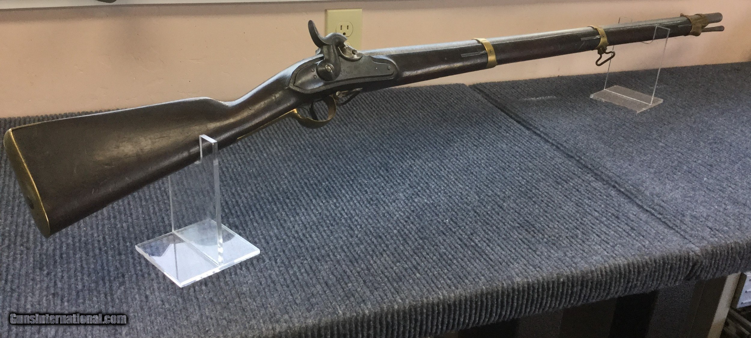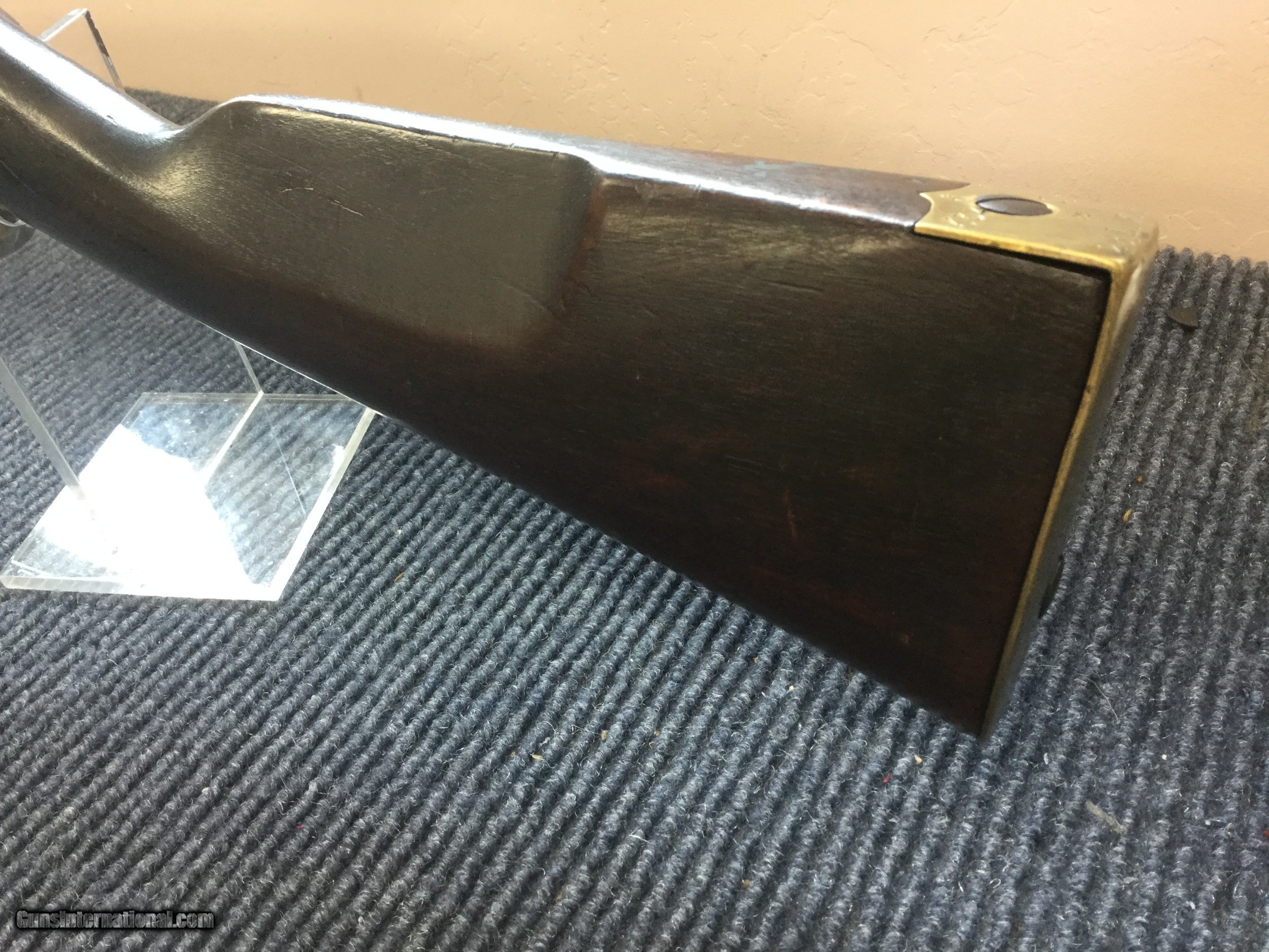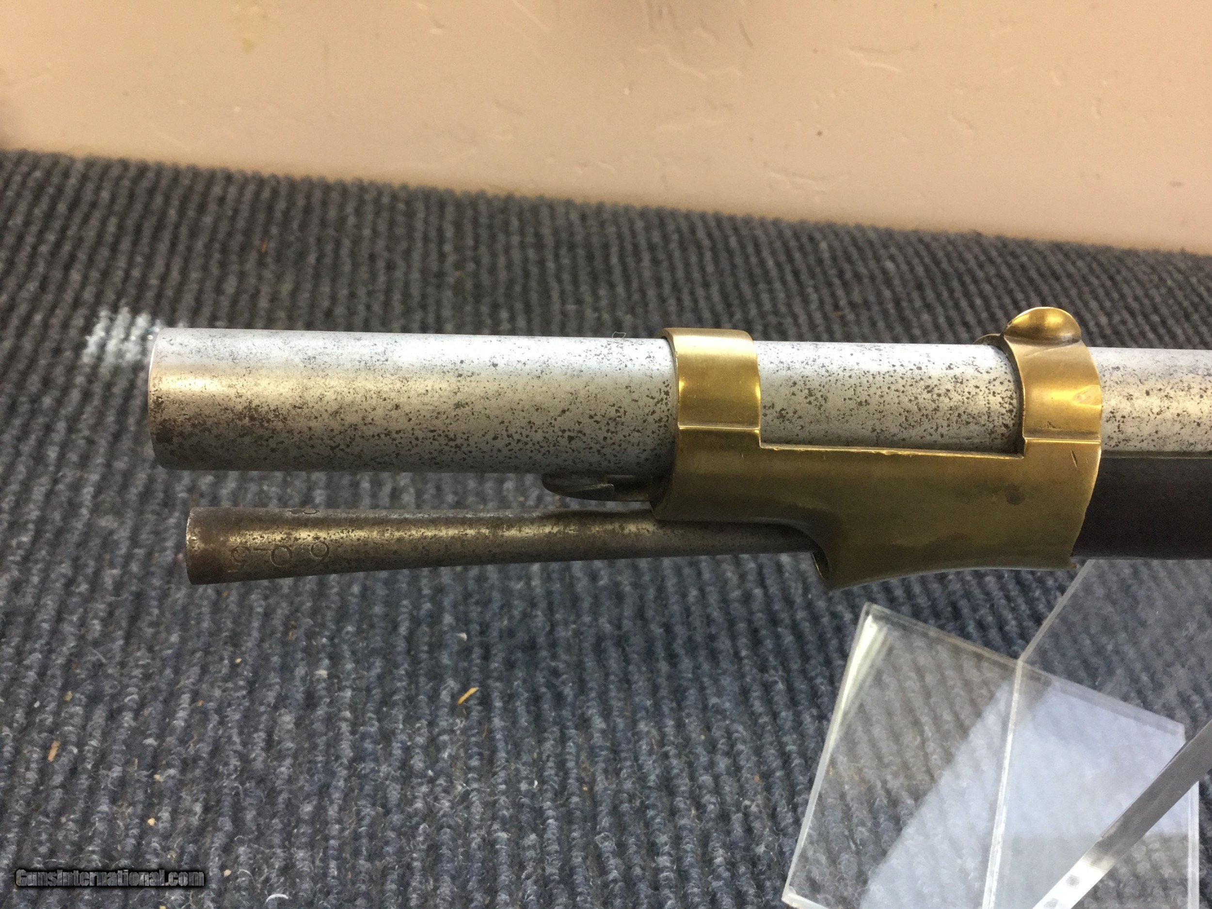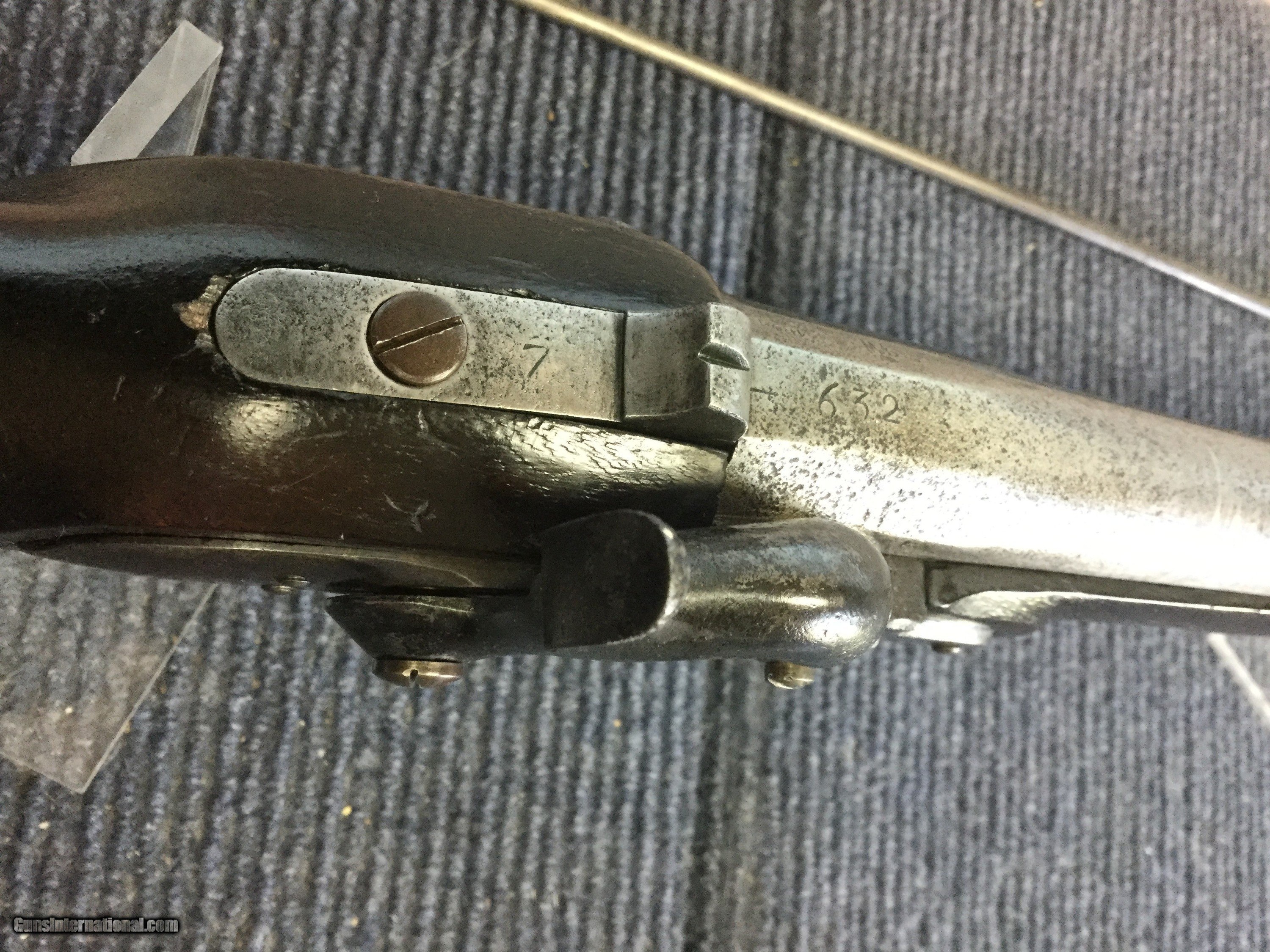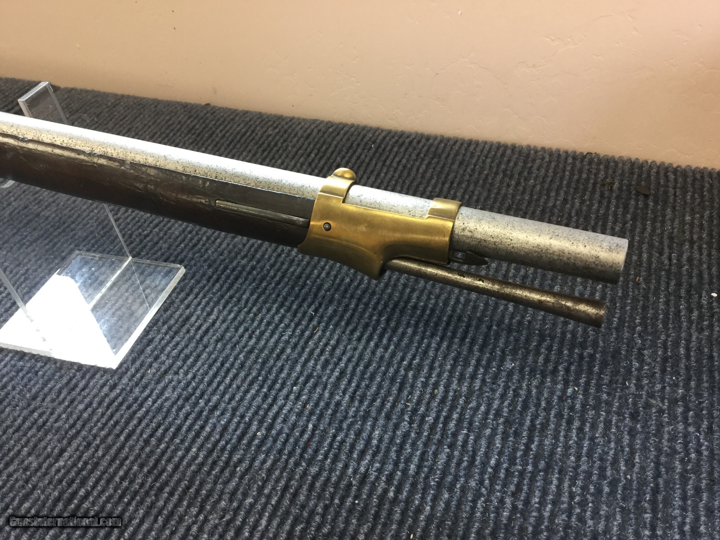Description: VERY FINE .70 CALIBER 1809 MODEL PRUSSIAN “POTSDAM” SMOOTHBORE MUSKET The 3-band Prussian Model 1809 Smoothbore Musket (often referred to as “the Potsdam Musket”) was one of the most recognizable imported arms during the American Civil War. The weapon was originally manufactured as a flintlock for use by the Prussian Army, with the lock plate stamped with the particular armory of manufacture - “Potsdam”, “Saarn”, “Neisse”, “Suhl” or “ Dresden”. Beginning in 1839 most were converted to the percussion system, with the year of that upgrade stamped on the underside of the barrel. Starting in 1855, the Prussians began to rearm their front line infantry with breech loading Dreyse rifles. Accordingly, even though the 1809 Model remained a well made and fully serviceable weapon, the Prussians sold many of their surplus to the United States government. The gun proved a reliable long arm for many infantry units. It was referred to by many soldiers as a “pumpkin slinger”, given the large caliber of round ball it sent down the battlefield (ranging from .69 to .72). It did serious damage up to 100 yards. This particular musket was acquired by me in 2012 to be used in smoothbore competition with the North South Skirmish Association. Judging the condition of the bore to be a bit iffy for competition, I had the barrel relined by Dan Whitaker, at his Civil War gun barrel workshop. (By my mic, the bore after relining is approximately .70; but mileage may vary with your own measurement). Relocation across the Country and the press of other matters has precluded my shooting let alone working up a proper load for this musket. Now, I am too geographically distant to further compete with the NSSA, so I am selling this musket along with other antique guns in my toy chest. The details of the musket are as follows: Barrel (steel): Having been relined the bore is absolutely smooth, bright and mint. There is consistent gray age patina on the exterior of the barrel, with some age spots but only very tiny and very random pin prick pitting. The bolster is clean and intact with an unbuggered cleanout screw and clean entry to the ignition chamber. The markings: Top Flat - large 632; under bolster very small AS; lower left flat medium FW with crown above and to right very small 1821; bottom of barrel rear - tiny 86 followed by birdlike symbol [hereafter maker mark #1] followed by small 1840 followed by large 2 and then another large 2 followed by 22414 and then another indistinguishable symbol (smile with dot above); breach plug has 7 on top flat, 22414 on right flat, tiny M with crown above on left flat, tiny 86 on bottom flat, and on rear flat a B and below an H above which is an indistinguishable tiny symbol. Breach plug mounts fixed rear sight which lines up perfectly with tiny cut in center of top flat of barrel. Spoon is mounted with tiny retaining pin at raised post with hole at bottom front of barrel. Hammer (appears case hardened): External - cock with deep cross hatch; inside stamped with tiny 86 and crown over M. Lock (appears case hardened): External - small surface pitting with stamps: maker mark #3, an S, and Saarn with small F below; inside - plate stamped with tiny 8 and 86 and 22414, and larger VFL, and stirrup marked with tiny 86. Barrel Bands (brass): Front band with front sight and external maker stamp (tiny crown or star or similar with wide U above [hereafter maker mark #2]; middle band with external maker stamp [#2] and internal L stamp; rear band with external maker stamp (0 with tiny star or crown or similar above [hereafter maker mark #3] and internal s inside 4 stamp points in square. Base Plate (brass): Bottom external stamped 22414 and, smaller, 42598; top external stamped with maker mark #3 and 632 and C. and 28 and L.W. R. 1821 just below top screw hole. Swivels (iron): no marks Estrucheon Screws (iron): Each stamped with tiny 86. Estrucheon (brass): 0 with indistinguishable symbol above stamped on exterior center. Trigger Guard (brass): exterior - tiny 86 with indistinguishable symbol below on far bottom; interior - medium L at far top . Ramrod (steel): Flat bottom, swelled flat top with internal screw thread for attachments. Marks: medium 605 at top, 5 below, then 5 below, tiny 0 with crown above at top, tiny 11 or 77 at top. Series of 3 small W's midway on rod appear scratched there by soldier. Furniture: Very solid and intact with minimal shrinkage and still with good wood to metal fit. Some minor wear and crease marks consistent with age. Tiny chip immediately behind tang end. Walnut stock is very solid with intact ramrod channel. Markings: Marked on lock flat with large FW with crown above in center, and M with crown above to right. Underneath trigger guard: two I's and a back slash. In top of inlet, below lock: 7 small slashes at center top, 2 larger slashes to the right. From the foregoing it appears the gun is one of the mid generation issues of the 1809 Model Prussian ("Potsdam"). Butt plate and barrel markings identify it as having been made in 1821 at the Prussian military factory at Saarn. Conversion to percussion by the typical armory mode was done in 1840, but it is unclear precisely where. (I believe from S stamps either Saarn or the factory at Soemmerda). The buttplate markings indicate this was musket #632 of Company C of the 28th Landwehr Regiment. The Landwehr regiments were originally formed in 1813 as active field regiments of the Prussian army, but in 1859 these units were redesignated local defense units composed of all able men 17 to 45 not in the regular army, who were to serve as “national guard” troops in the local area where mustered. In 1855, the Prussians had some 380,000 Model 1809 muskets still in active use, and began a program of “modernizing” these weapons by rifling and resighting them. This program had hardly begun when government officials decided to replace the Model 1809 with the new breach loading
