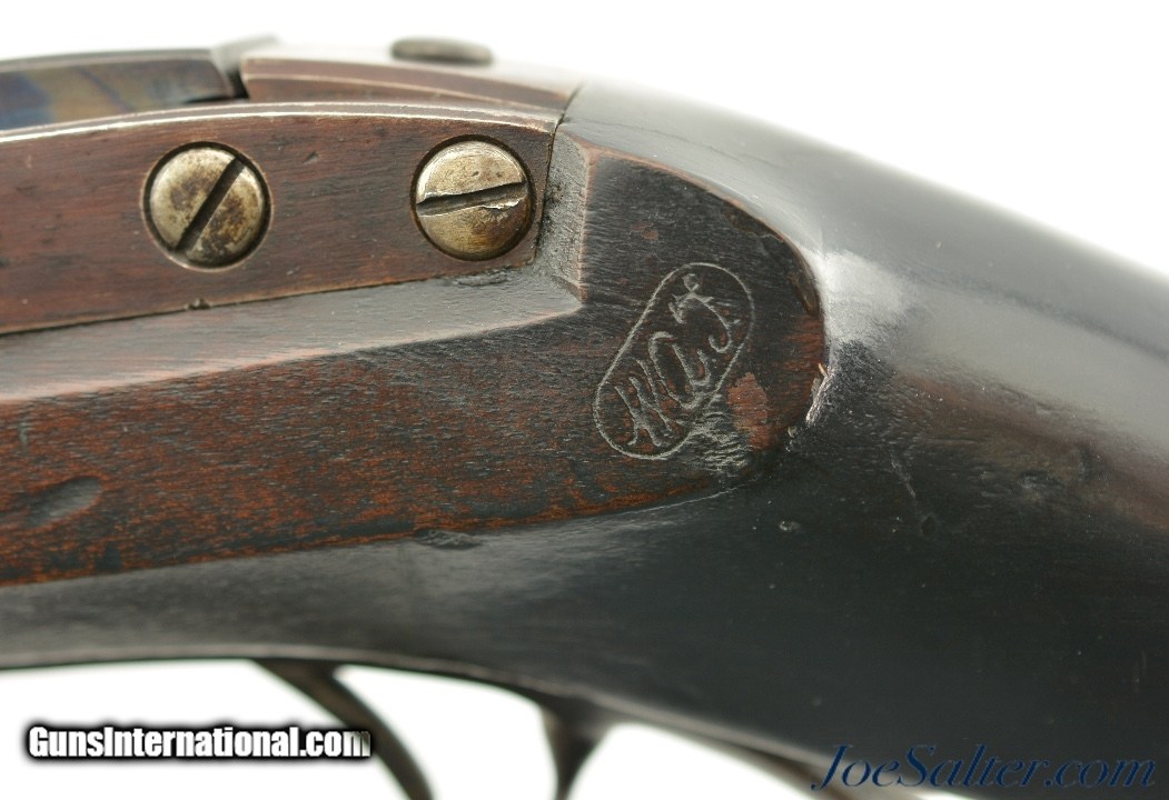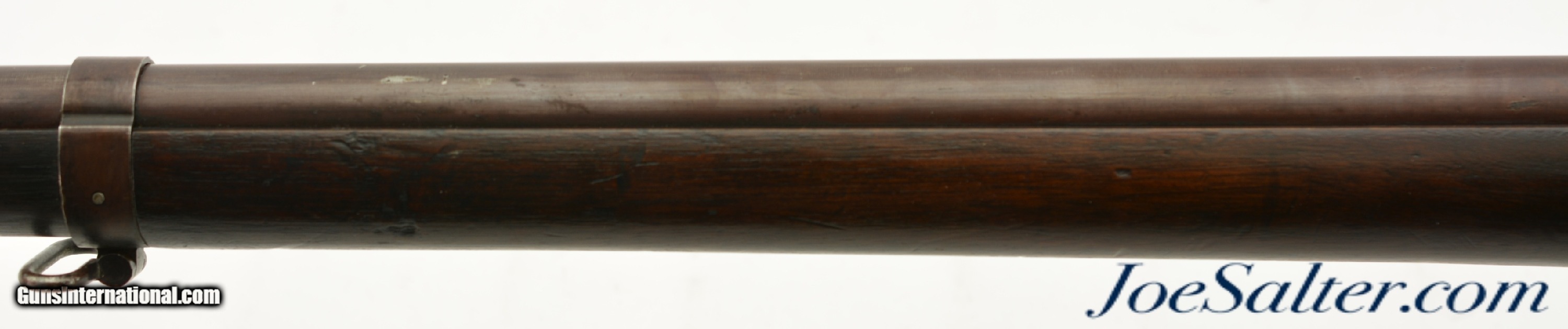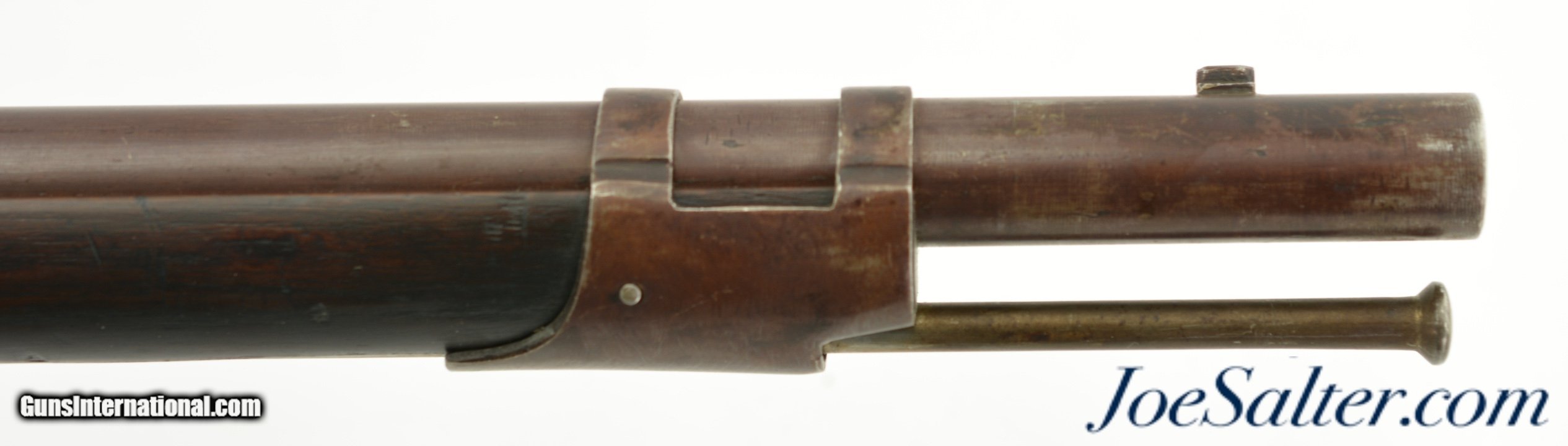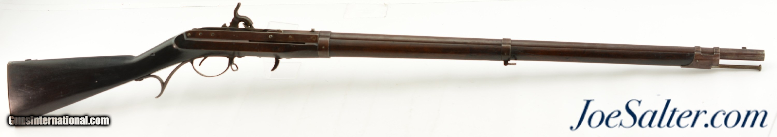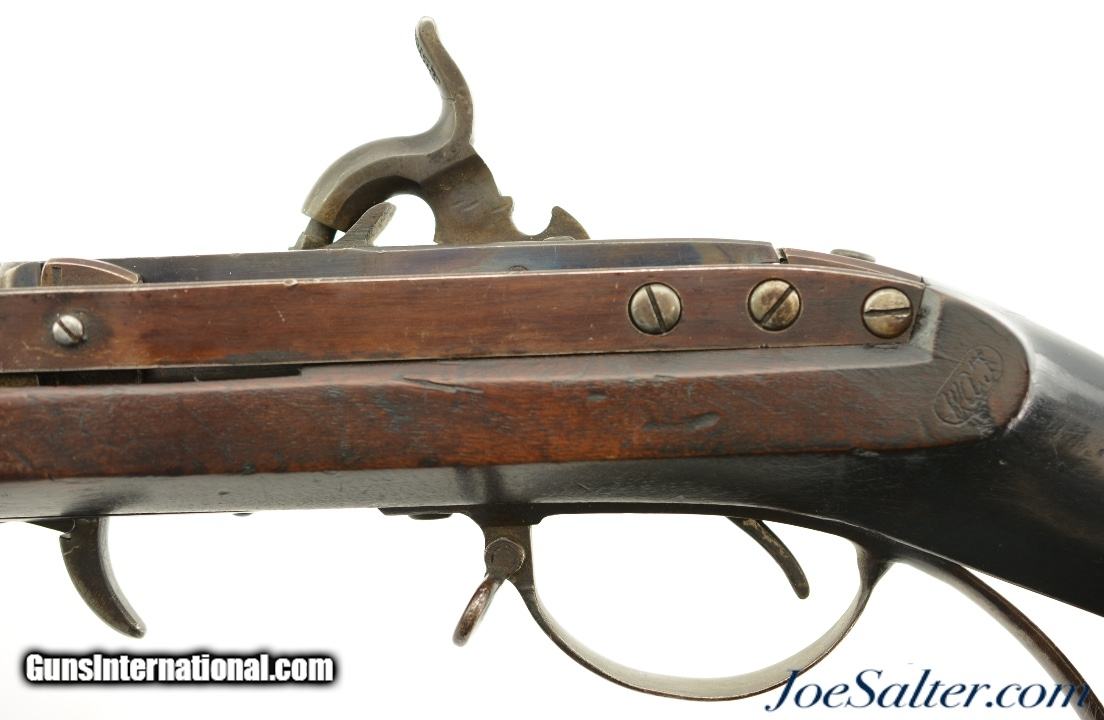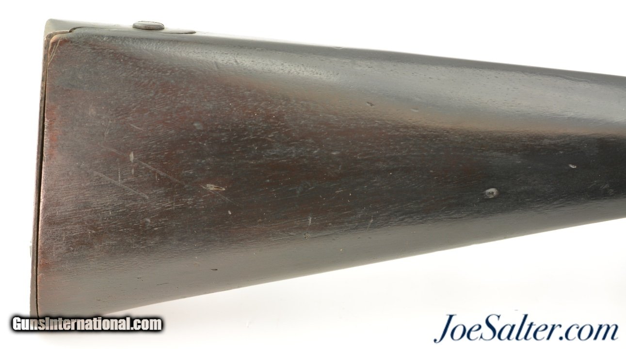 Description: NSN, .52 Caliber, 32 1/2" barrel with an excellent, bright bore. This is a very handsome rifle that has an 1832-dated breech piece that has about 60-65% of a lustrous blue finish applied during the conversion to percussion, and pale gray on the balance. The barrel and other metal components retain 75-80% of the original browned finish, with silvering and mild gray fading at the muzzle, as well as along the high edges and projections. The walnut stock is in fine shape with some minor handling marks and small blemishes scattered about the otherwise fine added military oil finish. A barely visible arsenal repair is present on the top of the wrist where it meets the breech piece (a commonly encountered repair). The "WAT" (William A. Thornton) inspector cartouche is crisp and clear on the left side ahead of the wrist, and an "IX P" conversion mark is present on the inside of the buttplate. The breech locks firmly, and the action functions flawlessly, and the original metal ramrod is included. This is a splendid example of an arsenal-converted Hall that would be very difficult to upgrade. Antique; Antique: Yes Price: $4,995.00 Contact Seller |