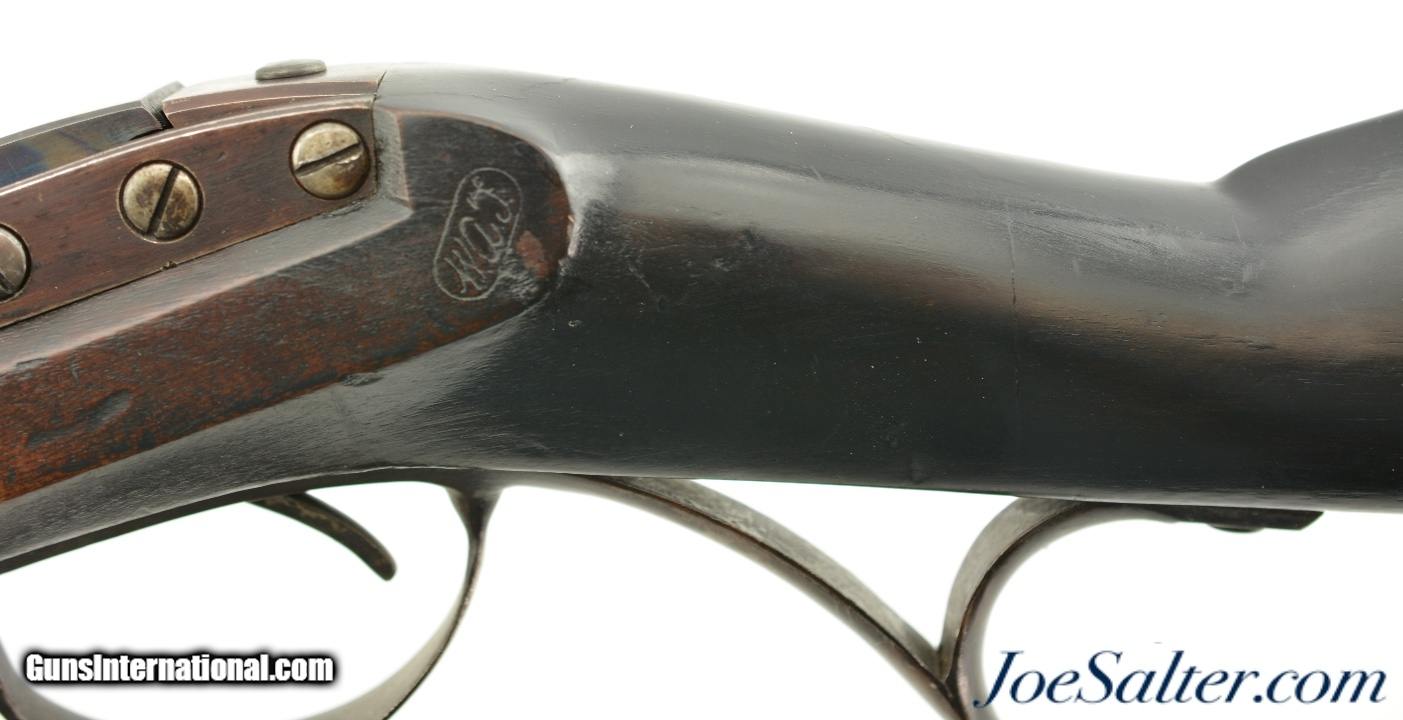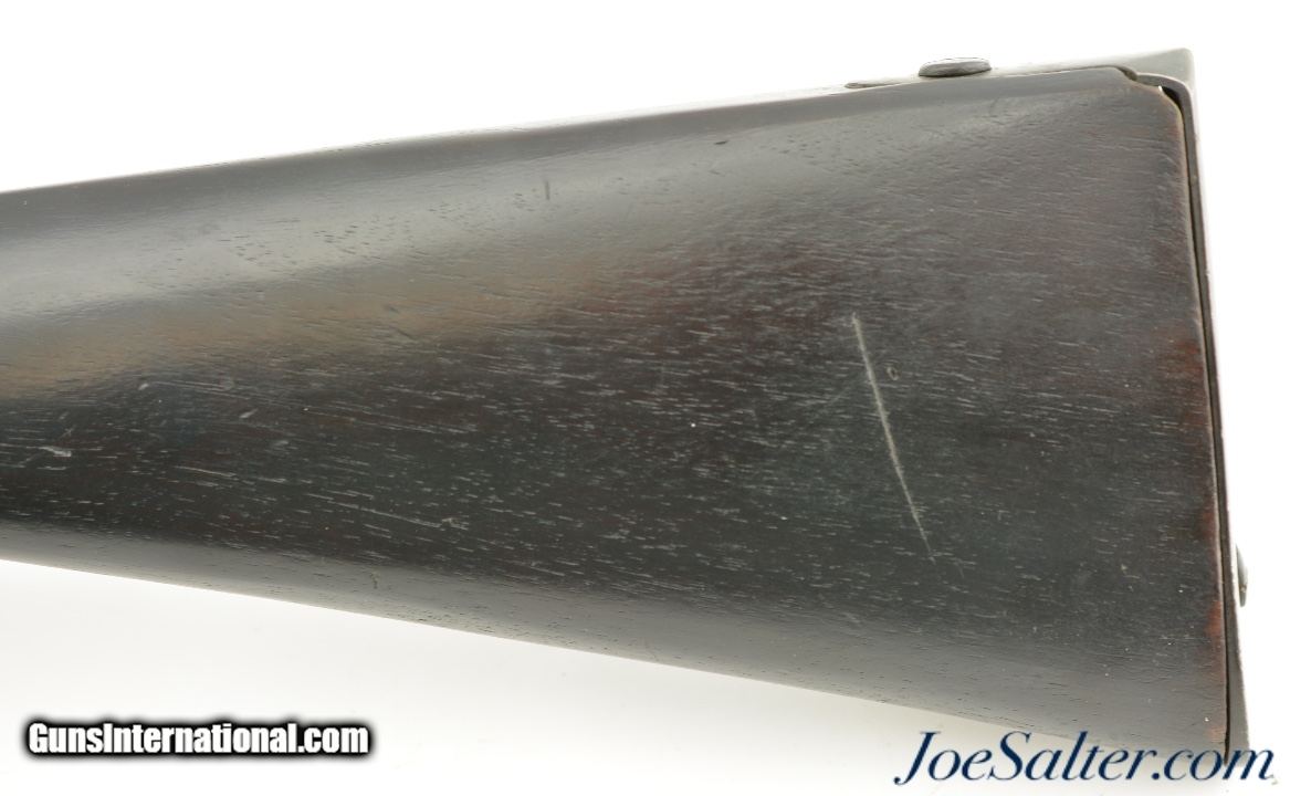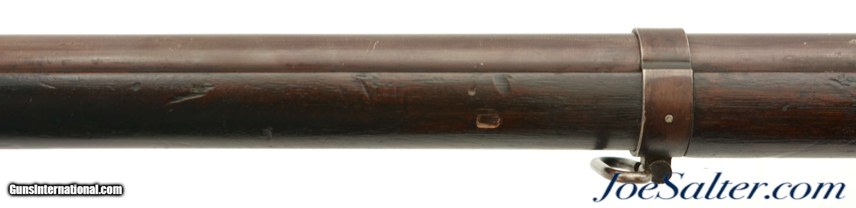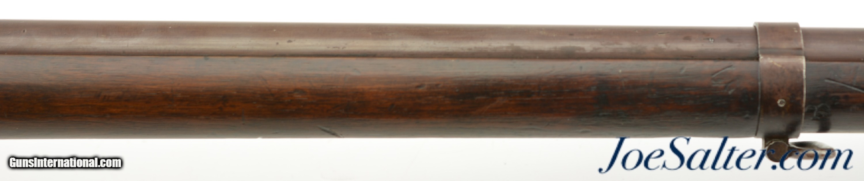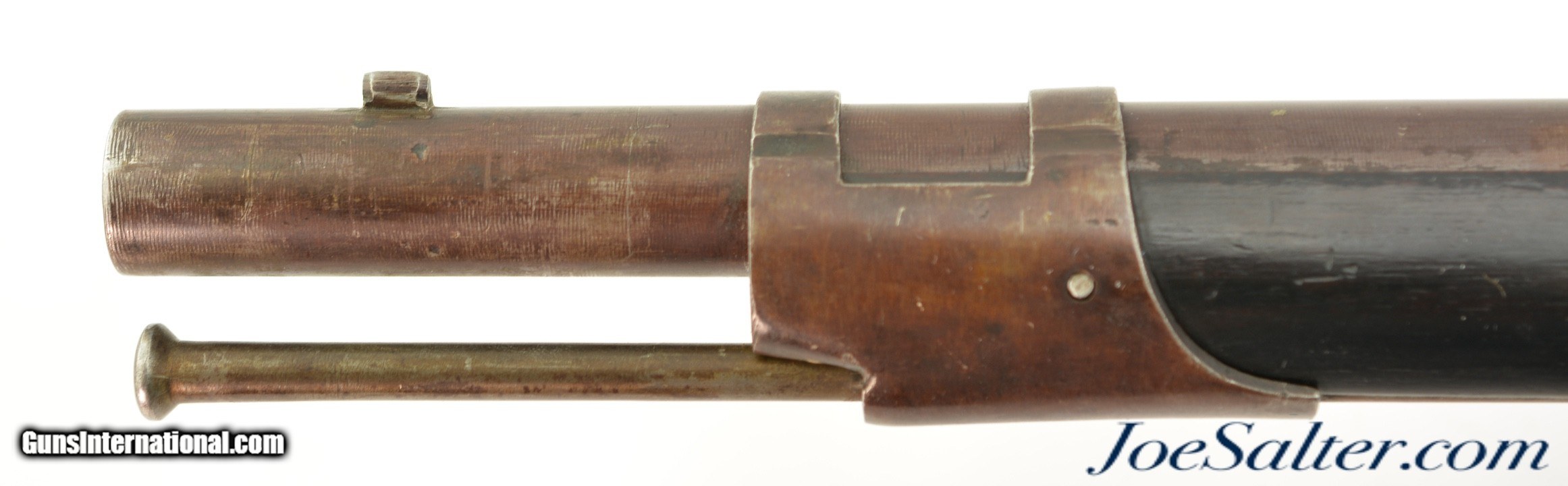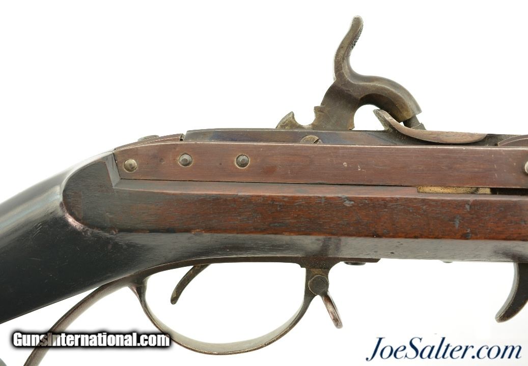 Description: NSN, .52 Caliber, 32 1/2" barrel with an excellent, bright bore. This is a very handsome rifle that has an 1832-dated breech piece that has about 60-65% of a lustrous blue finish applied during the conversion to percussion, and pale gray on the balance. The barrel and other metal components retain 75-80% of the original browned finish, with silvering and mild gray fading at the muzzle, as well as along the high edges and projections. The walnut stock is in fine shape with some minor handling marks and small blemishes scattered about the otherwise fine added military oil finish. A barely visible arsenal repair is present on the top of the wrist where it meets the breech piece (a commonly encountered repair). The "WAT" (William A. Thornton) inspector cartouche is crisp and clear on the left side ahead of the wrist, and an "IX P" conversion mark is present on the inside of the buttplate. The breech locks firmly, and the action functions flawlessly, and the original metal ramrod is included. This is a splendid example of an arsenal-converted Hall that would be very difficult to upgrade. Antique; Antique: Yes Price: $4,995.00 Contact Seller |