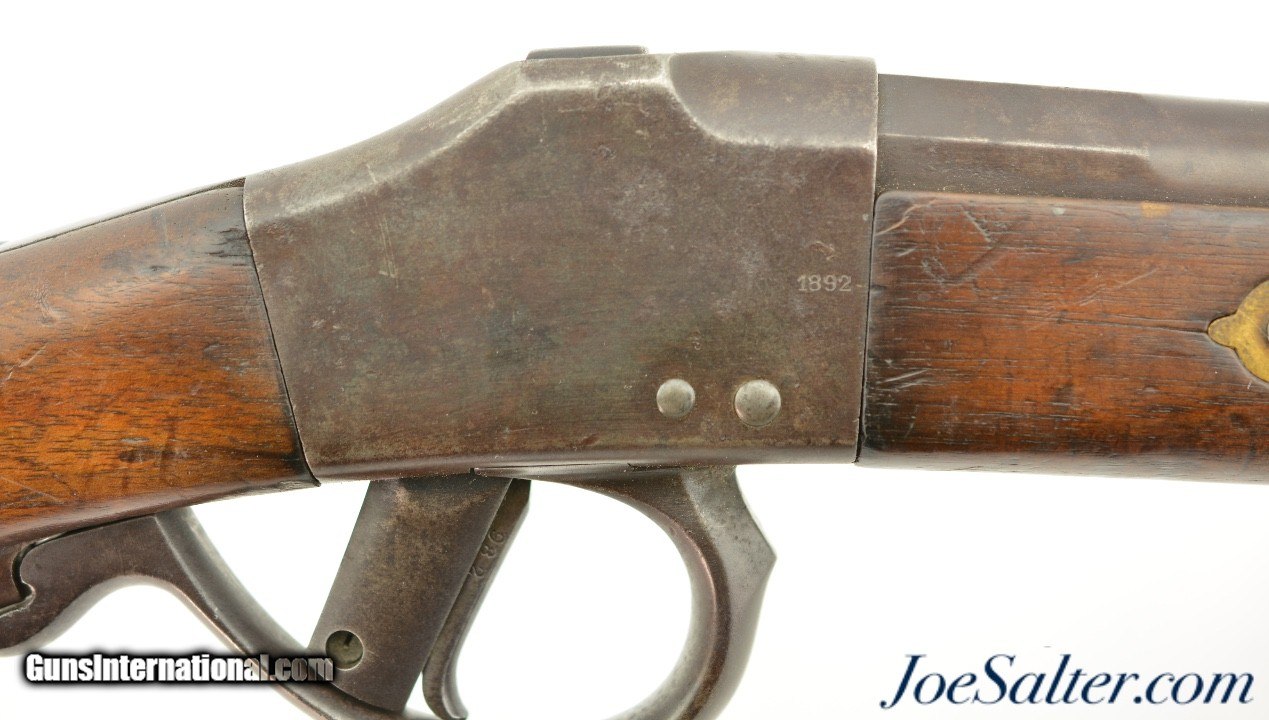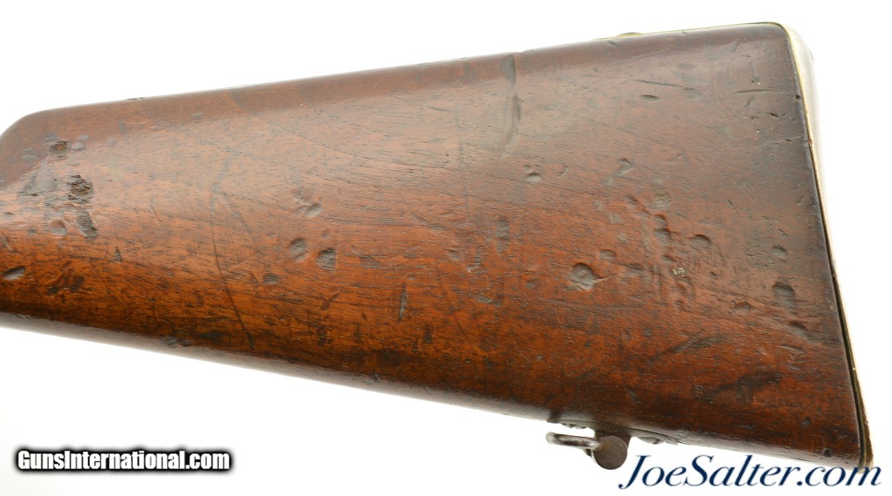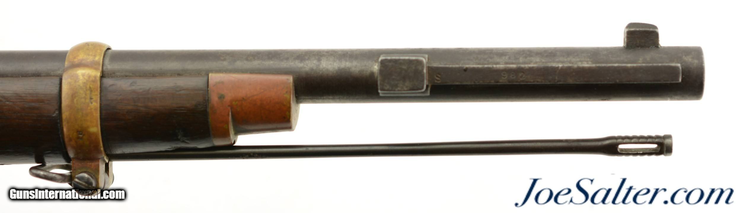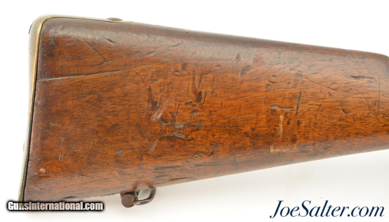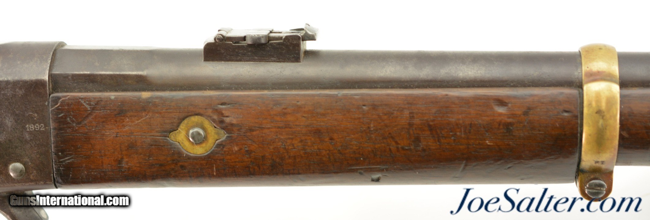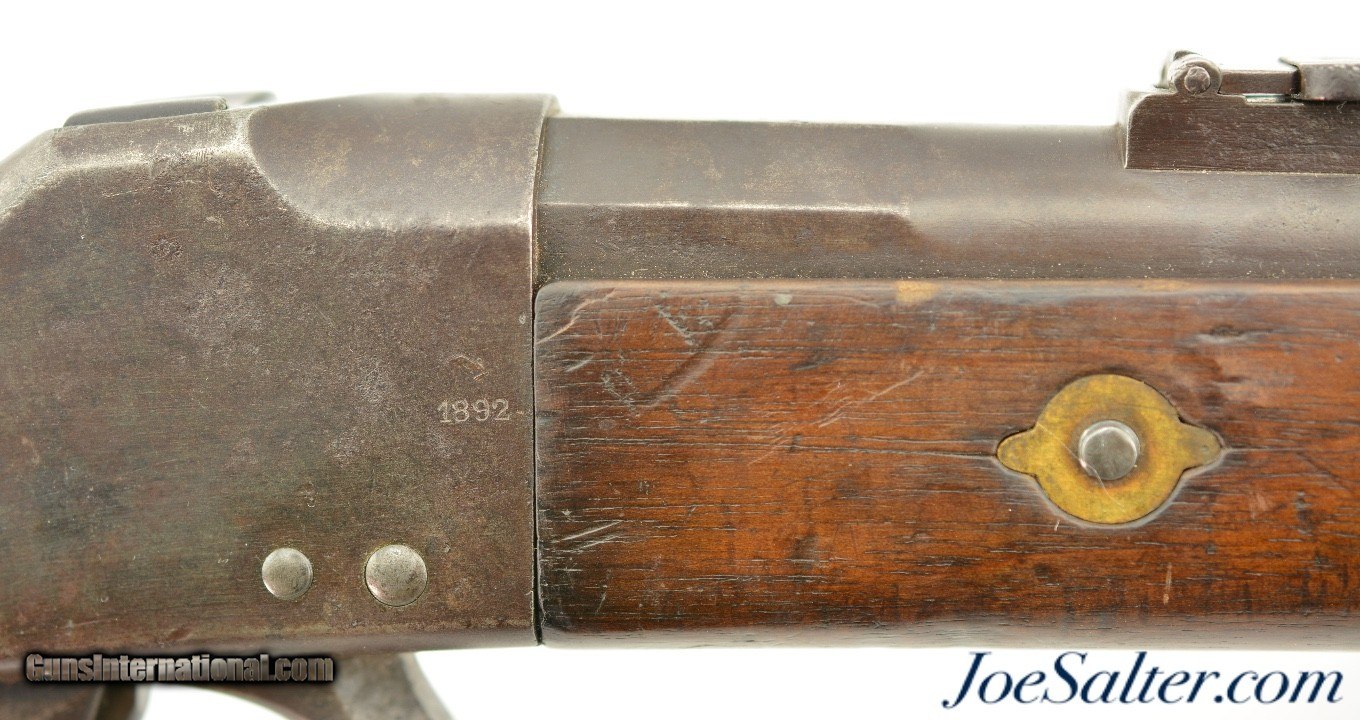 Description: Serial #982, 11 x 43Rmm Brazilian, 23 1/4" barrel with a very good, bright bore that has some minor freckling within the grooves. This is an 1892-dated carbine, that has all matching numbers, and an "EM a L NAGANT / A LIEGE" maker’s mark on the left side of the frame. The barrel has an overall smooth plum-brown patina with gray fading along the high and exposed edges, as well as scattered spots of dark brown freckling throughout. The action has a plum-brown patina mixing with gray, and has some traces of the original finish remaining on the sides of the breechblock on the inside. The walnut forend and buttstock are in good plus condition with numerous handling marks and blemishes scattered throughout under a thick added varnish finish. The action is fully functional and locks firmly. According to records, there is some question as to whether the Brazilian government ordered 2,000 or 5,000 of these carbines, but arsenal records only confirm receipt of 1,800 examples. Regardless, these are extremely handy and rugged carbines, rarely seen in the US, and this example rates very good plus condition overall. Antique; SOLD |