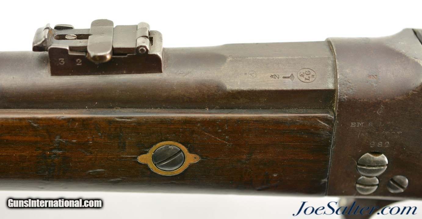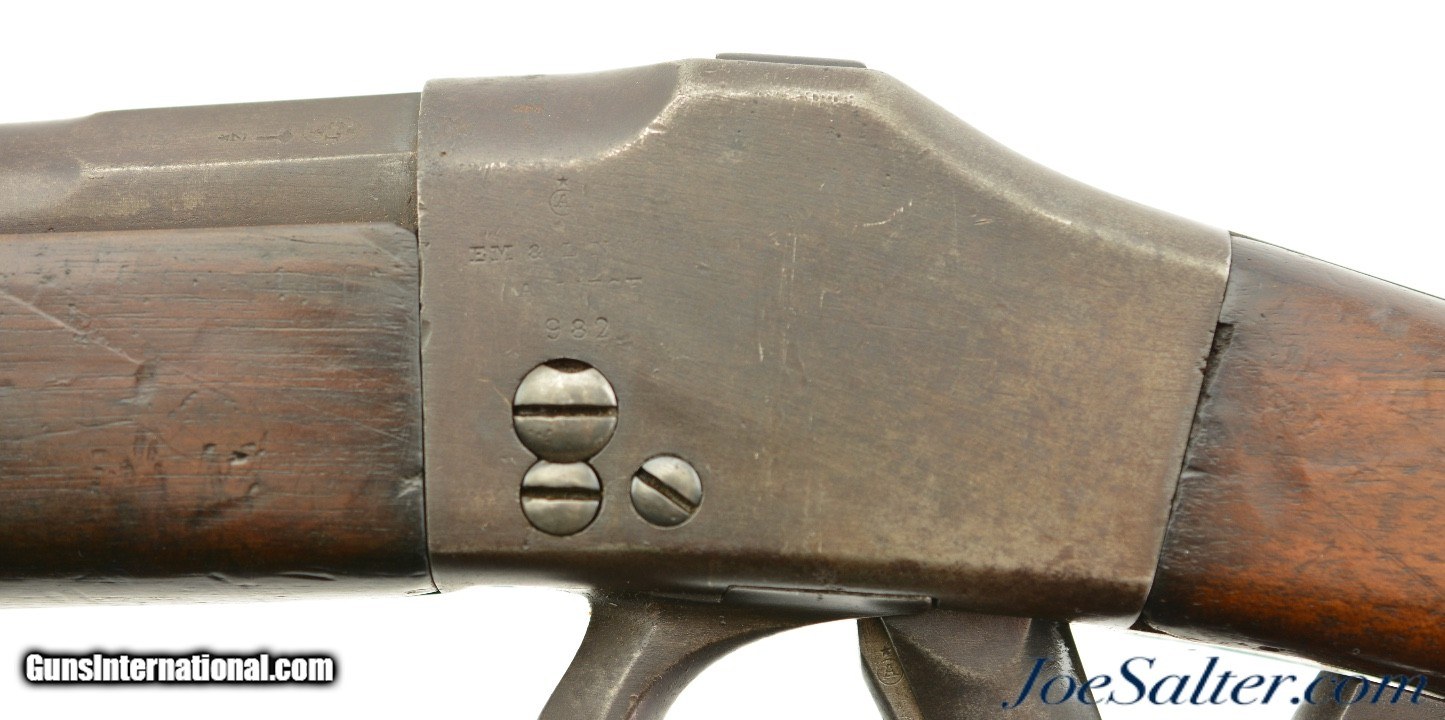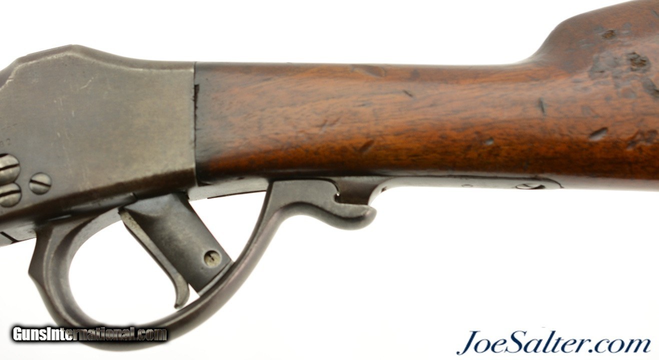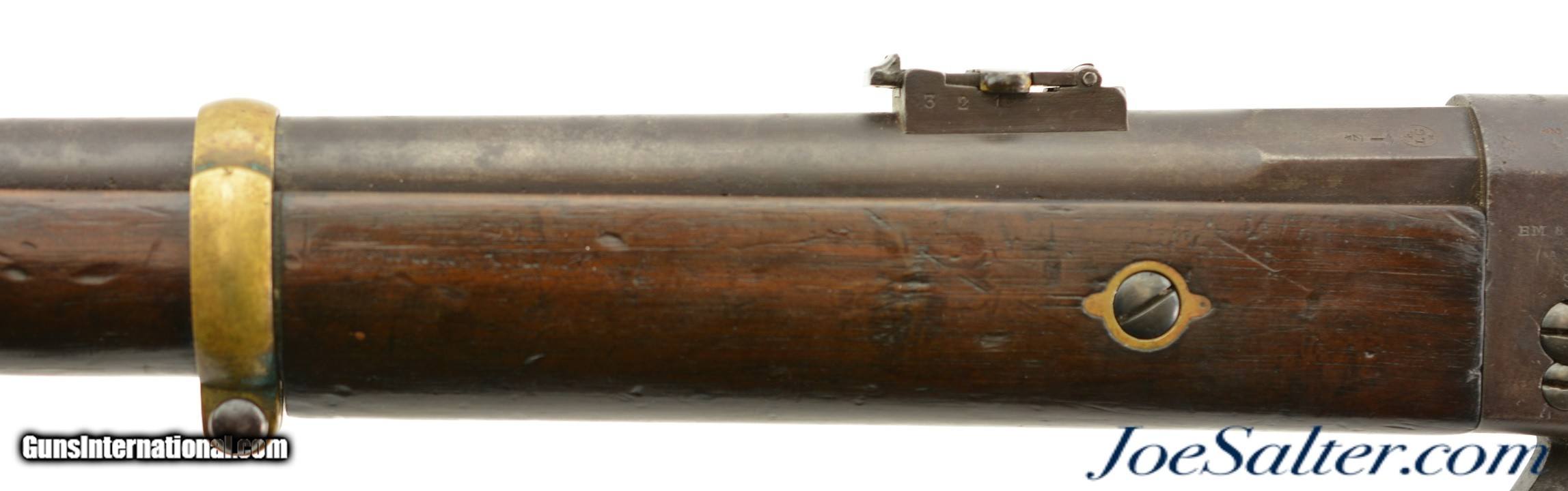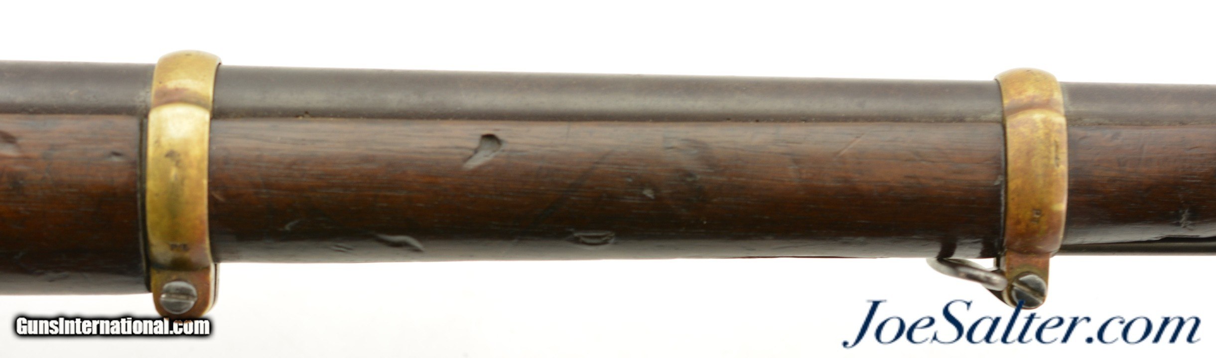 Description: Serial #982, 11 x 43Rmm Brazilian, 23 1/4" barrel with a very good, bright bore that has some minor freckling within the grooves. This is an 1892-dated carbine, that has all matching numbers, and an "EM a L NAGANT / A LIEGE" maker’s mark on the left side of the frame. The barrel has an overall smooth plum-brown patina with gray fading along the high and exposed edges, as well as scattered spots of dark brown freckling throughout. The action has a plum-brown patina mixing with gray, and has some traces of the original finish remaining on the sides of the breechblock on the inside. The walnut forend and buttstock are in good plus condition with numerous handling marks and blemishes scattered throughout under a thick added varnish finish. The action is fully functional and locks firmly. According to records, there is some question as to whether the Brazilian government ordered 2,000 or 5,000 of these carbines, but arsenal records only confirm receipt of 1,800 examples. Regardless, these are extremely handy and rugged carbines, rarely seen in the US, and this example rates very good plus condition overall. Antique; SOLD |